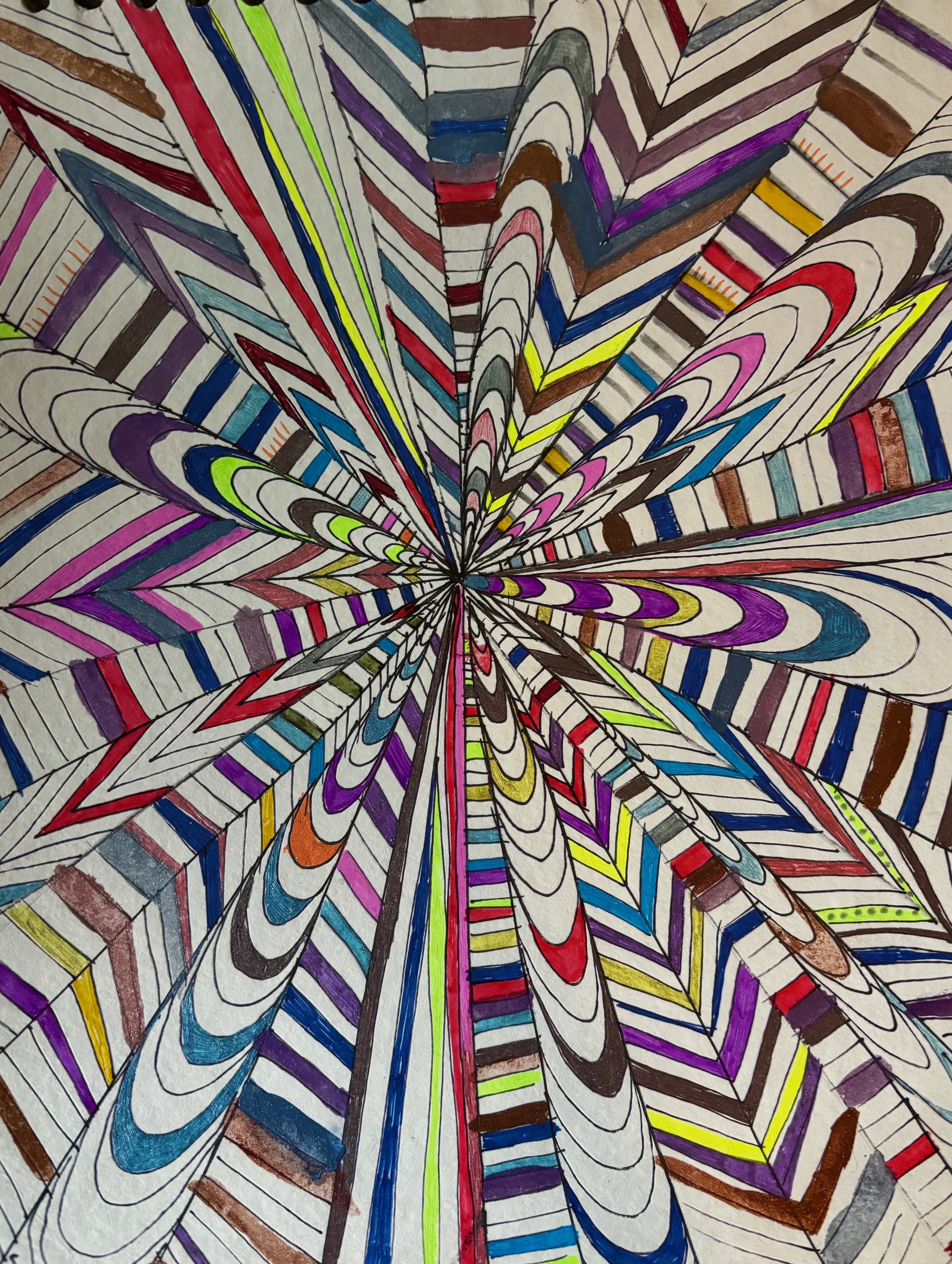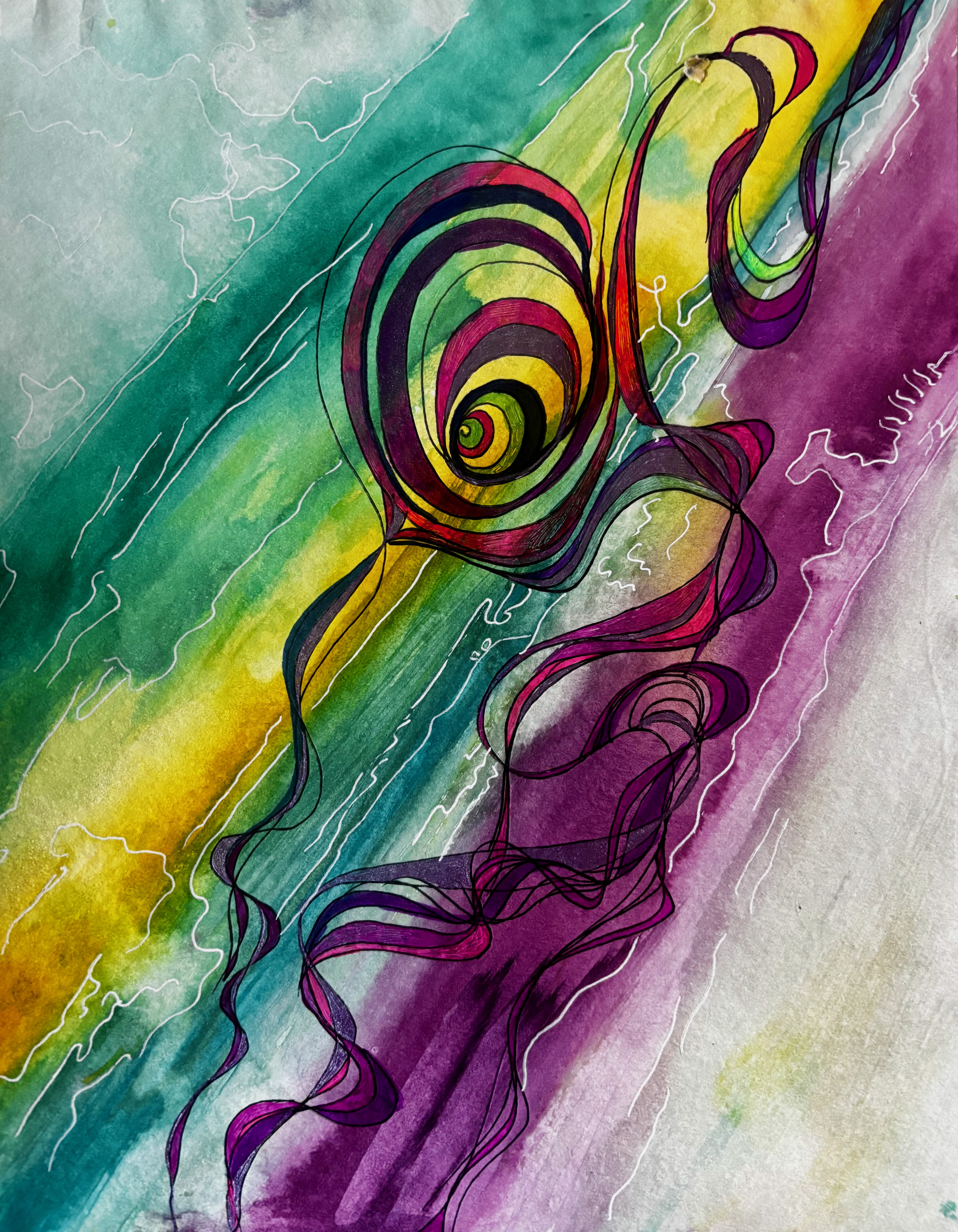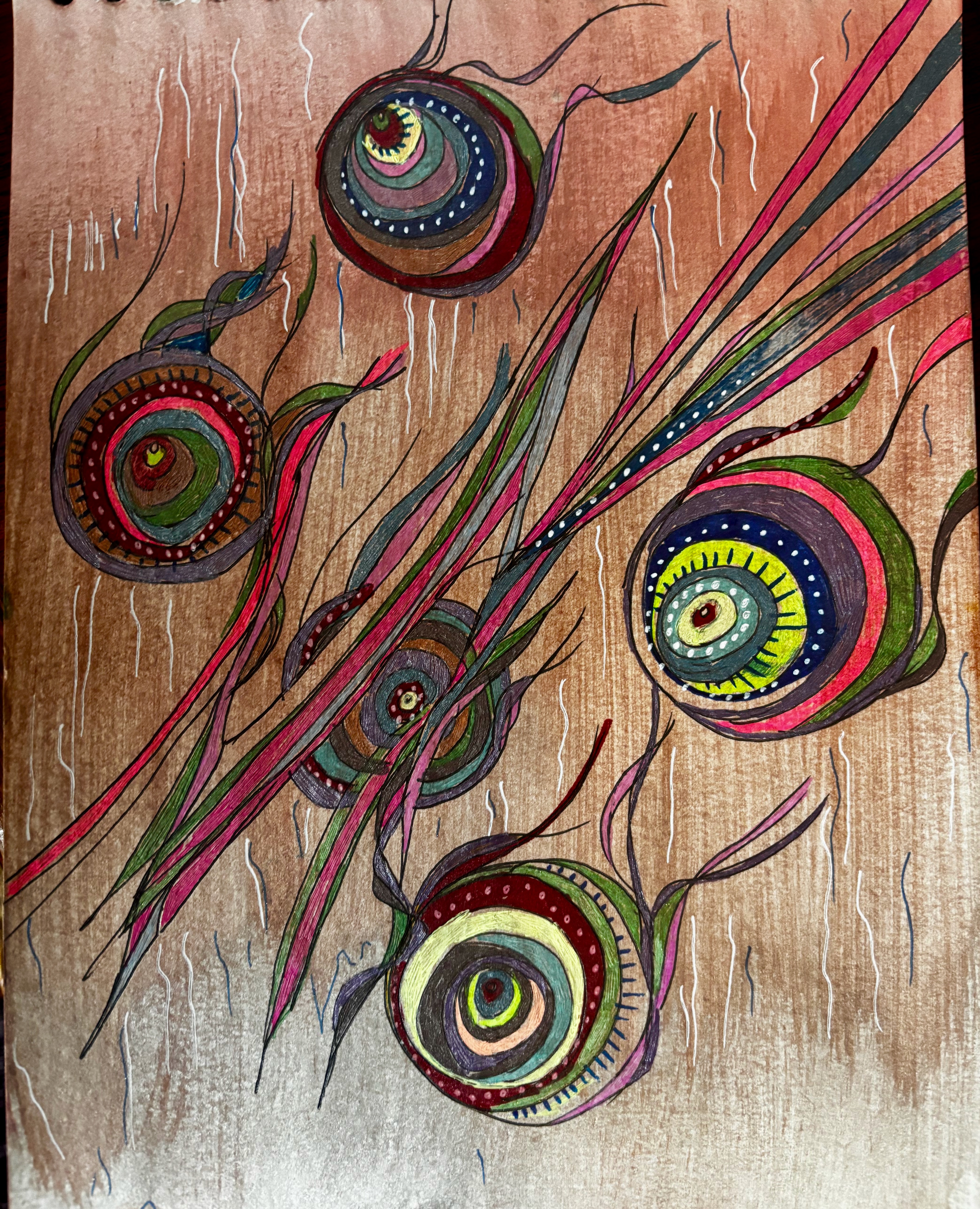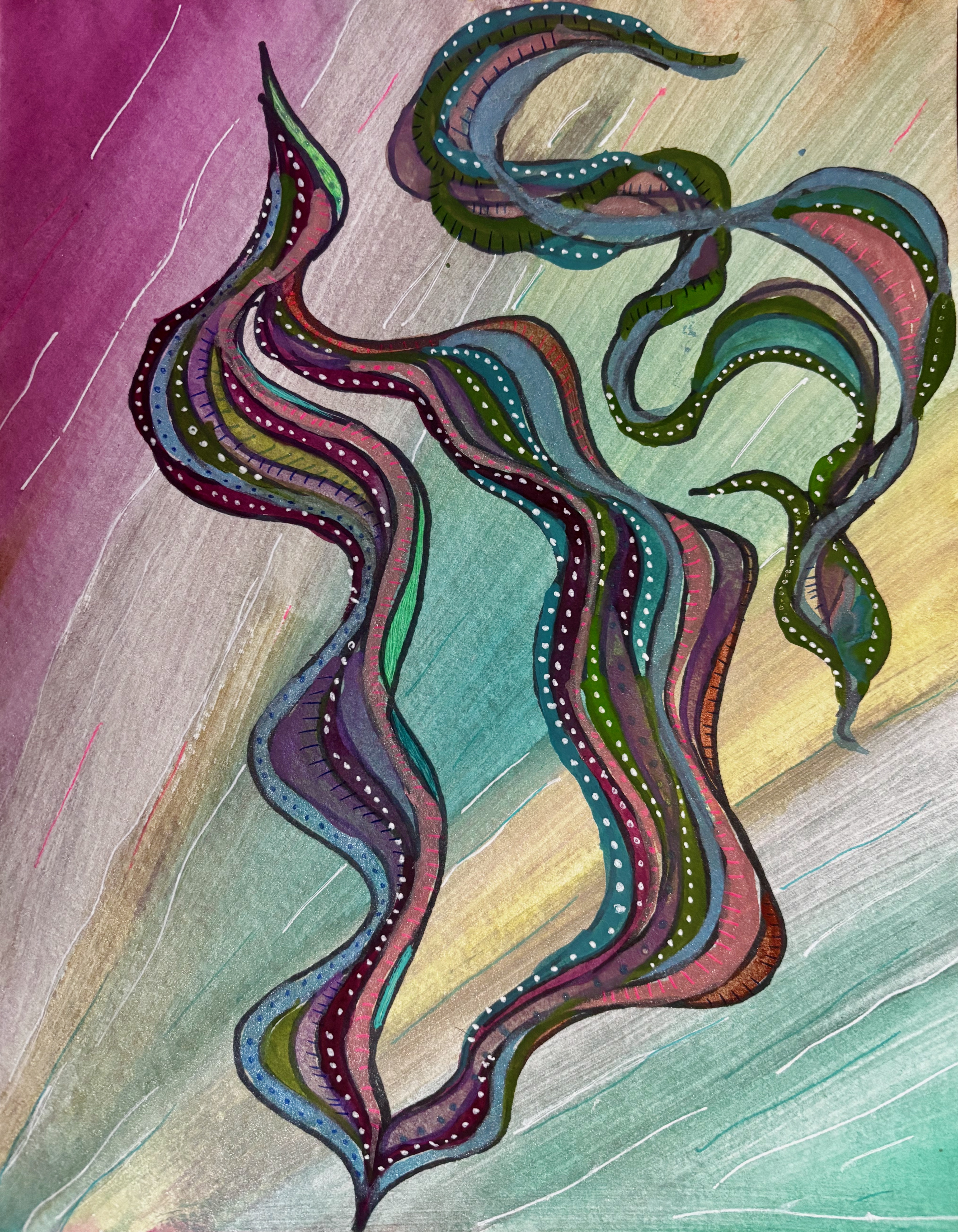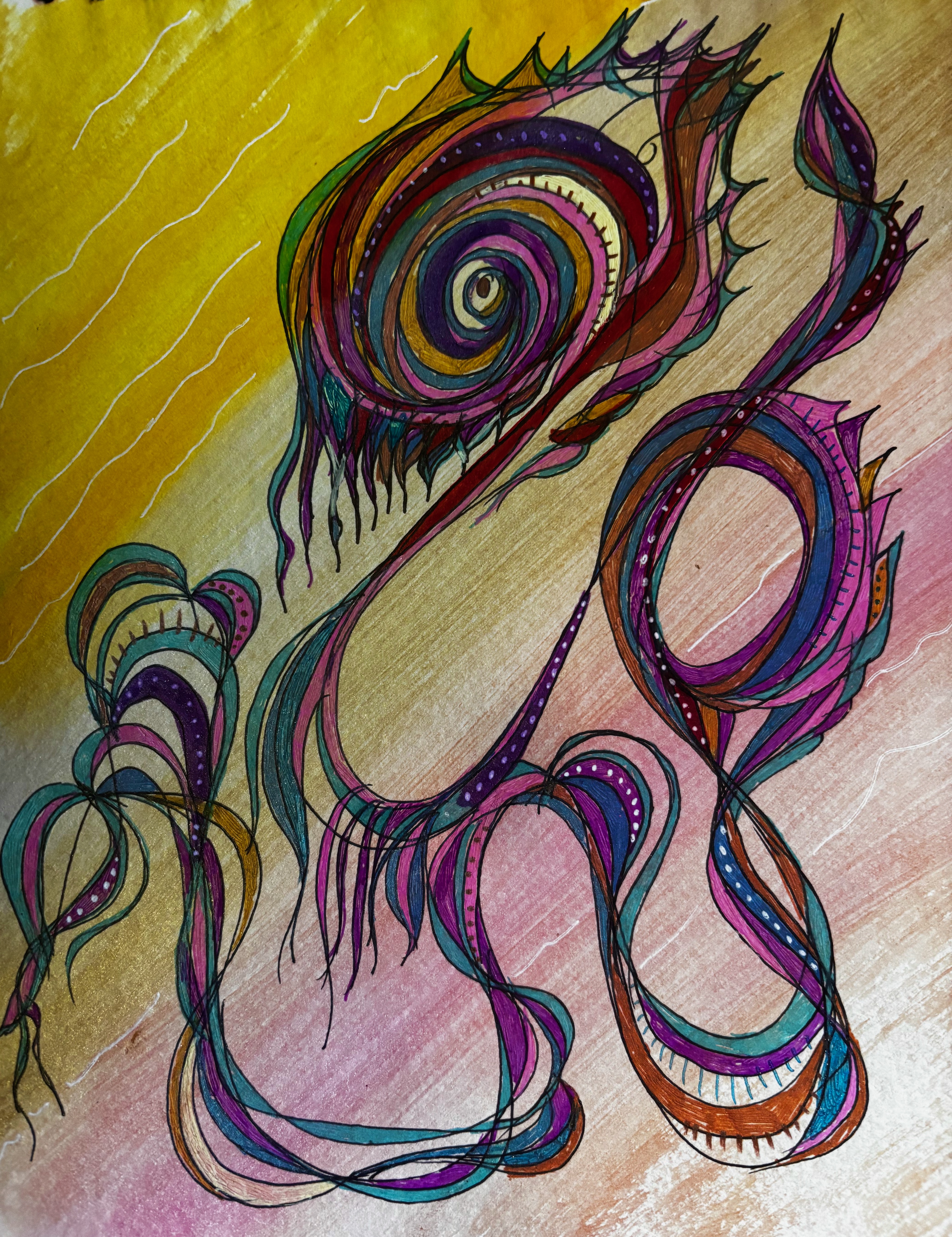 My drawing, painting, and sewing are the result of a daily practice of improvisational drawing. A mediation on emotion, the images aresomatic visualization of feeling states as they emerge in my awareness.