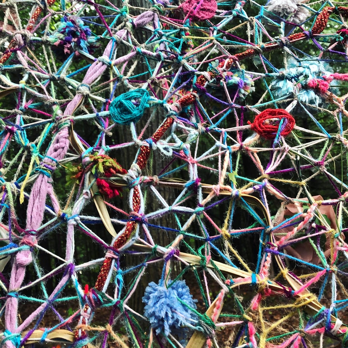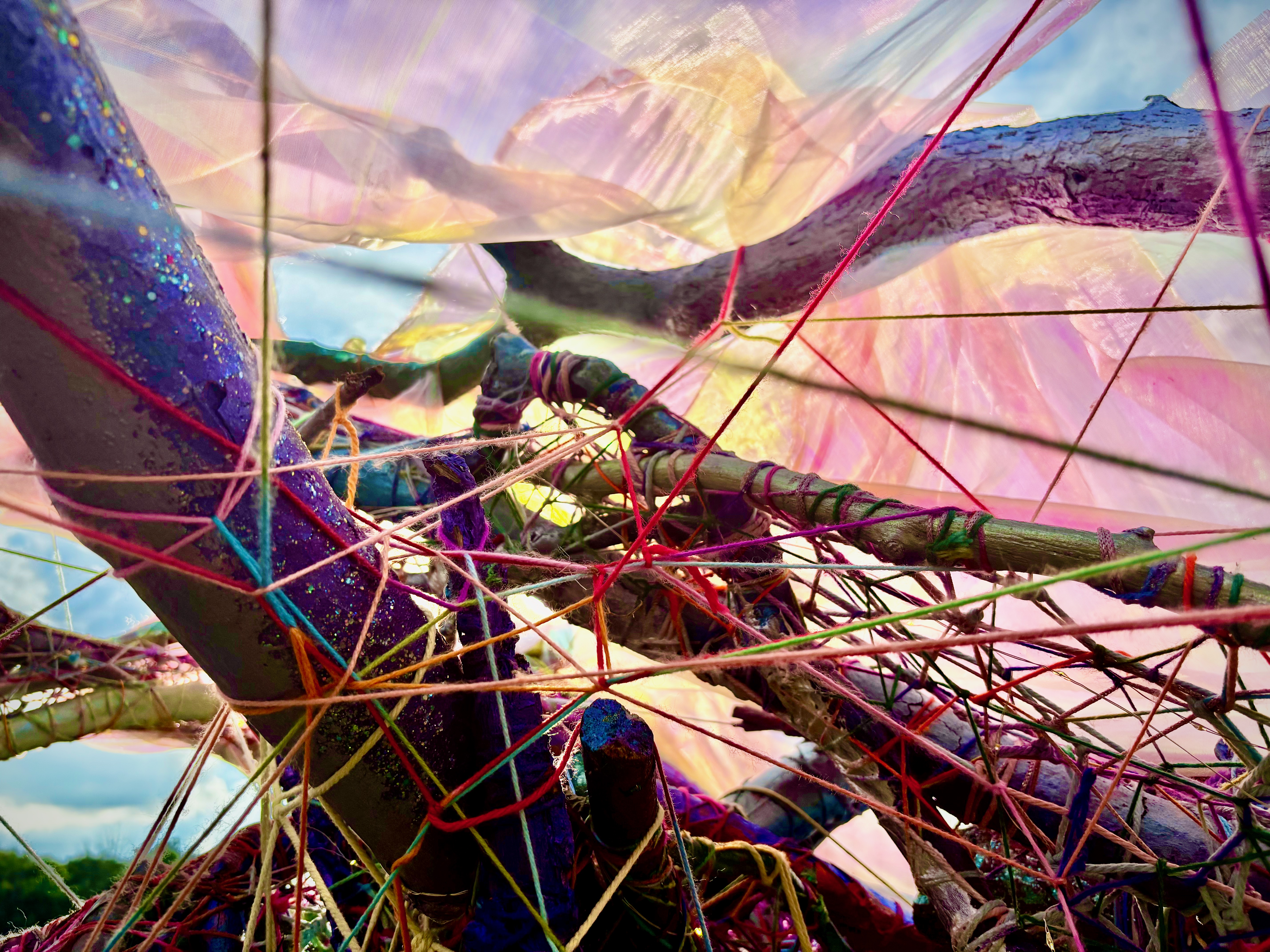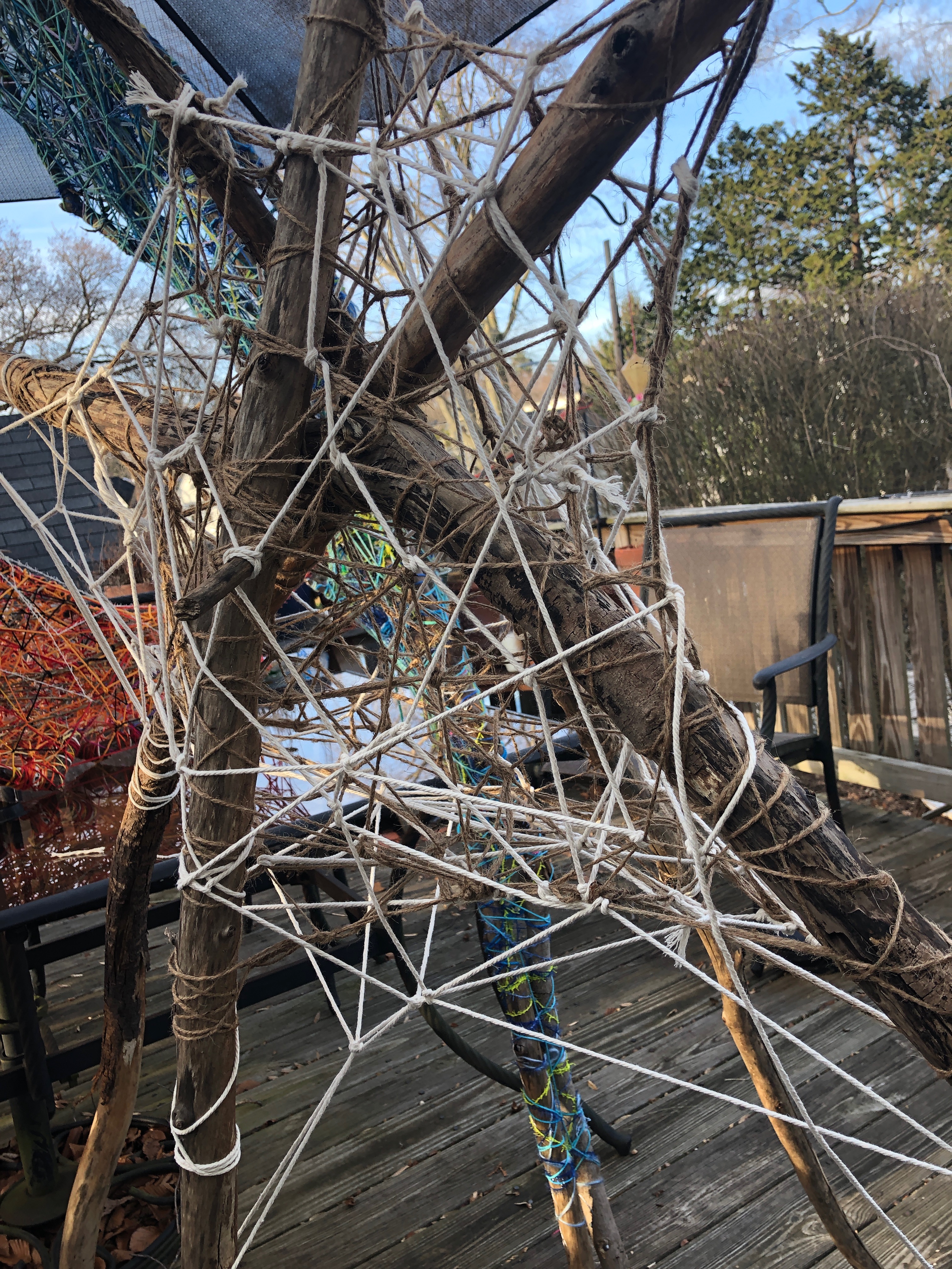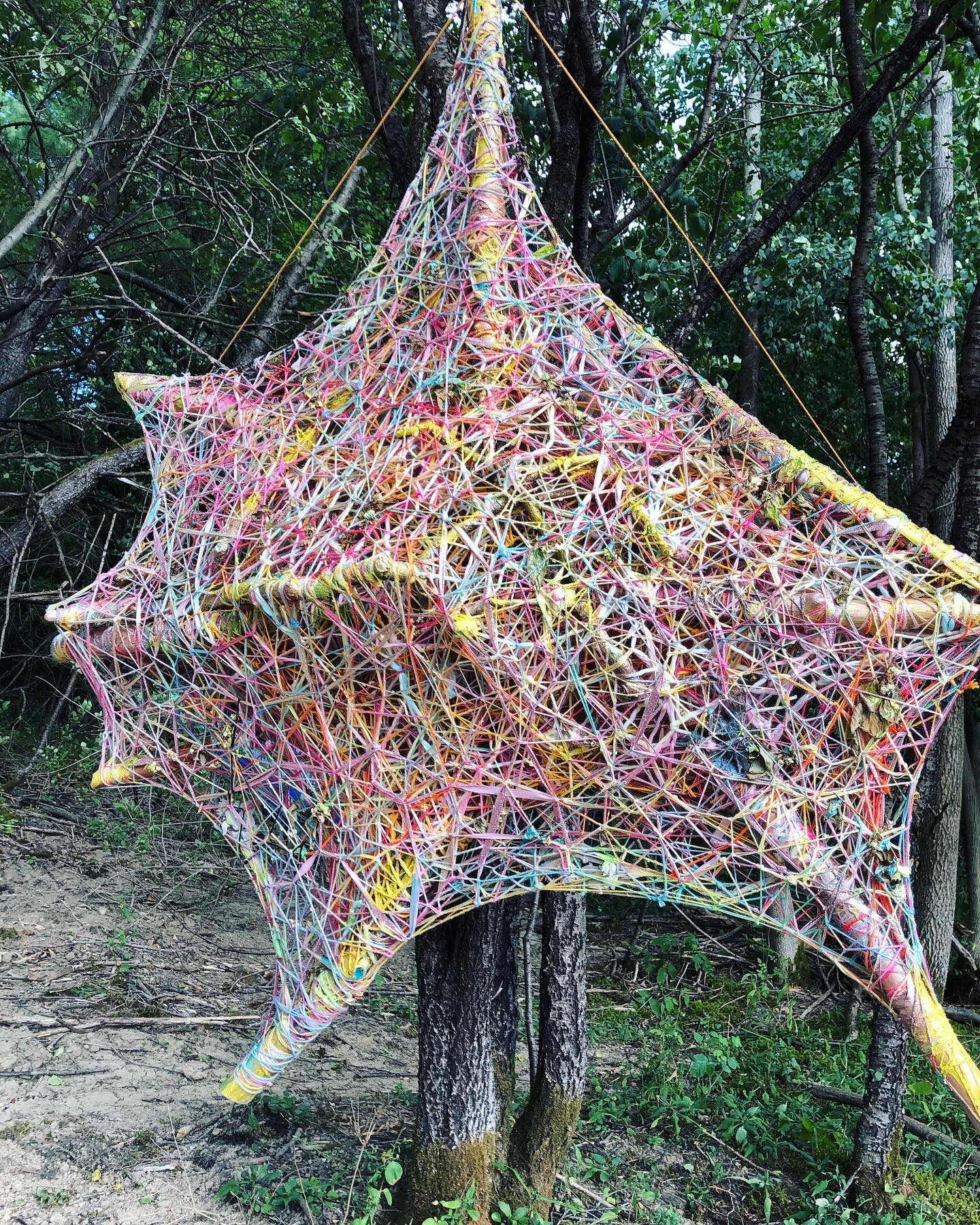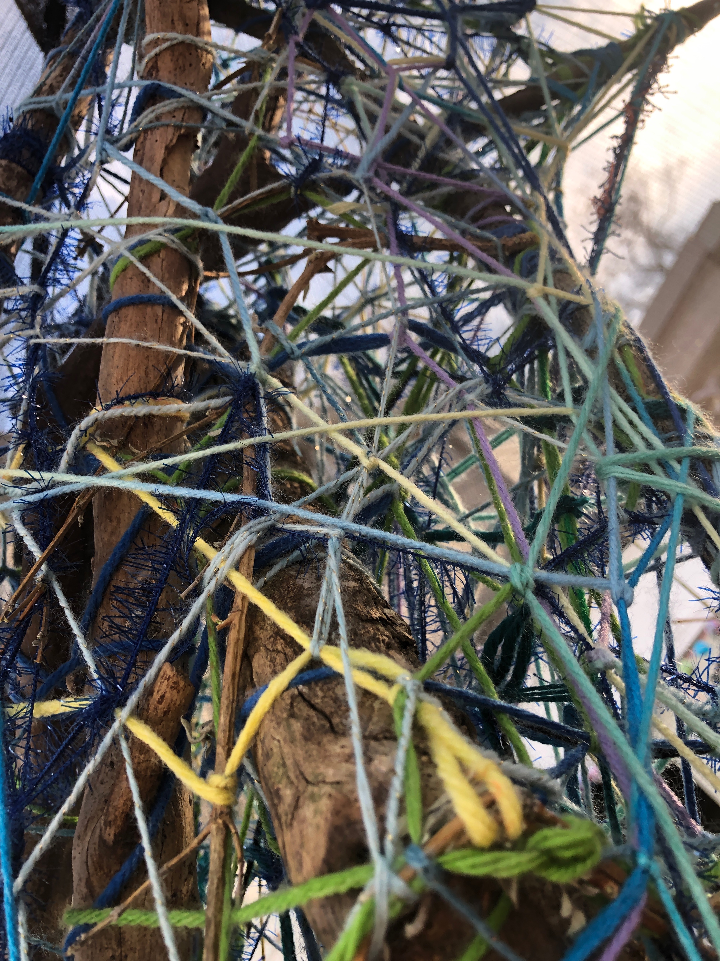 Refugia is an installation built from modular art objects created with fallen branches bound together with rope and yarn. The structure of the installation makes a welcoming and protective space people can enter and pass through, integrating more fully with their environment and themselves. An inquiry into dynamic balance and non-Euclidian building architecture, the installation process uses minimal tools, gravity and no electricity. Refugia is shelter intended to draw viewers into and around its interior and exterior spaces, creating possibilities for refuge and reorientation.