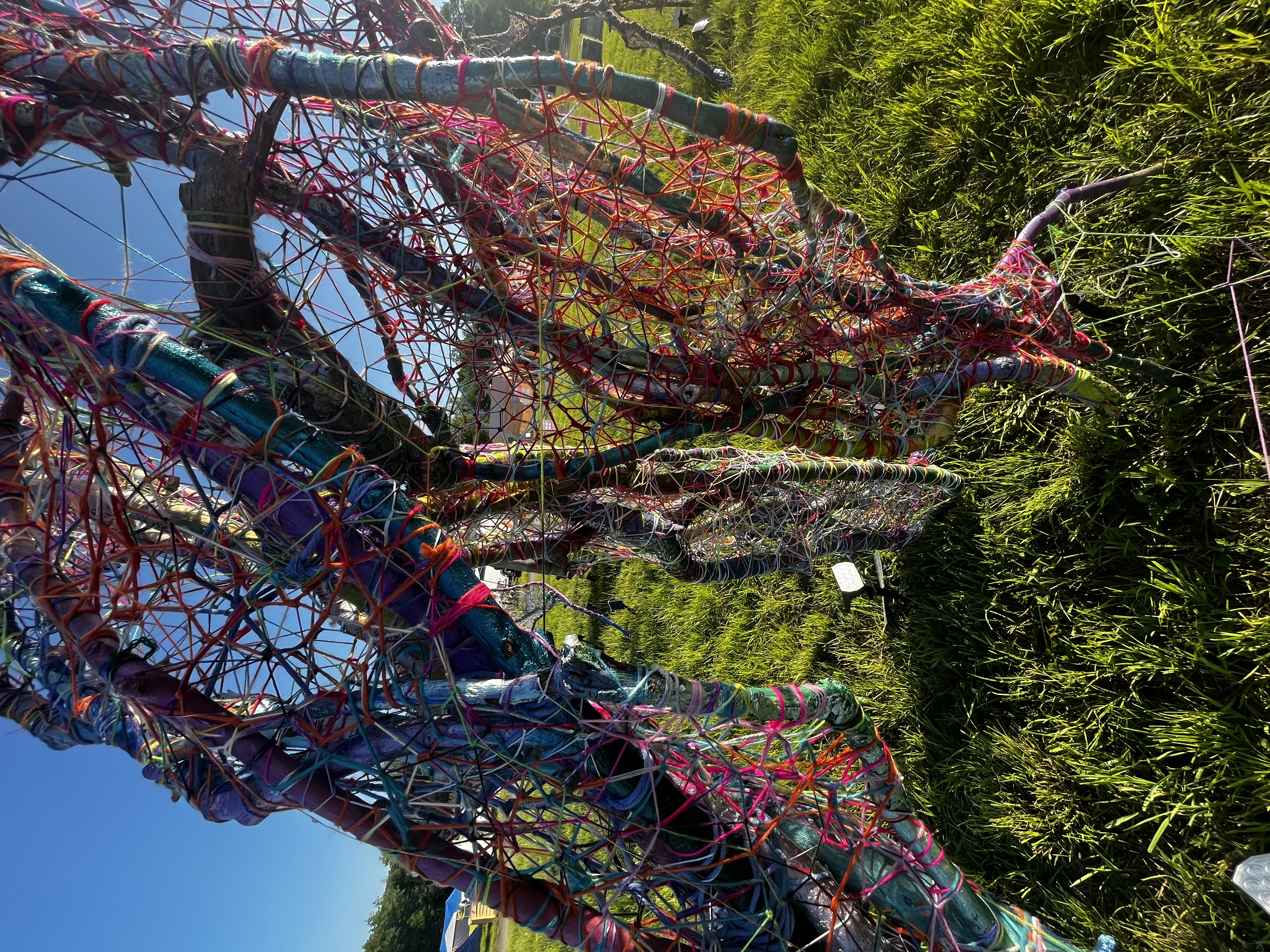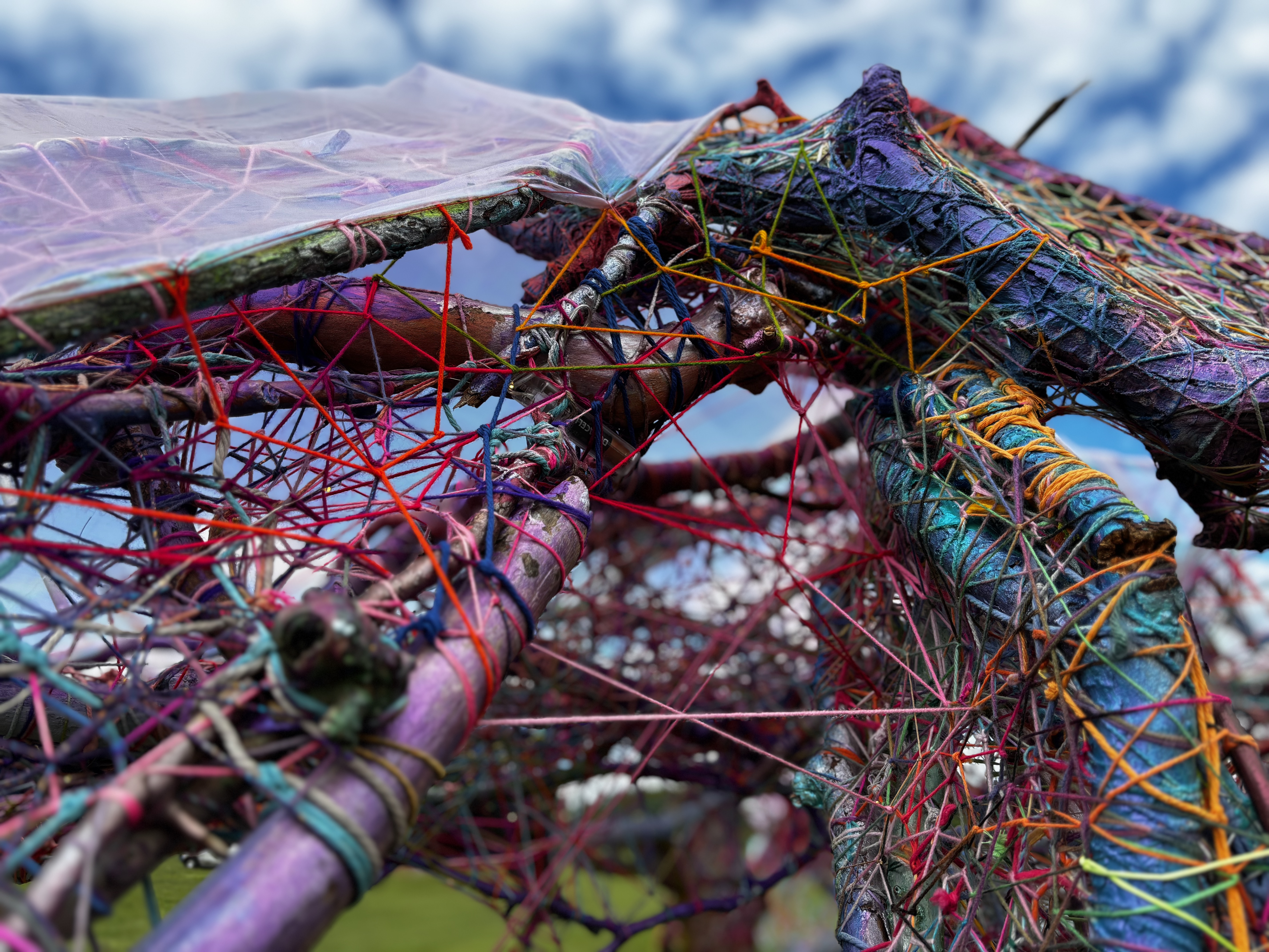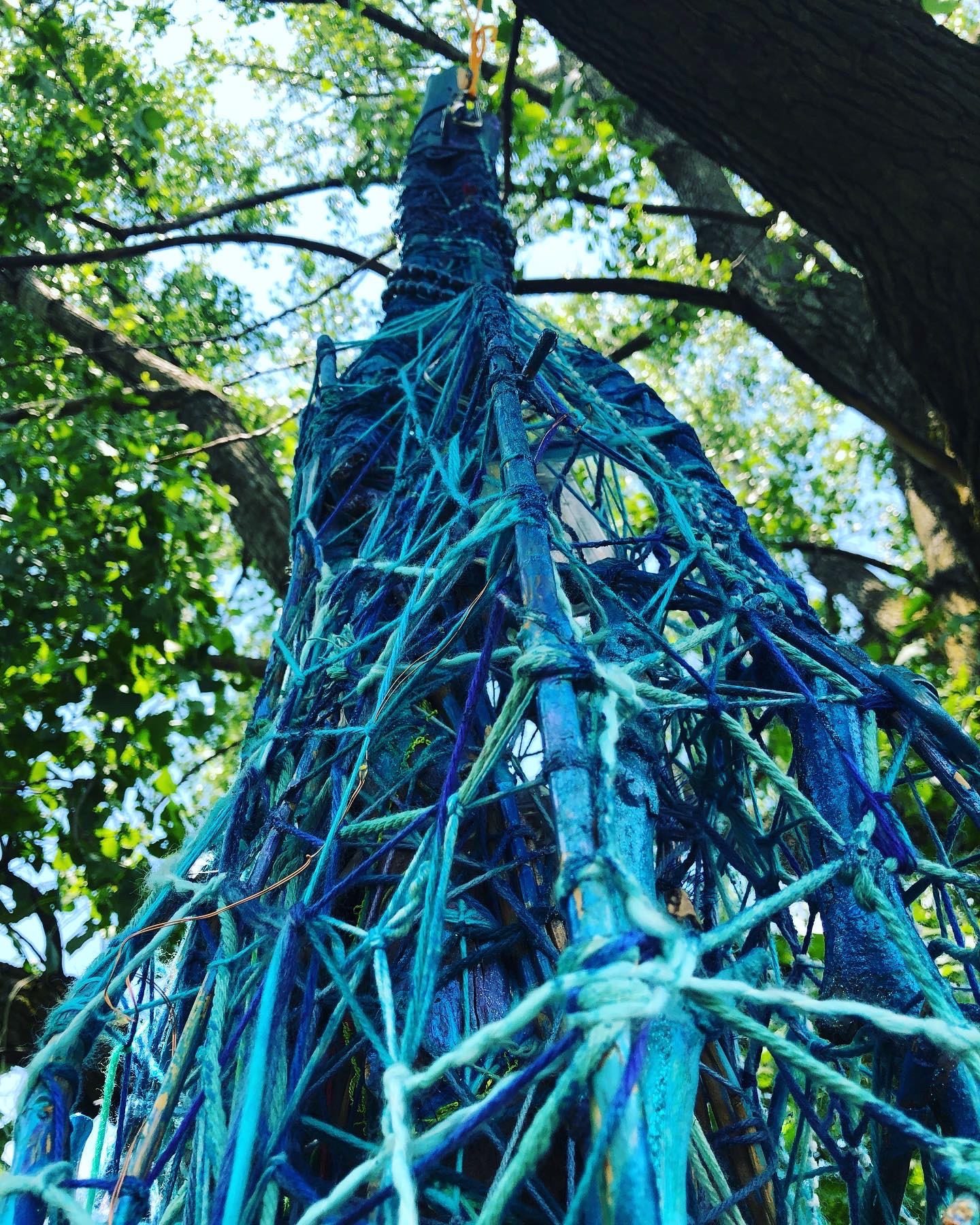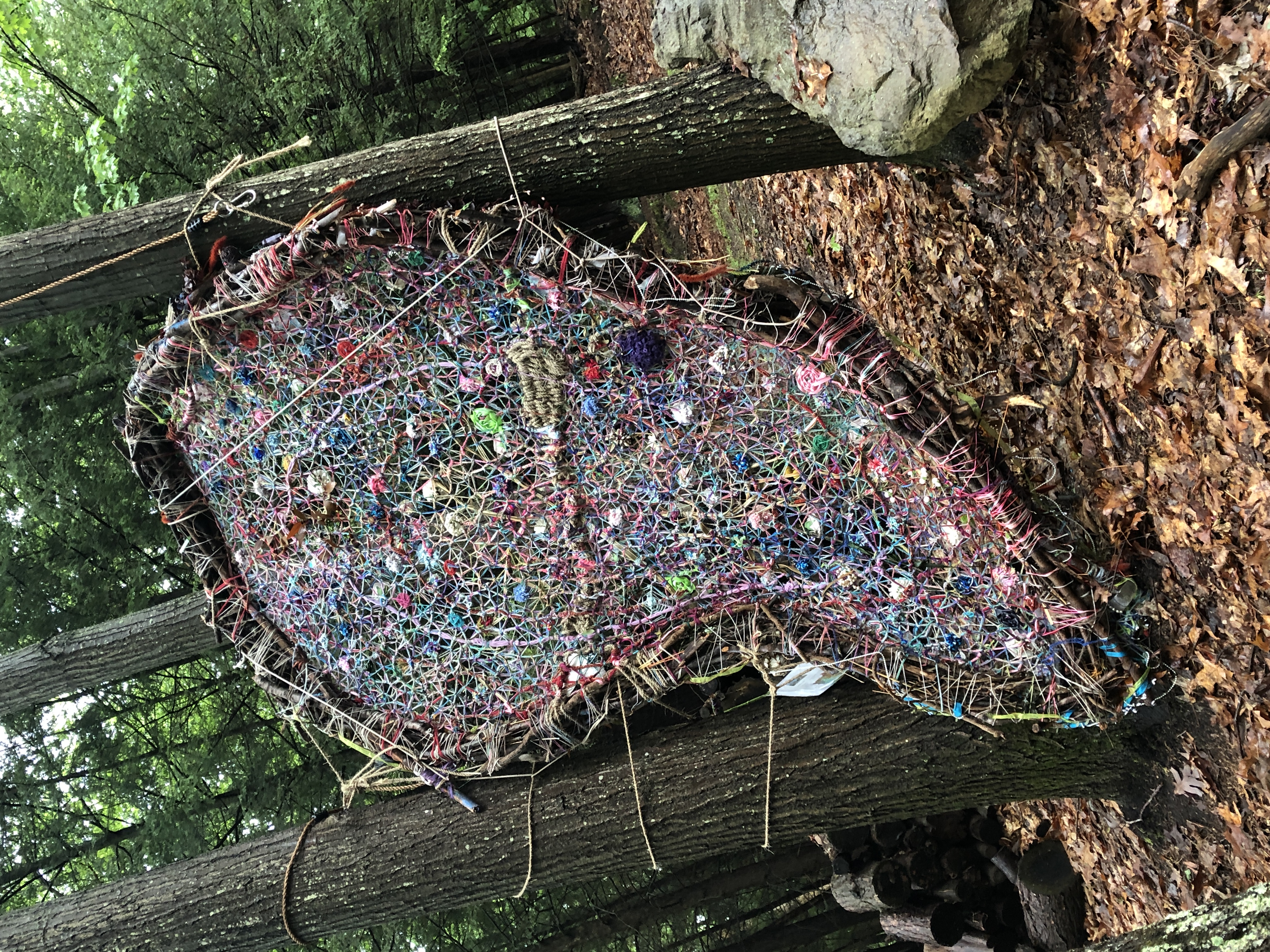 Refugia is an installation built from modular art objects created with fallen branches bound together with rope and yarn. The structure of the installation makes a welcoming and protective space people can enter and pass through, integrating more fully with their environment and themselves. An inquiry into dynamic balance and non-Euclidian building architecture, the installation process uses minimal tools, gravity and no electricity. Refugia is shelter intended to draw viewers into and around its interior and exterior spaces, creating possibilities for refuge and reorientation.