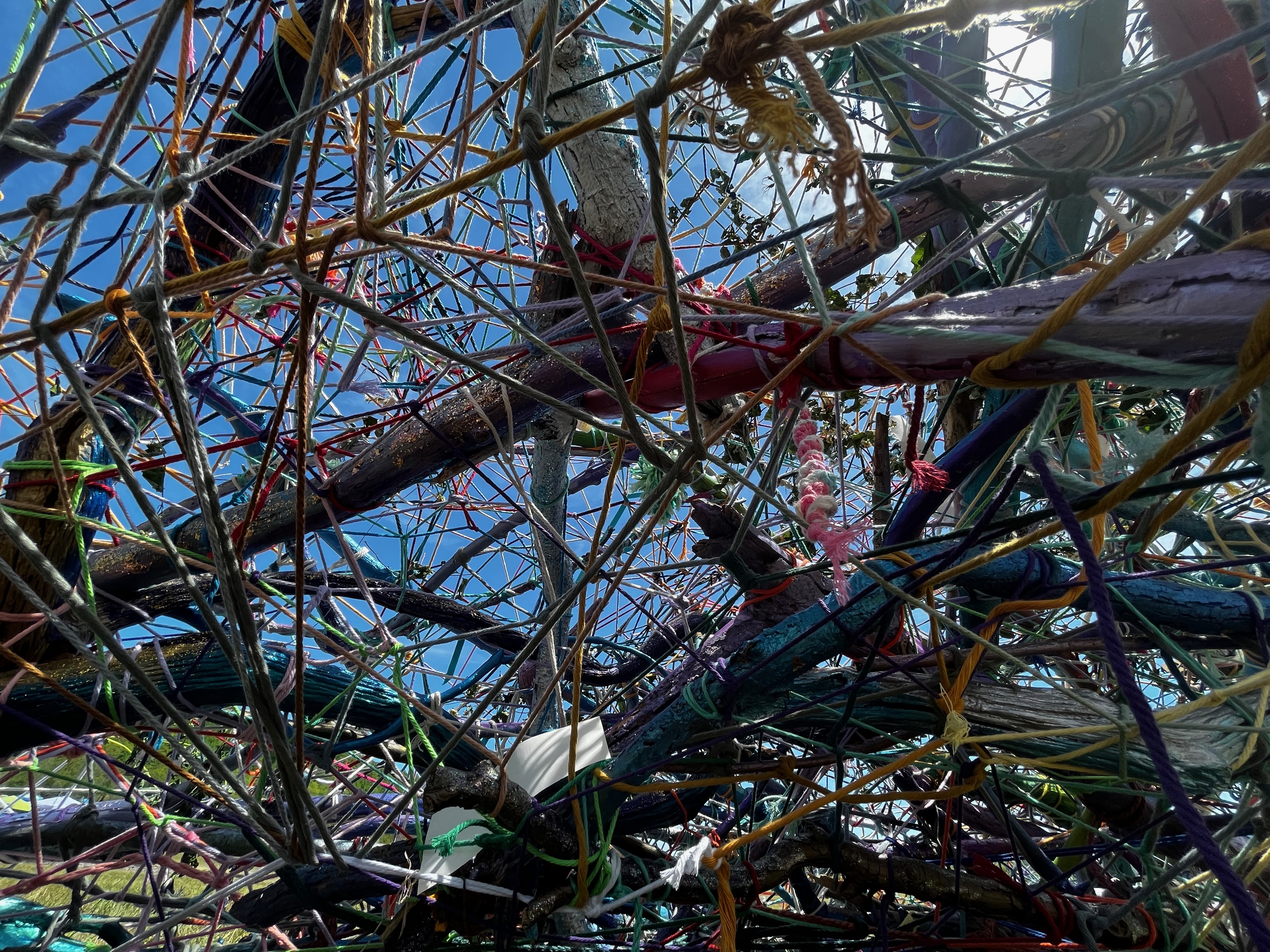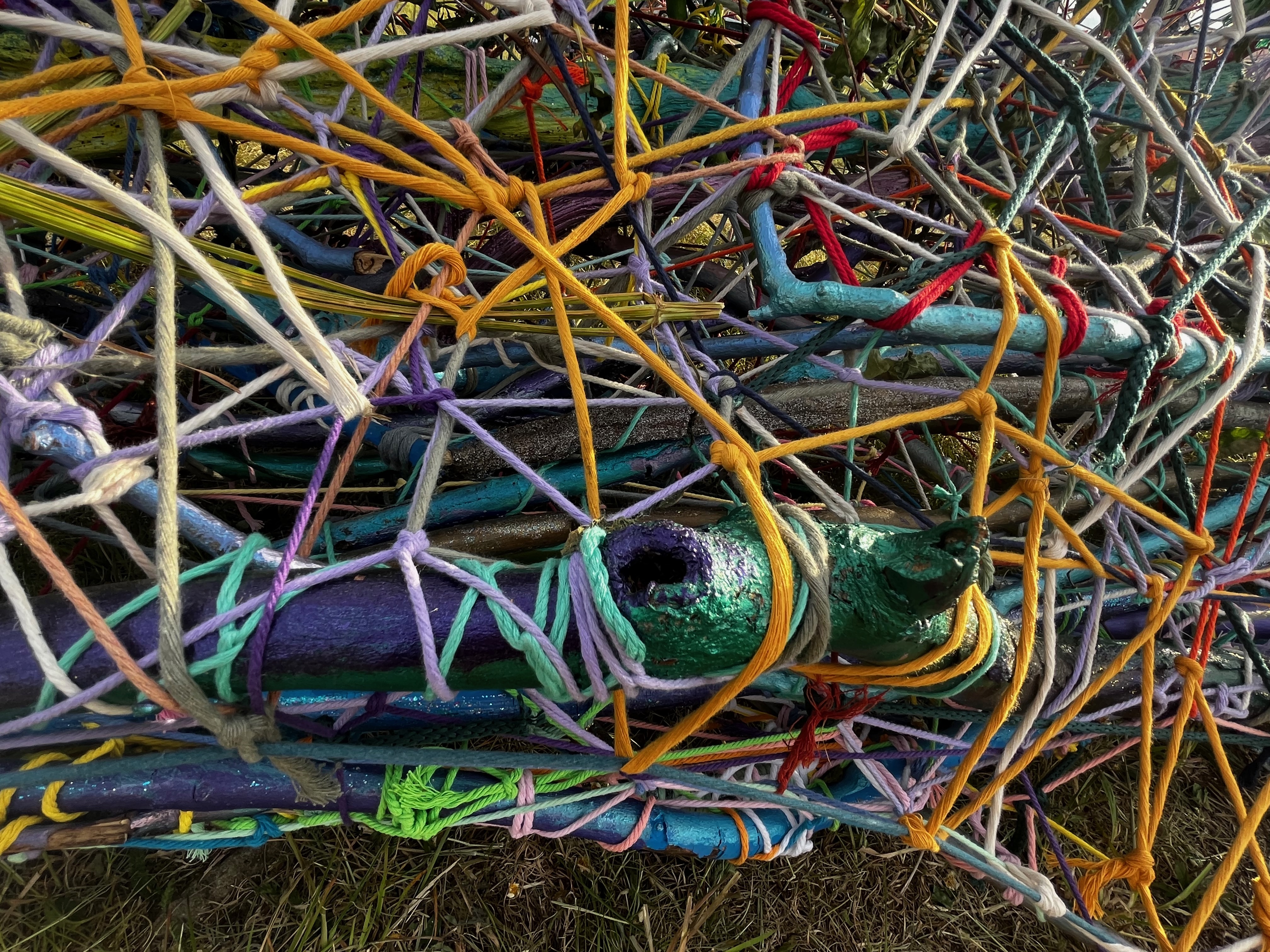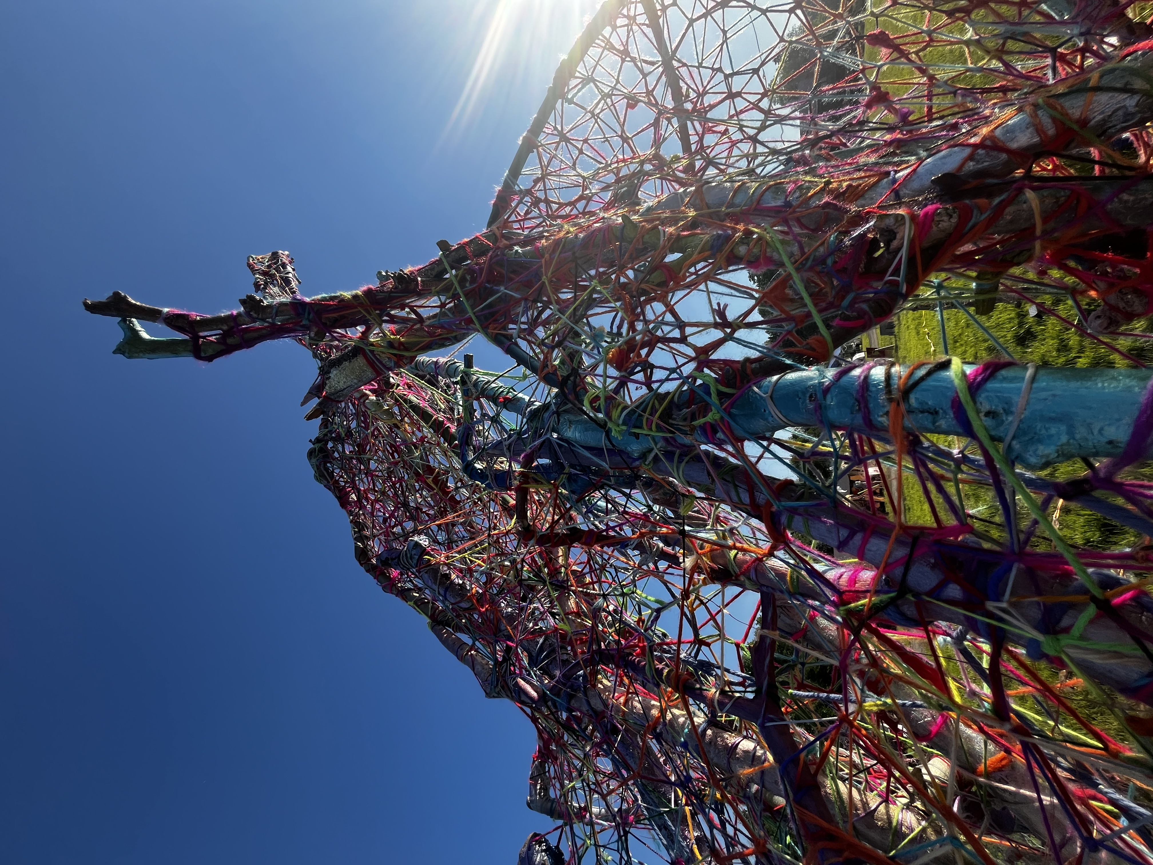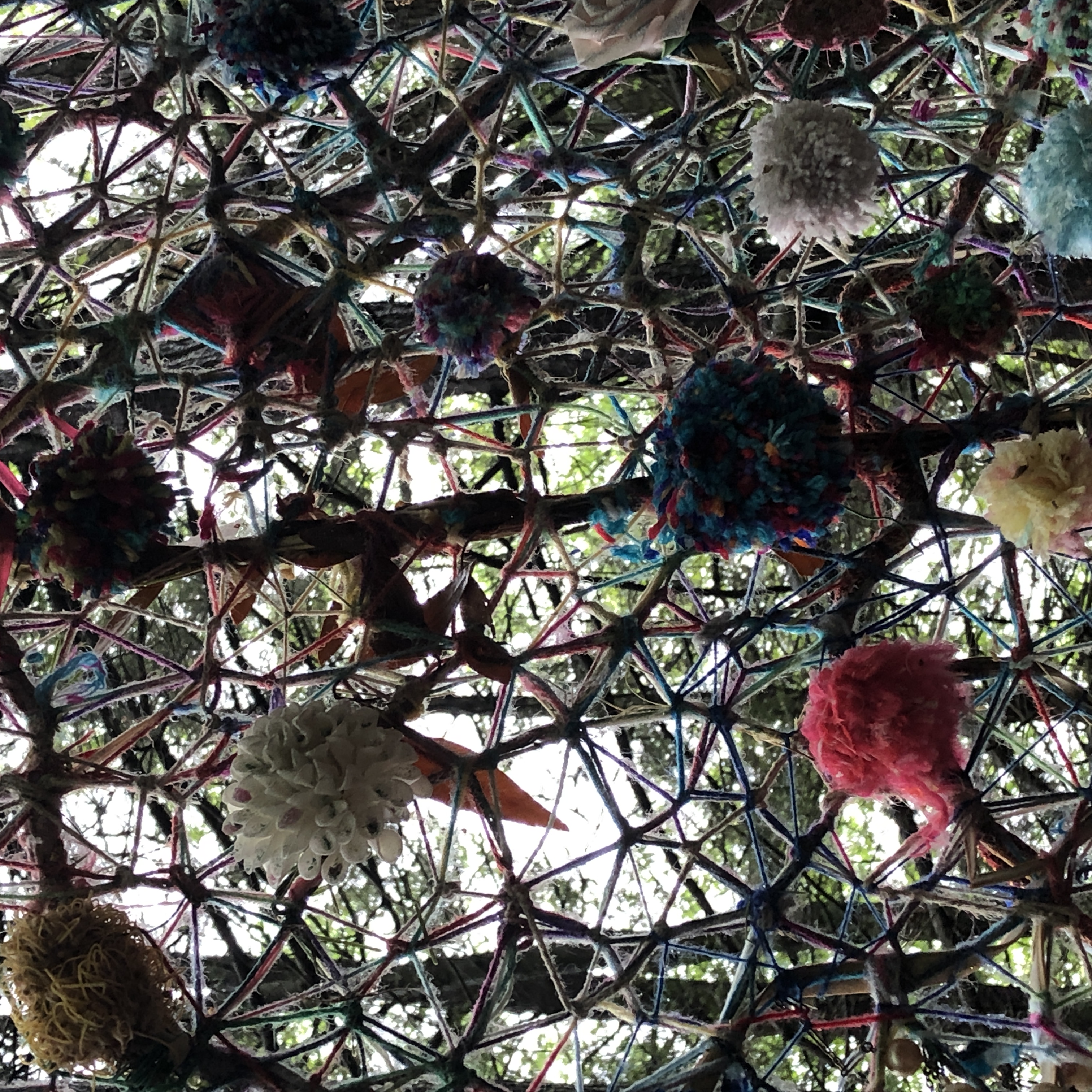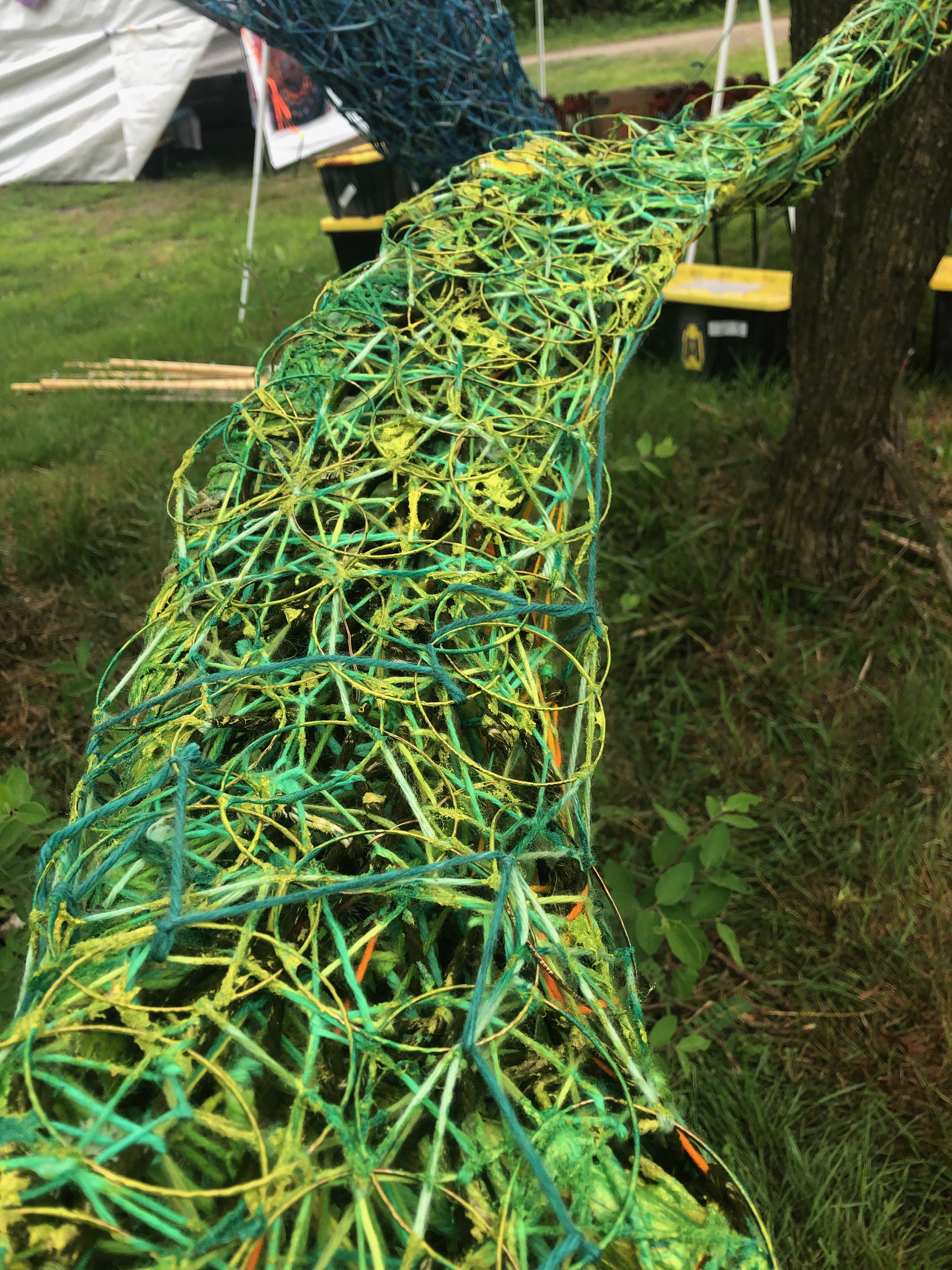 Refugia is an installation built from modular art objects created with fallen branches bound together with rope and yarn. The structure of the installation makes a welcoming and protective space people can enter and pass through, integrating more fully with their environment and themselves. An inquiry into dynamic balance and non-Euclidian building architecture, the installation process uses minimal tools, gravity and no electricity. Refugia is shelter intended to draw viewers into and around its interior and exterior spaces, creating possibilities for refuge and reorientation.