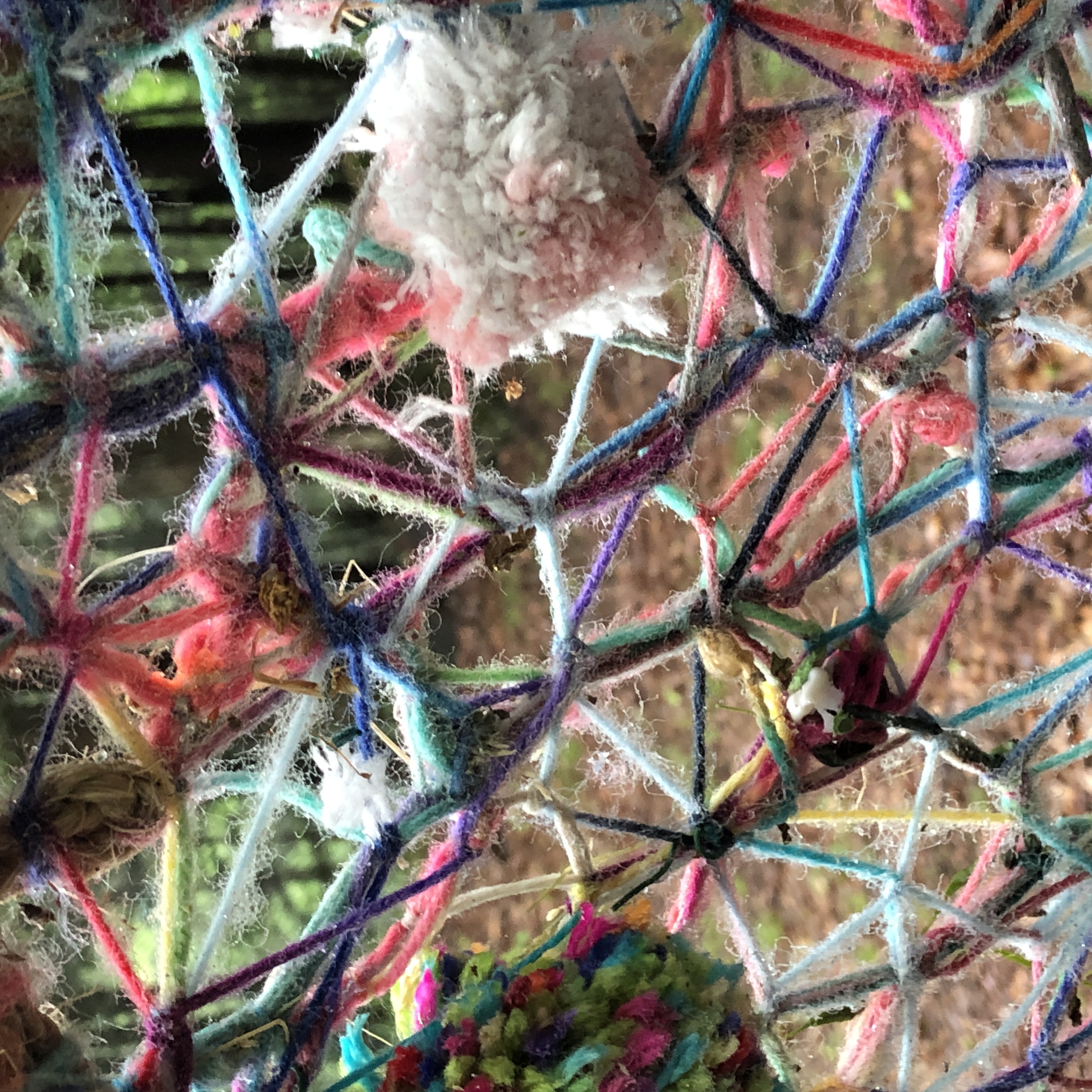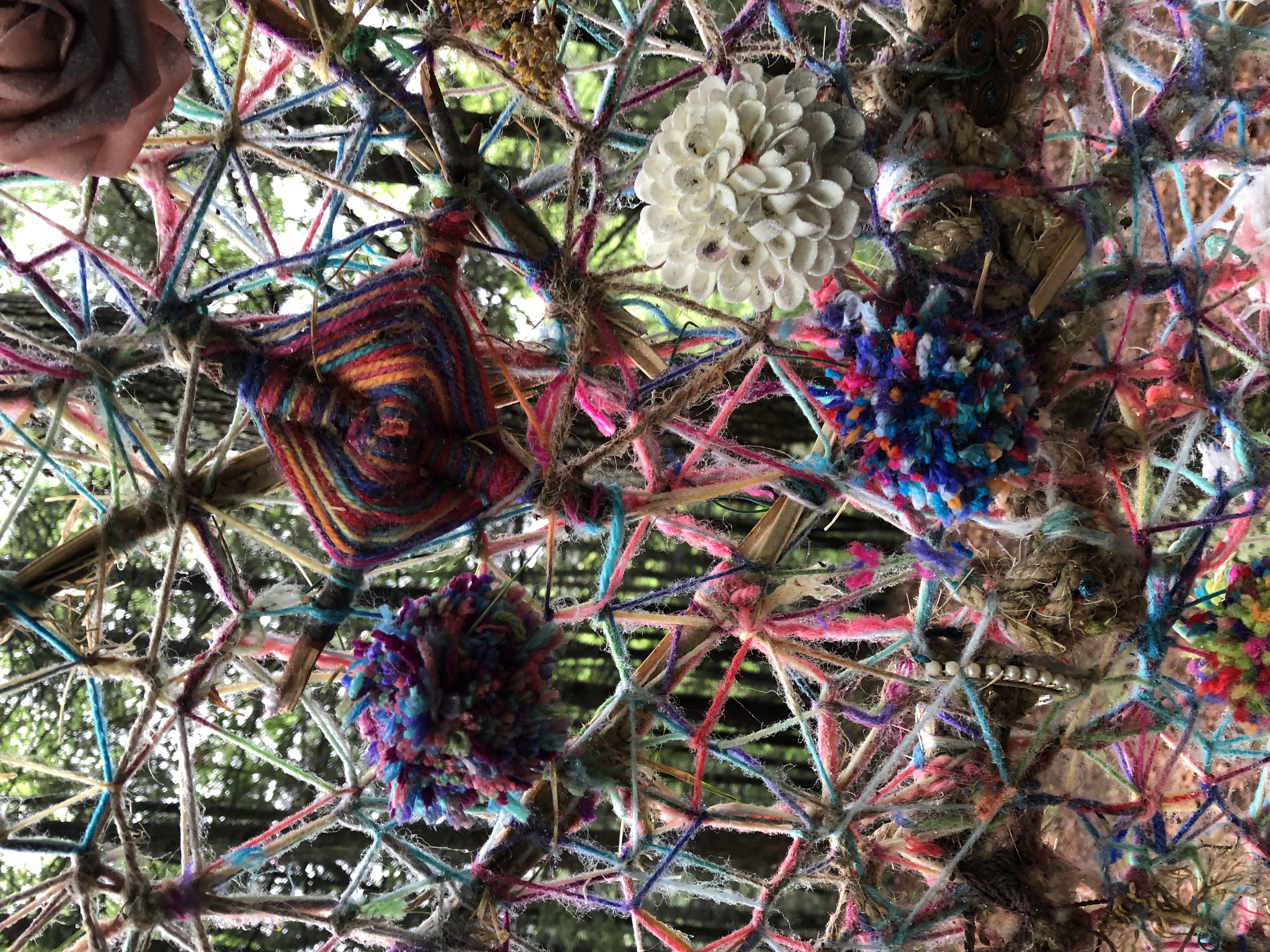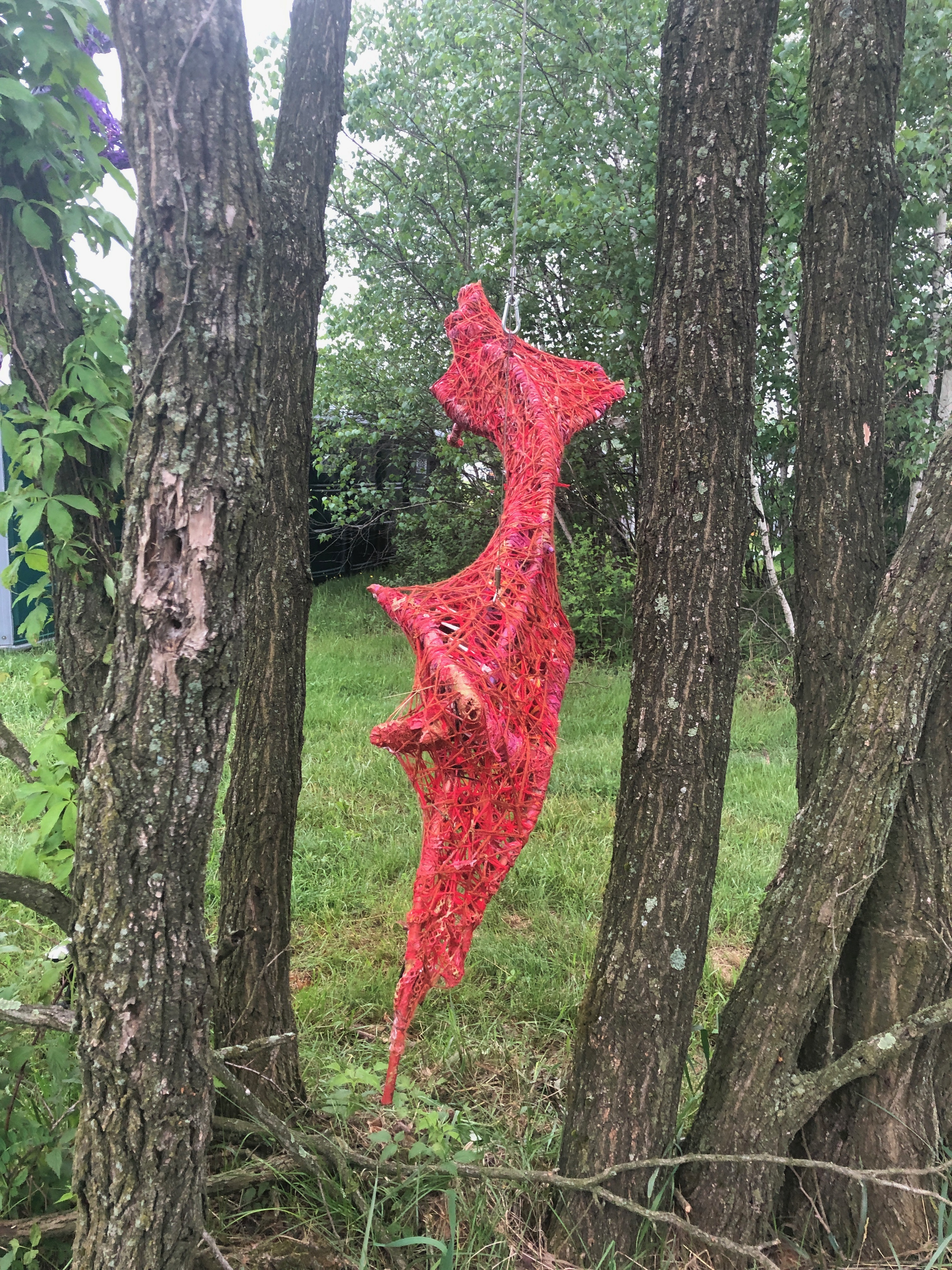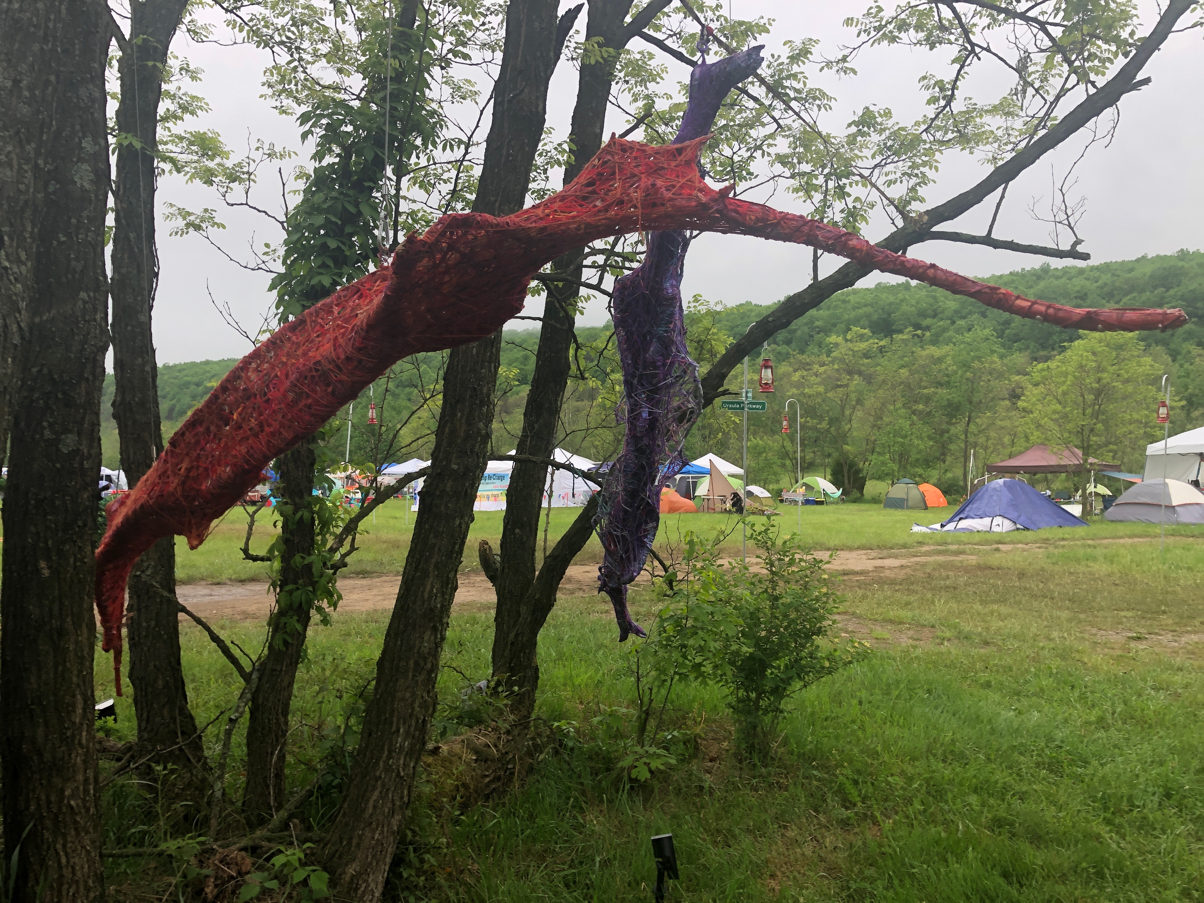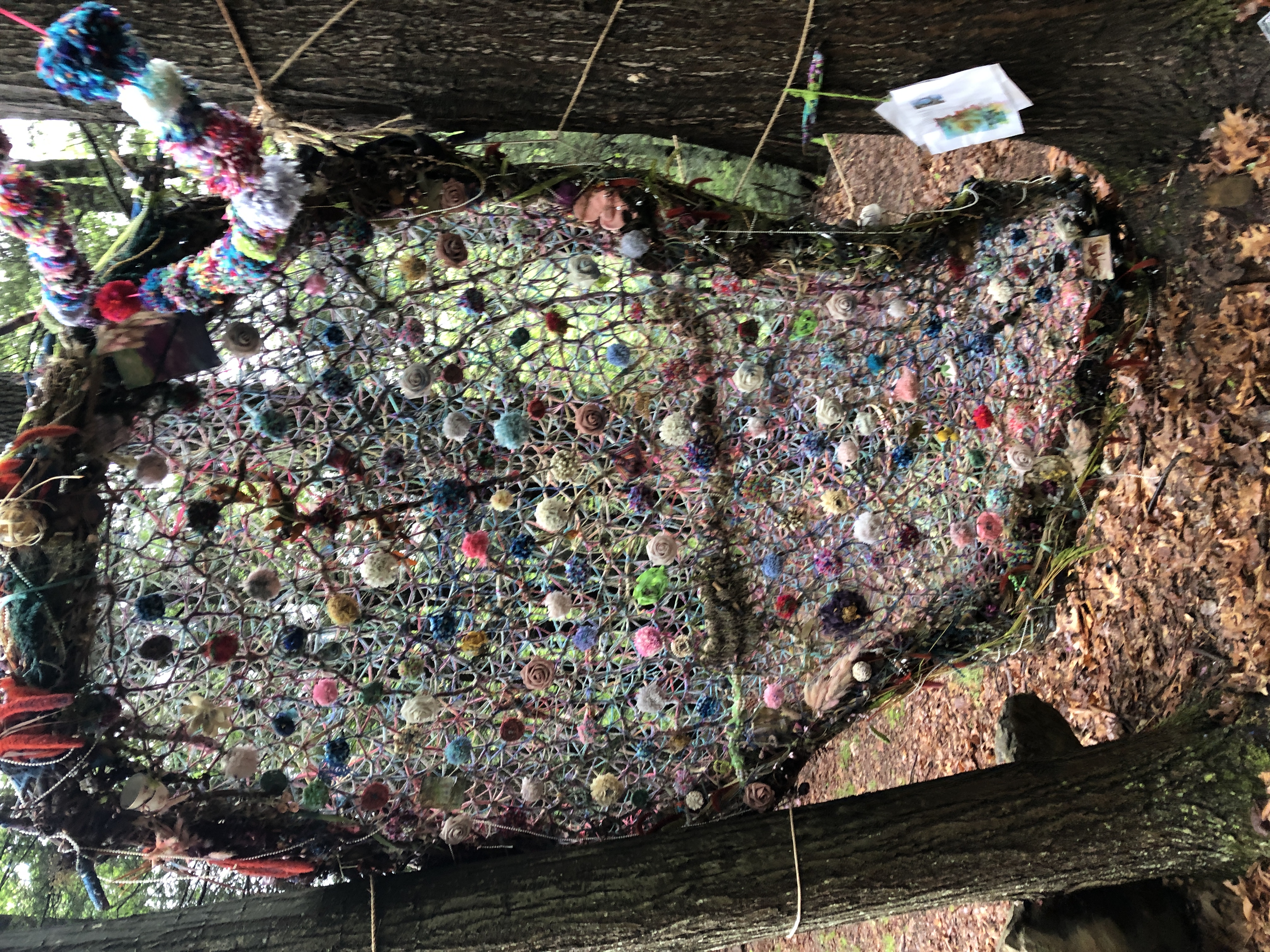 Refugia is an installation built from modular art objects created with fallen branches bound together with rope and yarn. The structure of the installation makes a welcoming and protective space people can enter and pass through, integrating more fully with their environment and themselves. An inquiry into dynamic balance and non-Euclidian building architecture, the installation process uses minimal tools, gravity and no electricity. Refugia is shelter intended to draw viewers into and around its interior and exterior spaces, creating possibilities for refuge and reorientation.