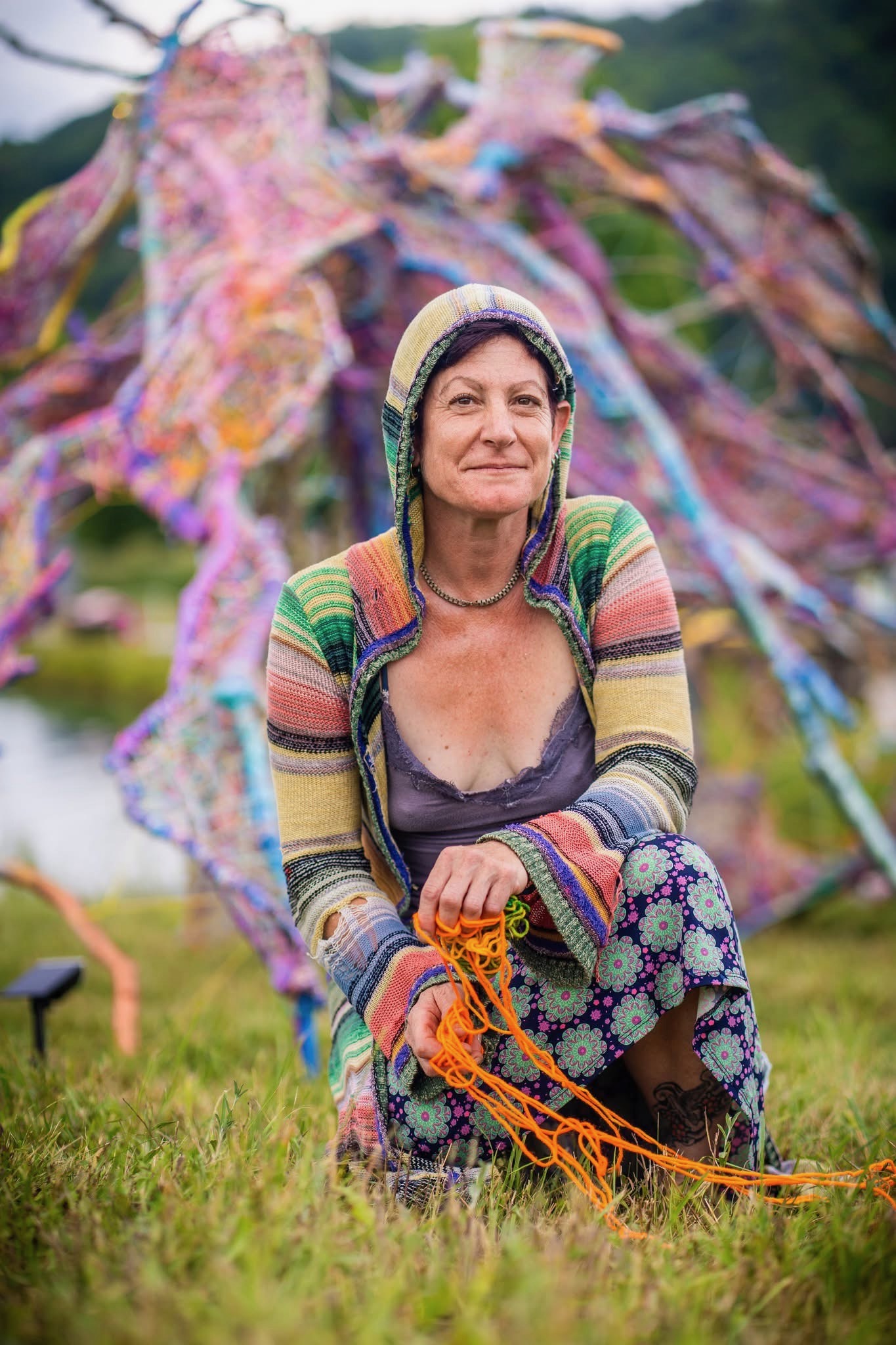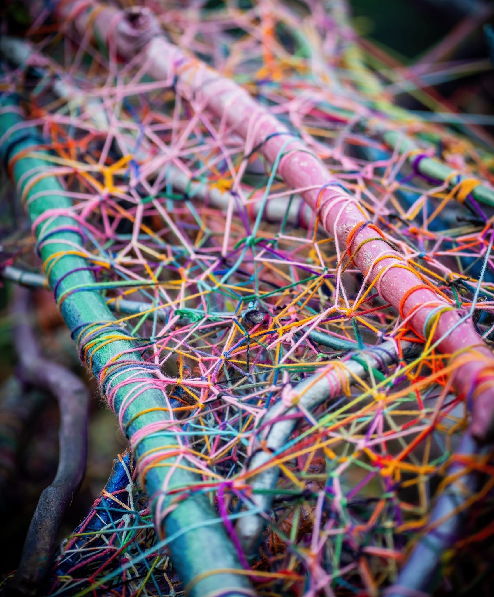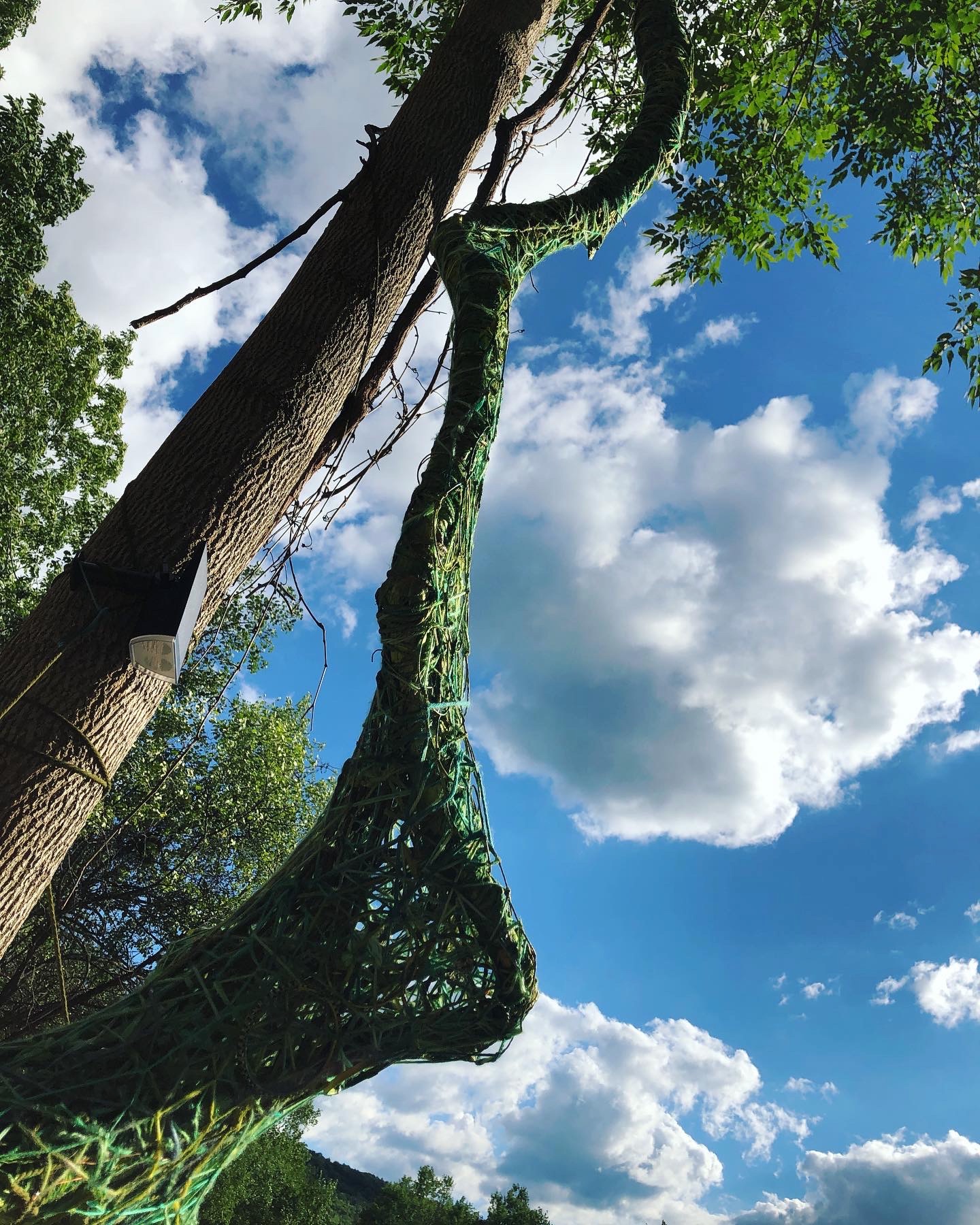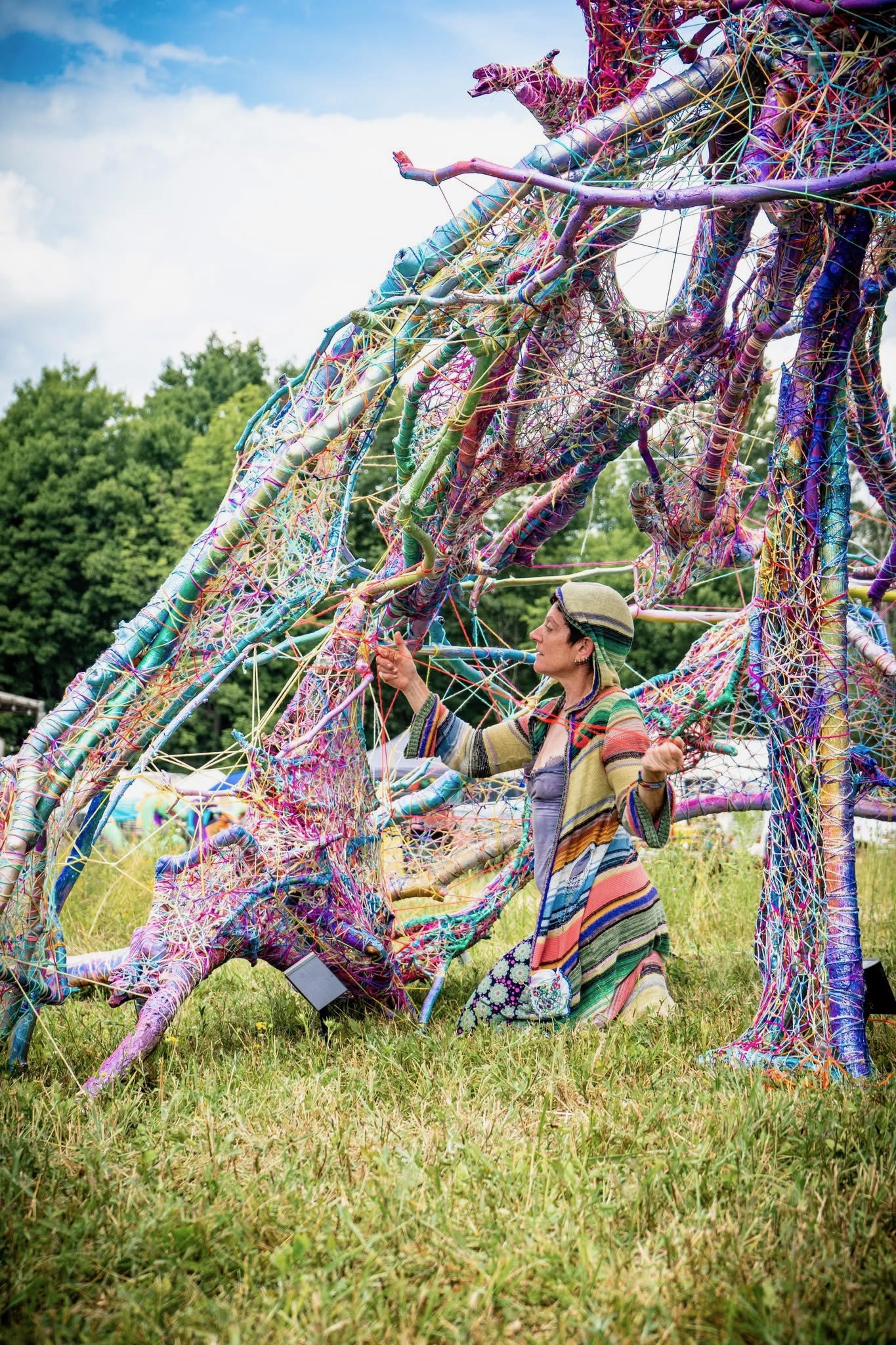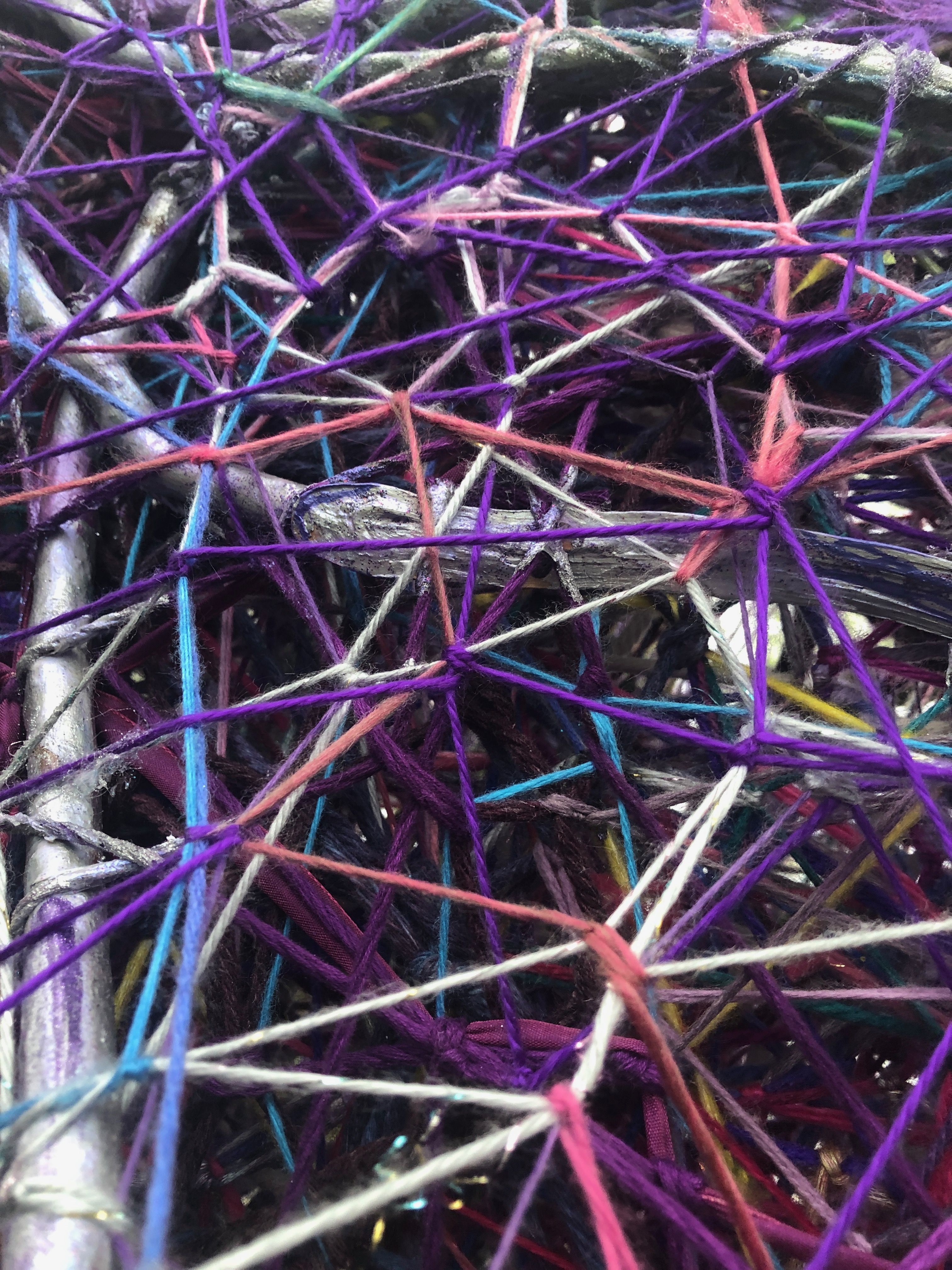 Refugia is an installation built from modular art objects created with fallen branches bound together with rope and yarn. The structure of the installation makes a welcoming and protective space people can enter and pass through, integrating more fully with their environment and themselves. An inquiry into dynamic balance and non-Euclidian building architecture, the installation process uses minimal tools, gravity and no electricity. Refugia is shelter intended to draw viewers into and around its interior and exterior spaces, creating possibilities for refuge and reorientation.