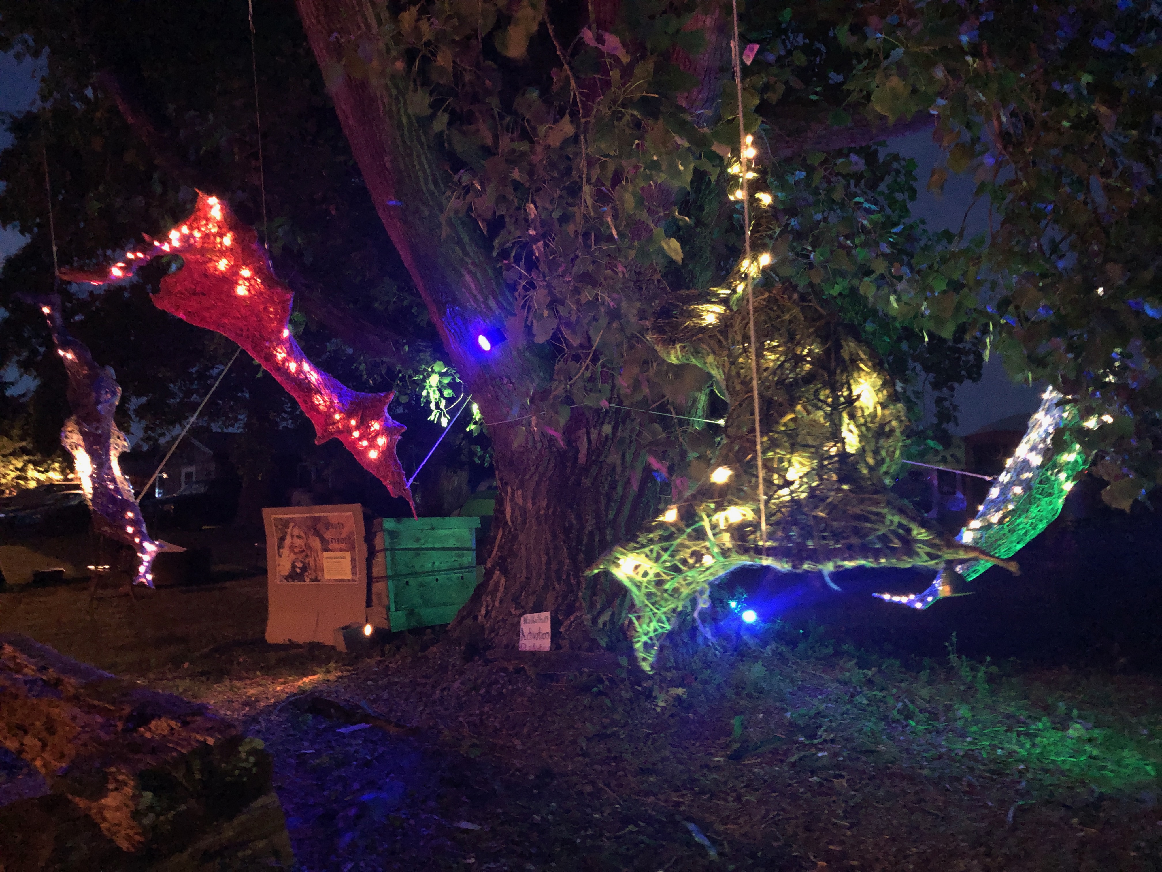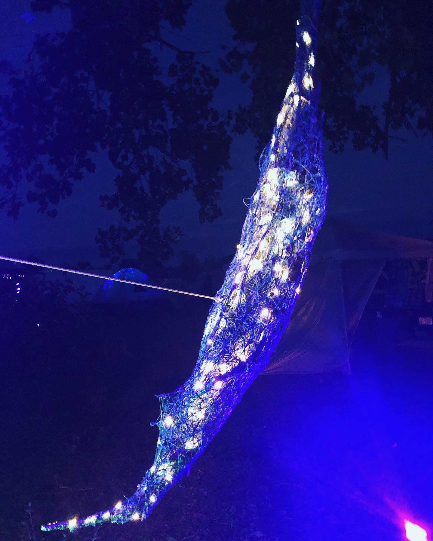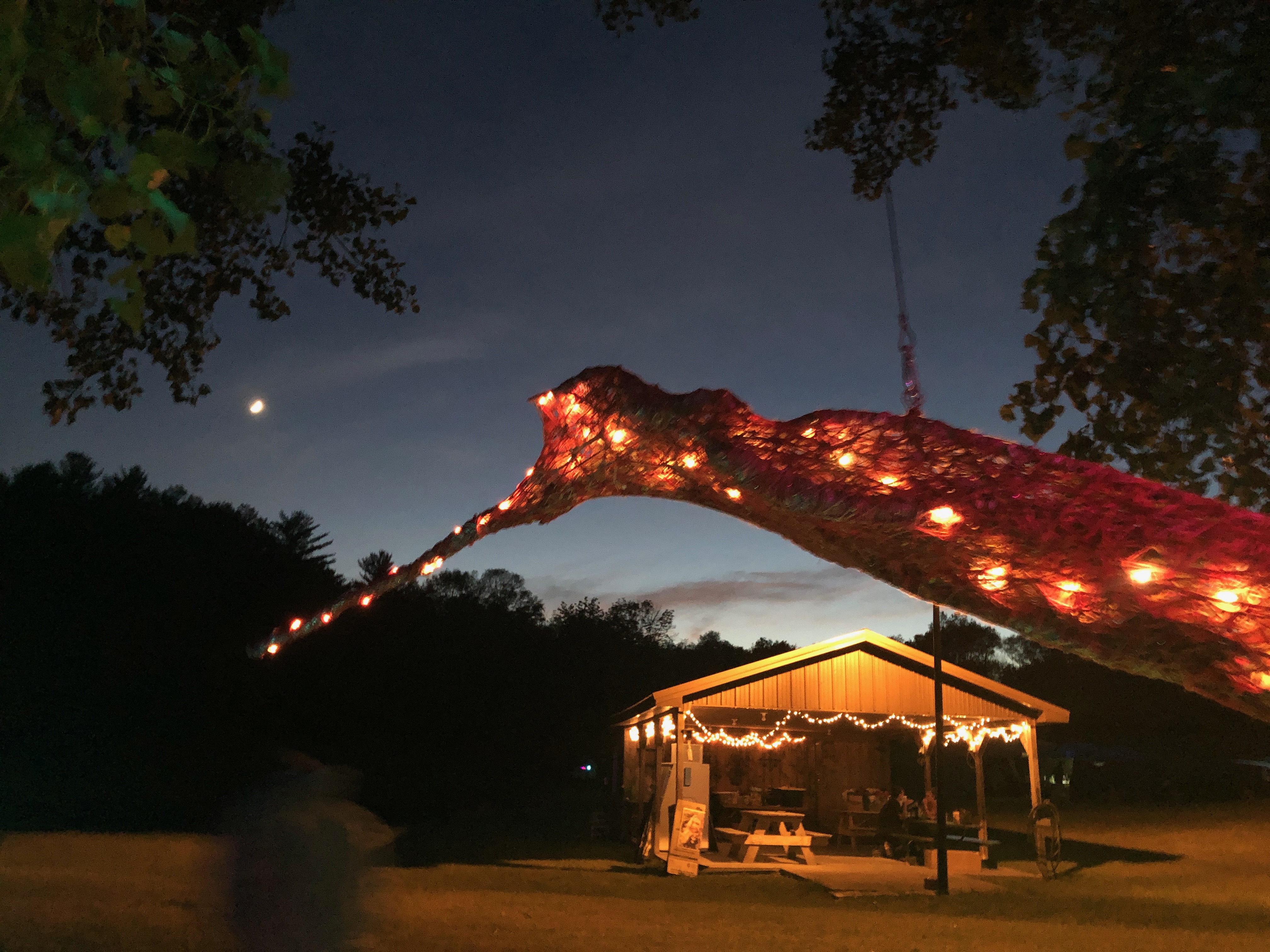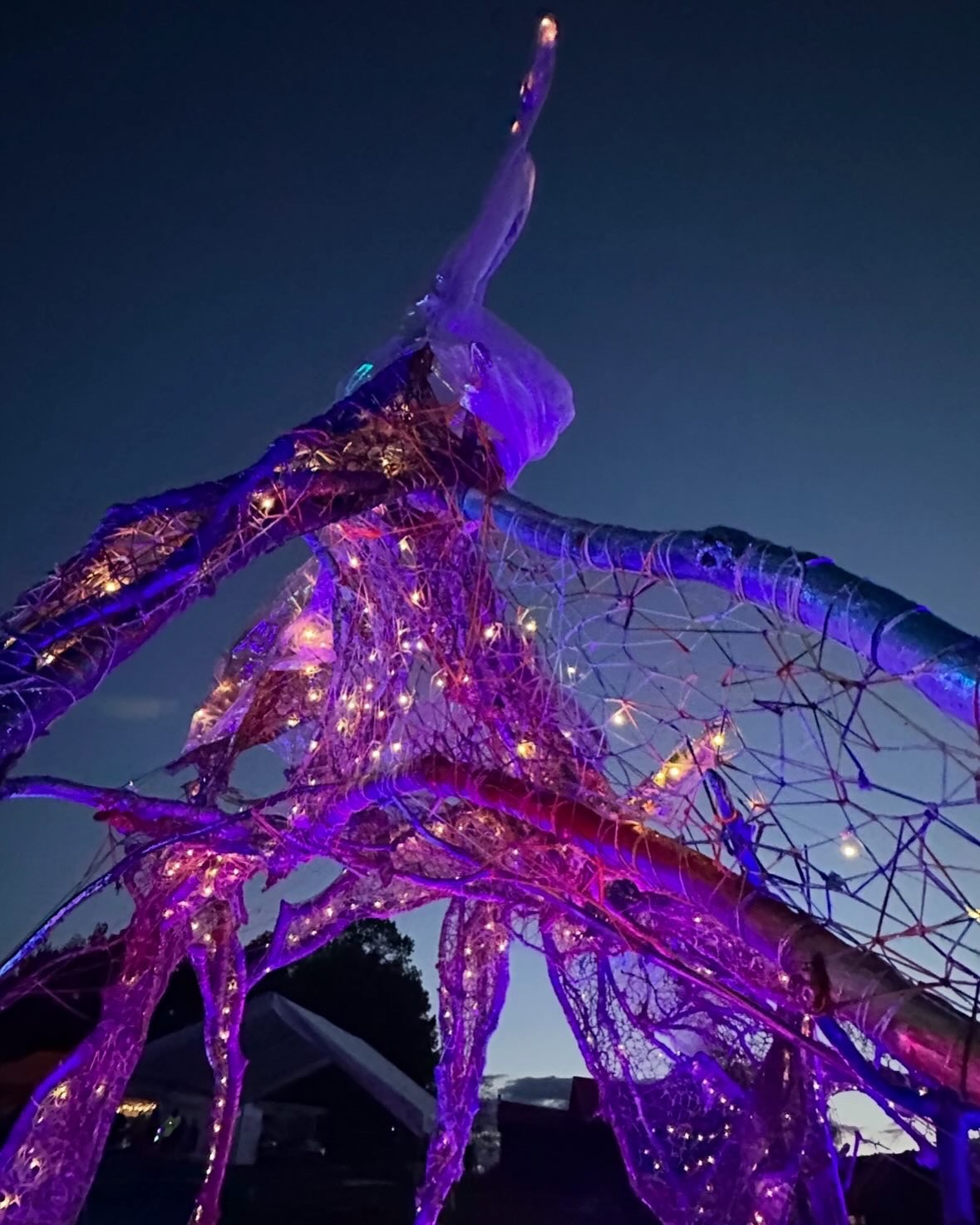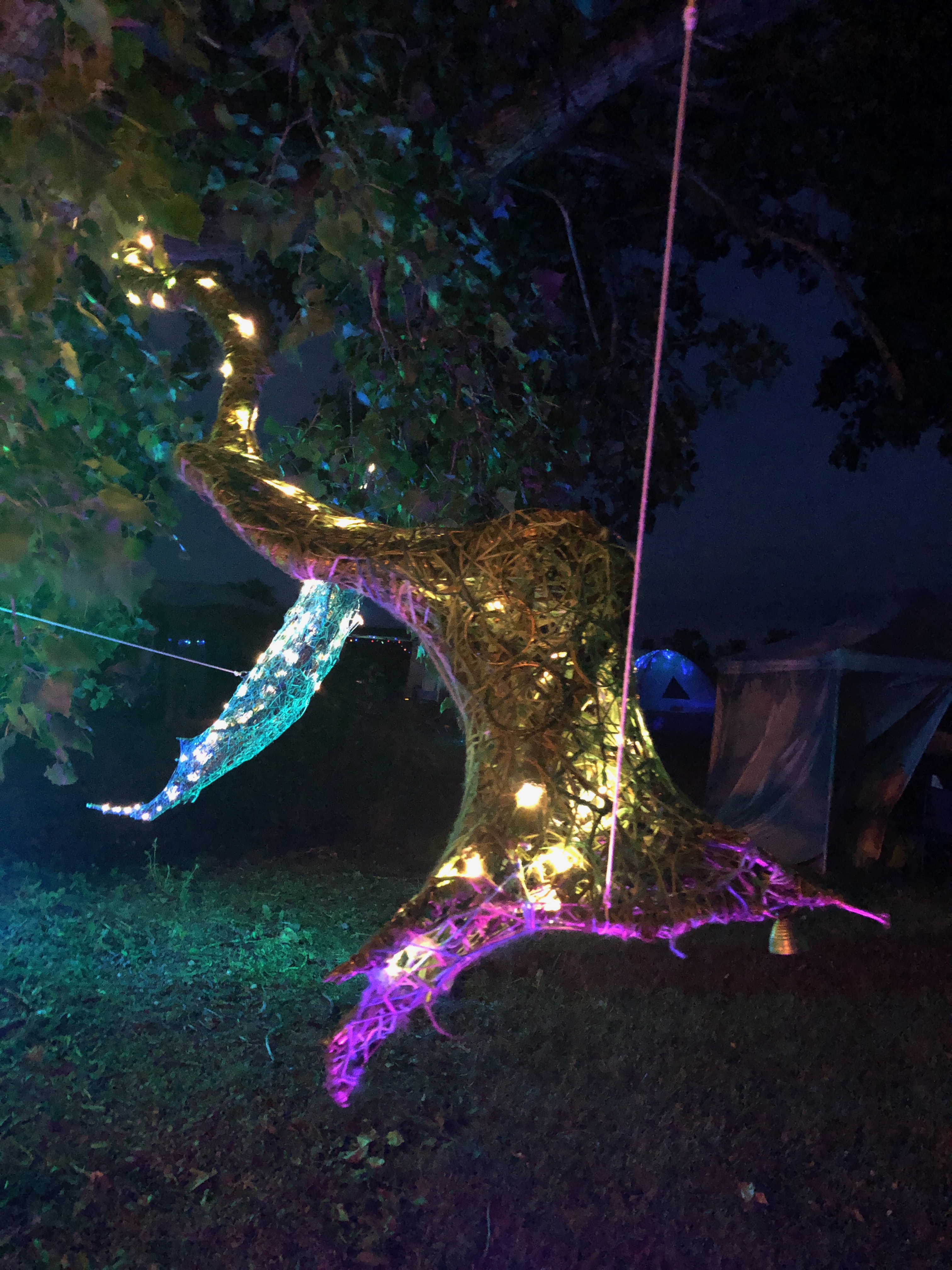 Refugia is an installation built from modular art objects created with fallen branches bound together with rope and yarn. The structure of the installation makes a welcoming and protective space people can enter and pass through, integrating more fully with their environment and themselves. An inquiry into dynamic balance and non-Euclidian building architecture, the installation process uses minimal tools, gravity and no electricity. Refugia is shelter intended to draw viewers into and around its interior and exterior spaces, creating possibilities for refuge and reorientation.