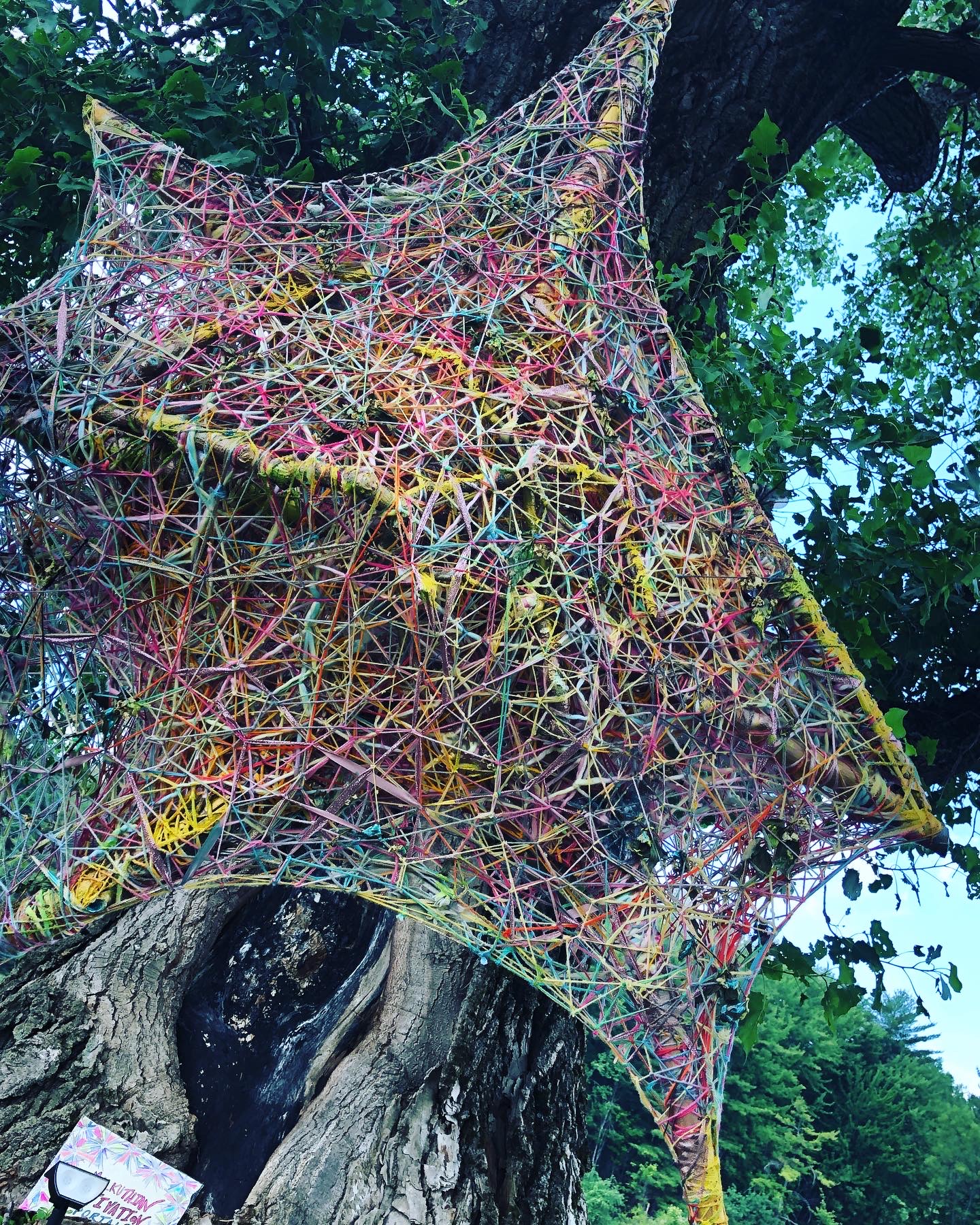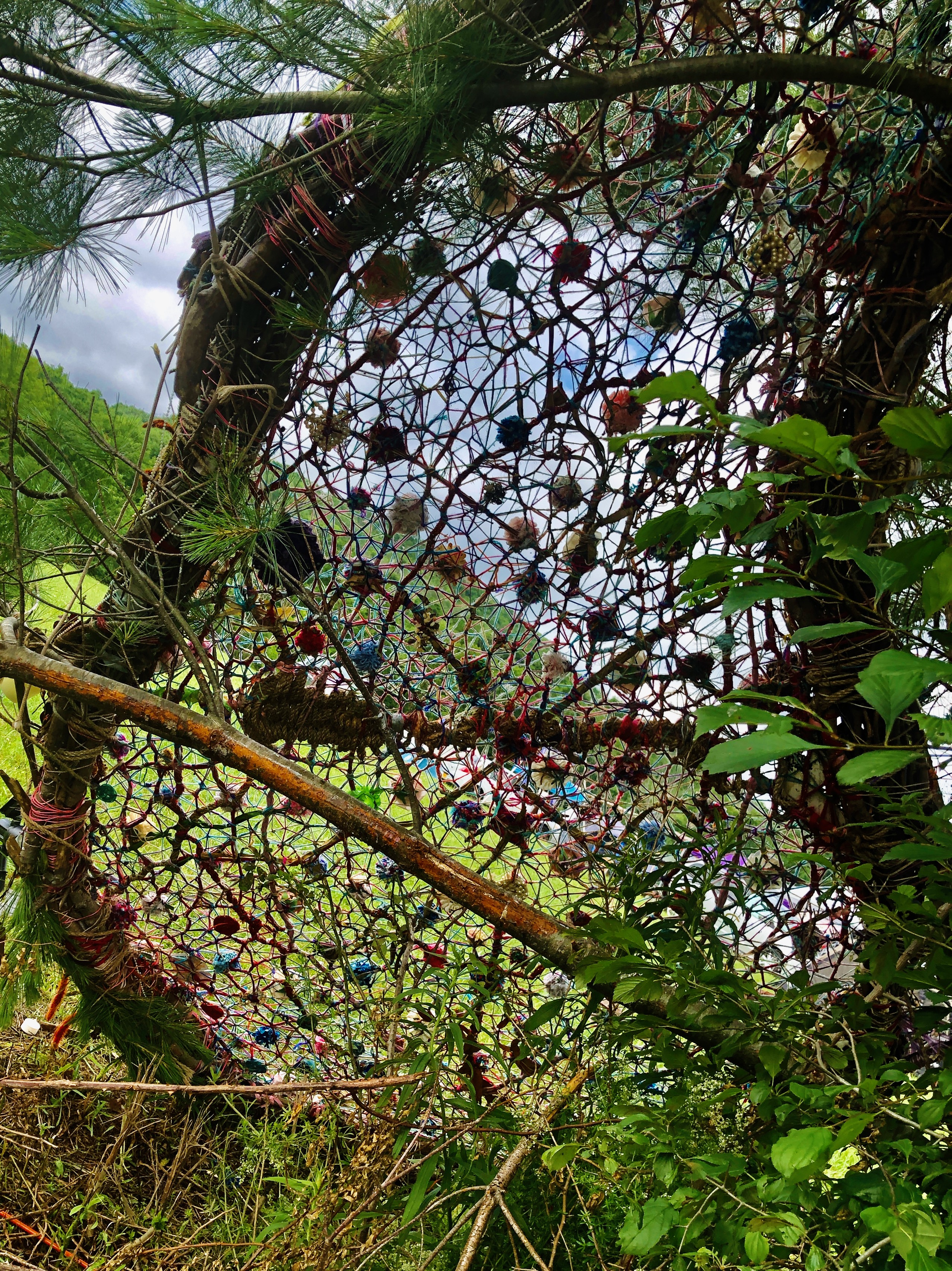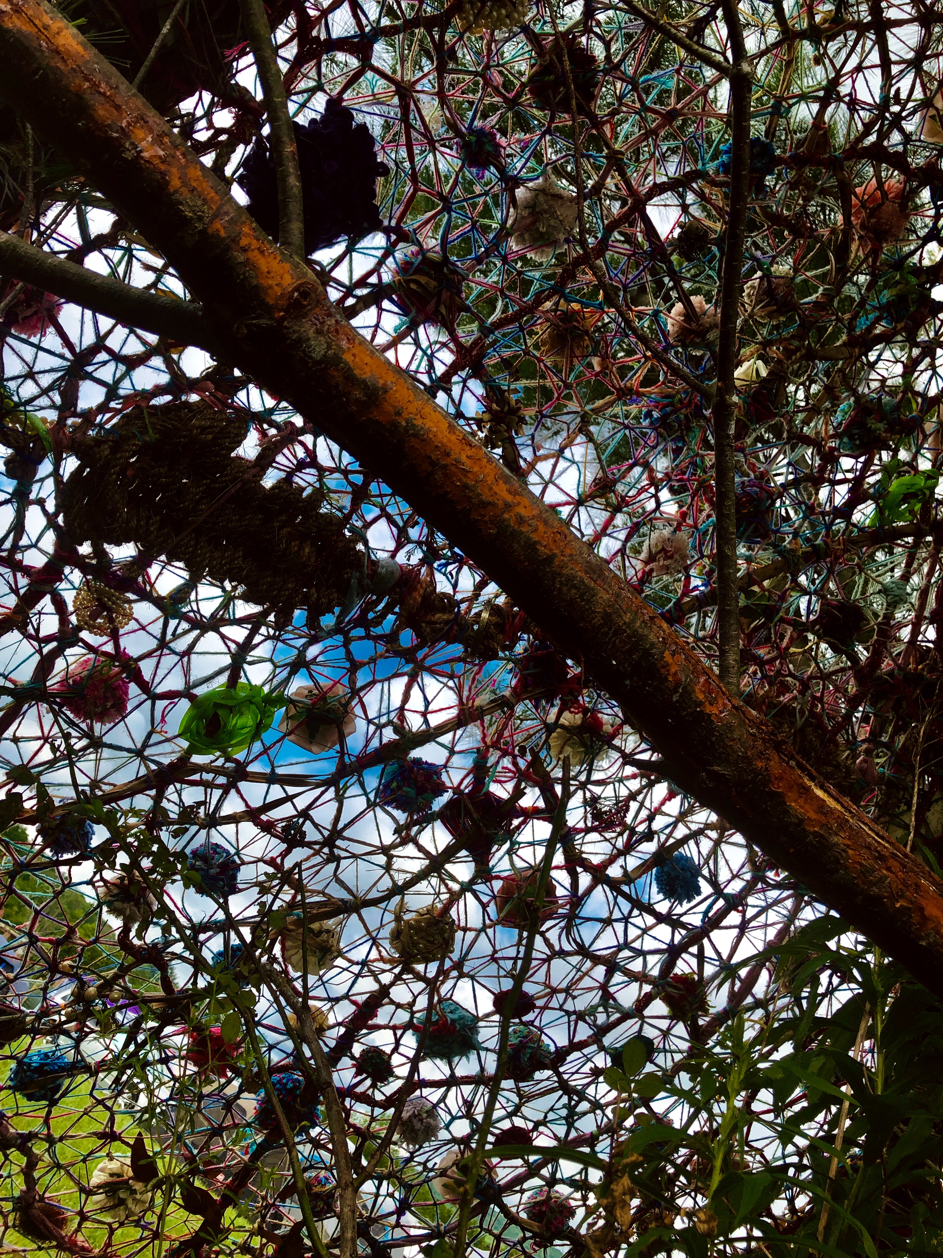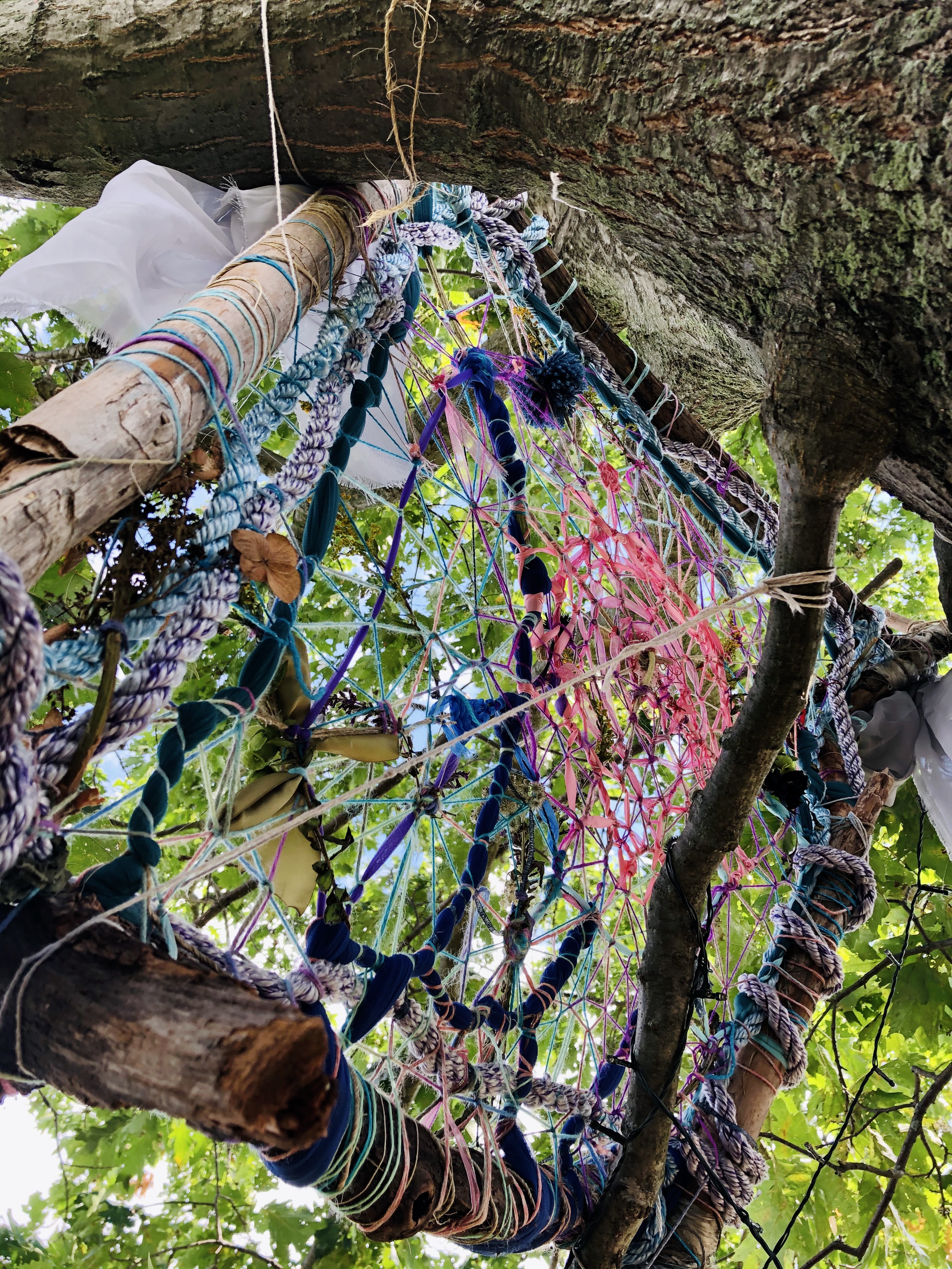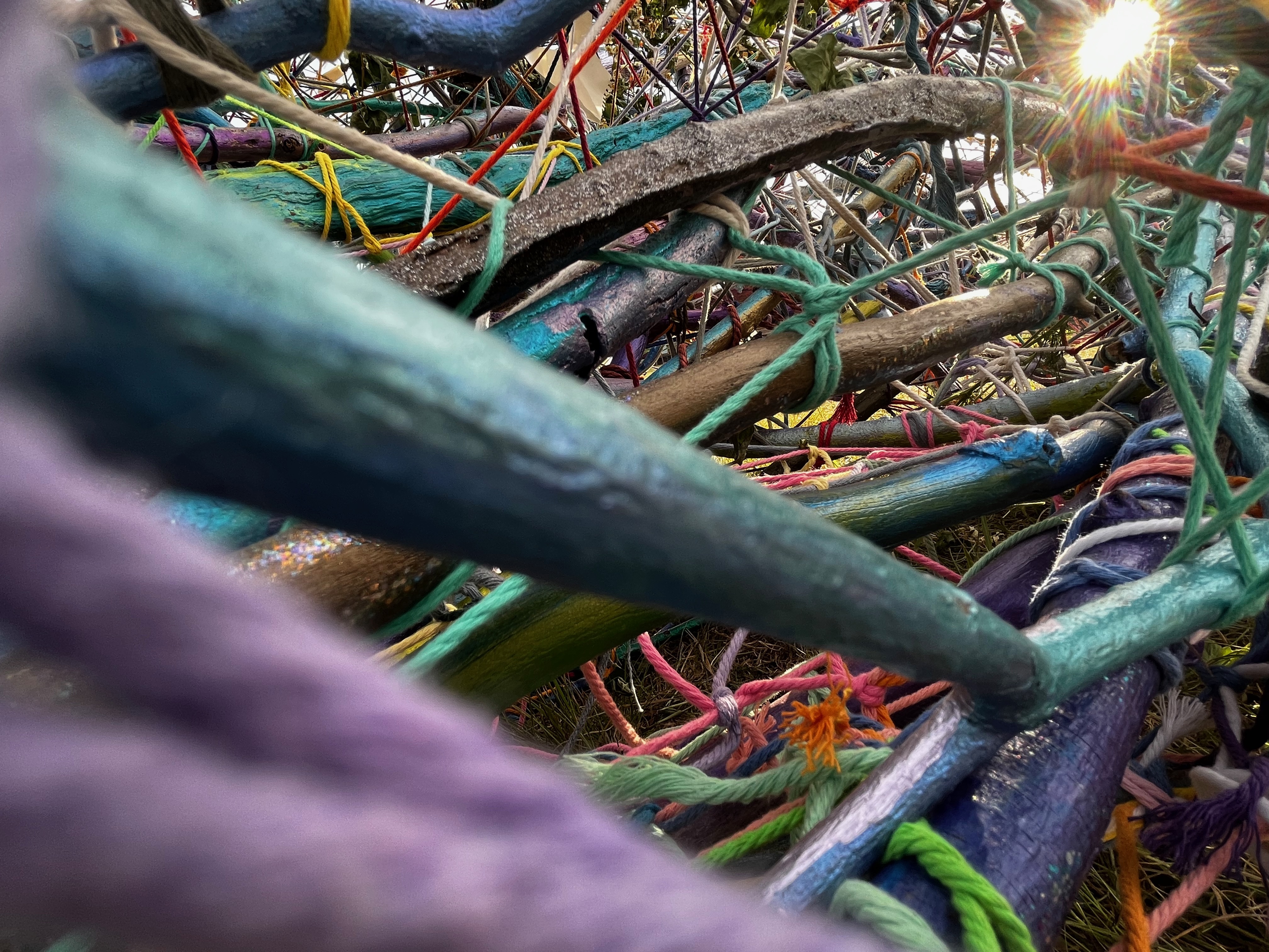Refugia is an installation built from modular art objects created with fallen branches bound together with rope and yarn. The structure of the installation makes a welcoming and protective space people can enter and pass through, integrating more fully with their environment and themselves. An inquiry into dynamic balance and non-Euclidian building architecture, the installation process uses minimal tools, gravity and no electricity. Refugia is shelter intended to draw viewers into and around its interior and exterior spaces, creating possibilities for refuge and reorientation.