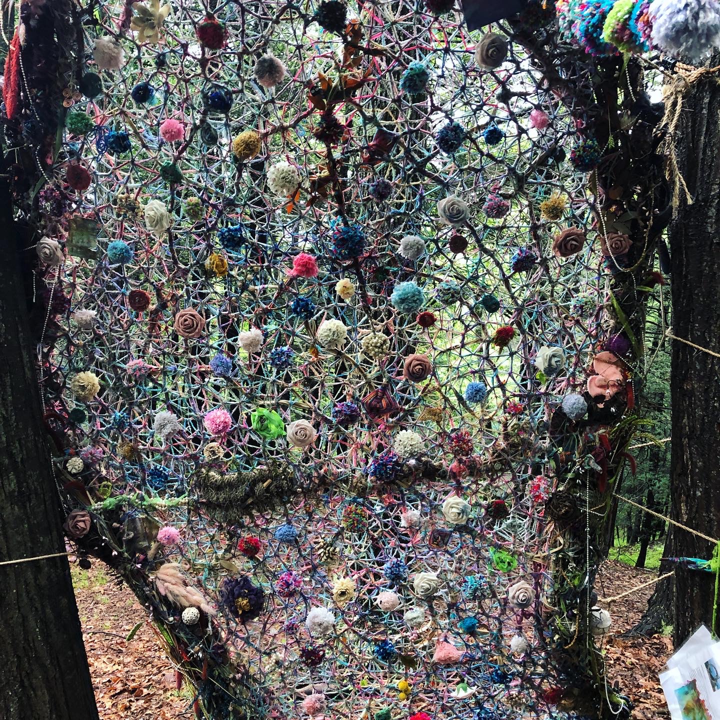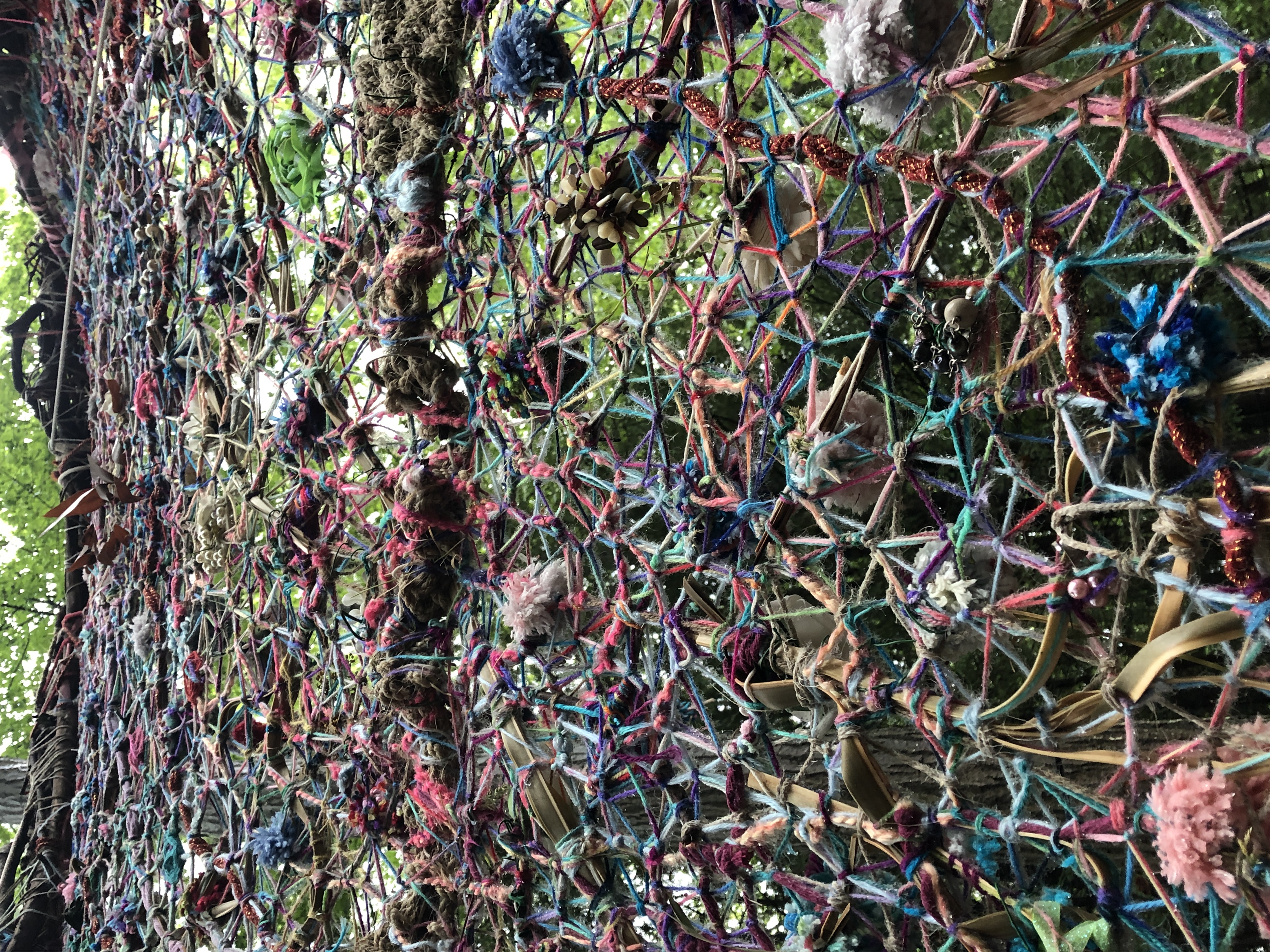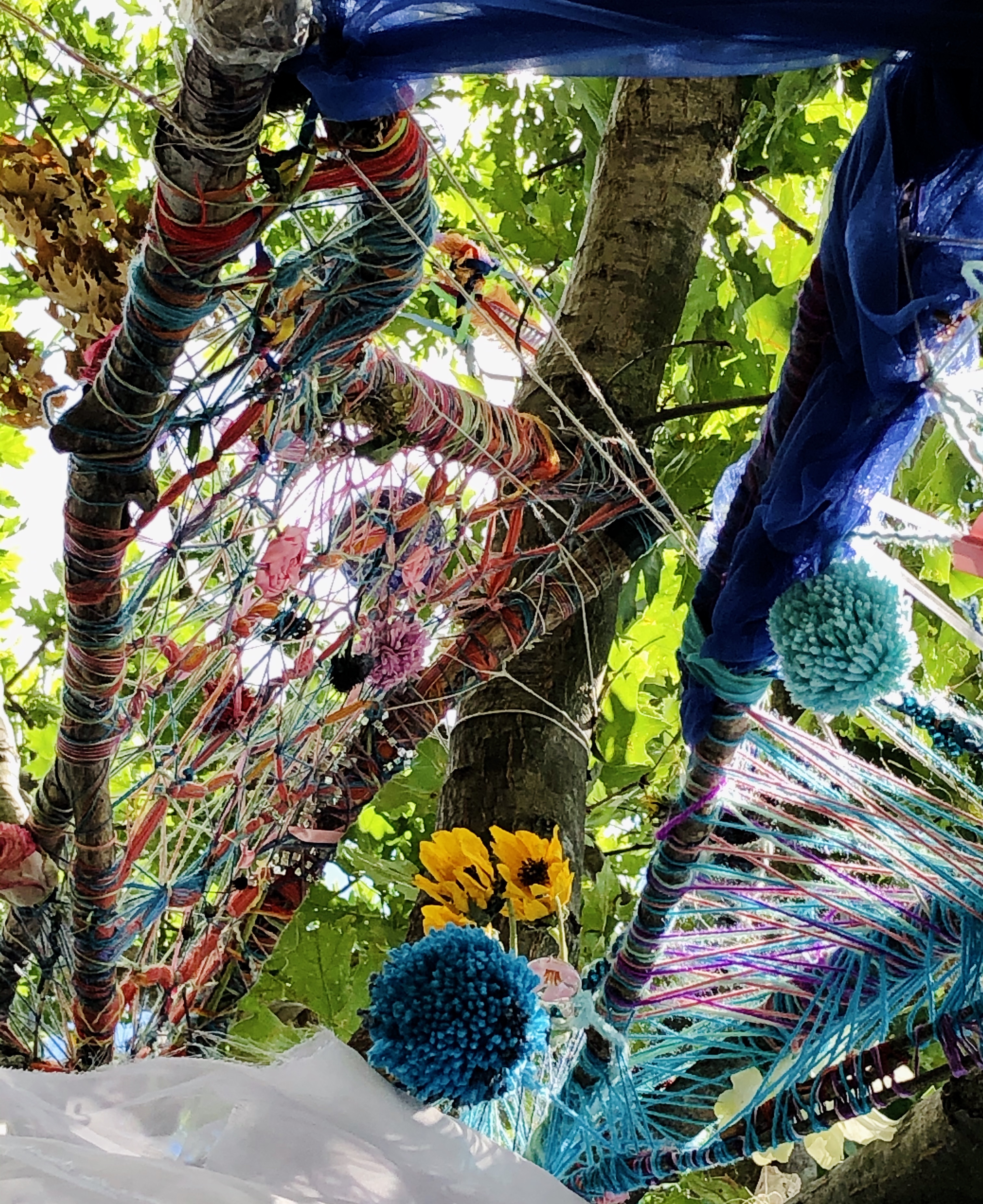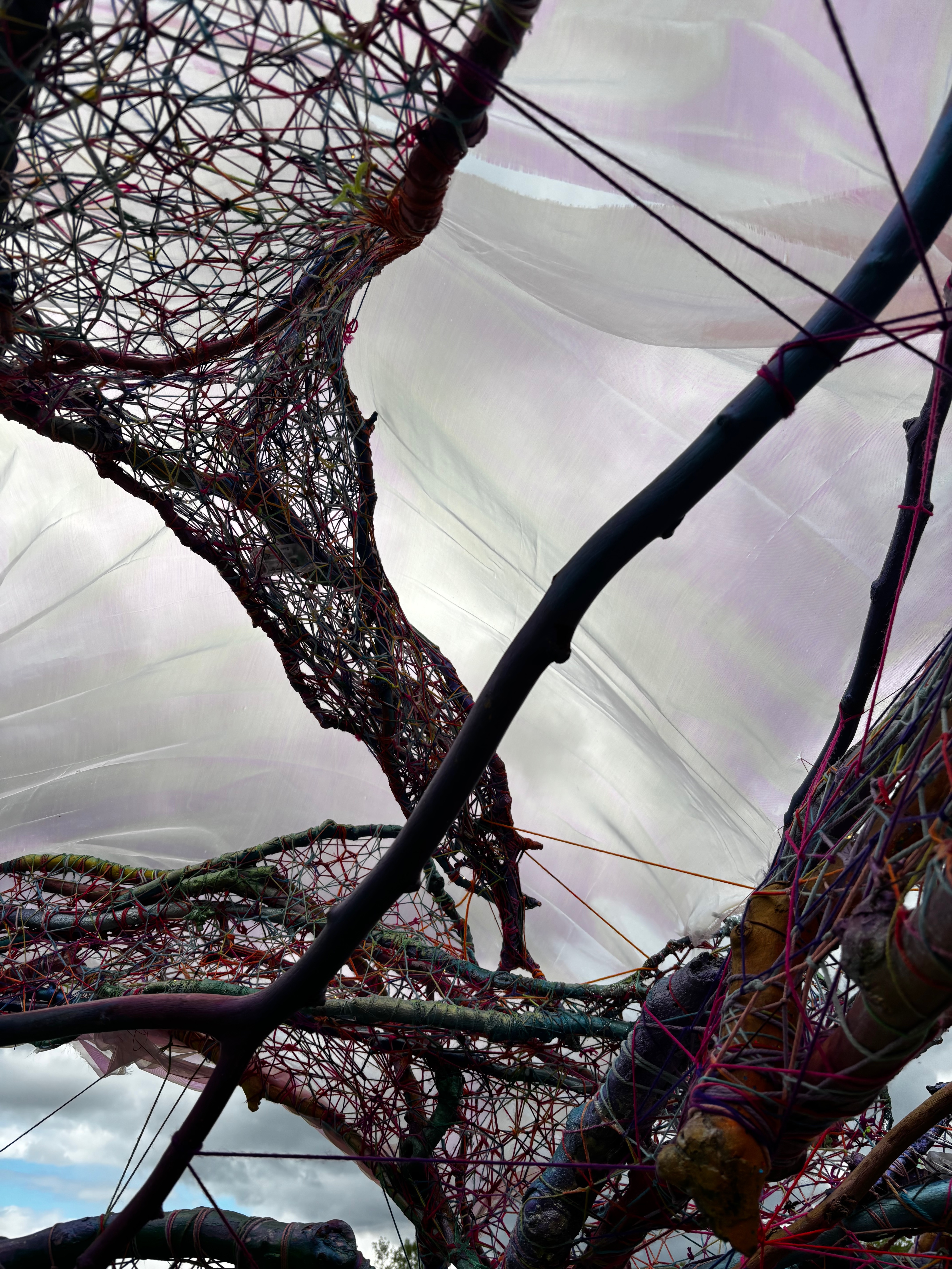 Refugia is an installation built from modular art objects created with fallen branches bound together with rope and yarn. The structure of the installation makes a welcoming and protective space people can enter and pass through, integrating more fully with their environment and themselves. An inquiry into dynamic balance and non-Euclidian building architecture, the installation process uses minimal tools, gravity and no electricity. Refugia is shelter intended to draw viewers into and around its interior and exterior spaces, creating possibilities for refuge and reorientation.