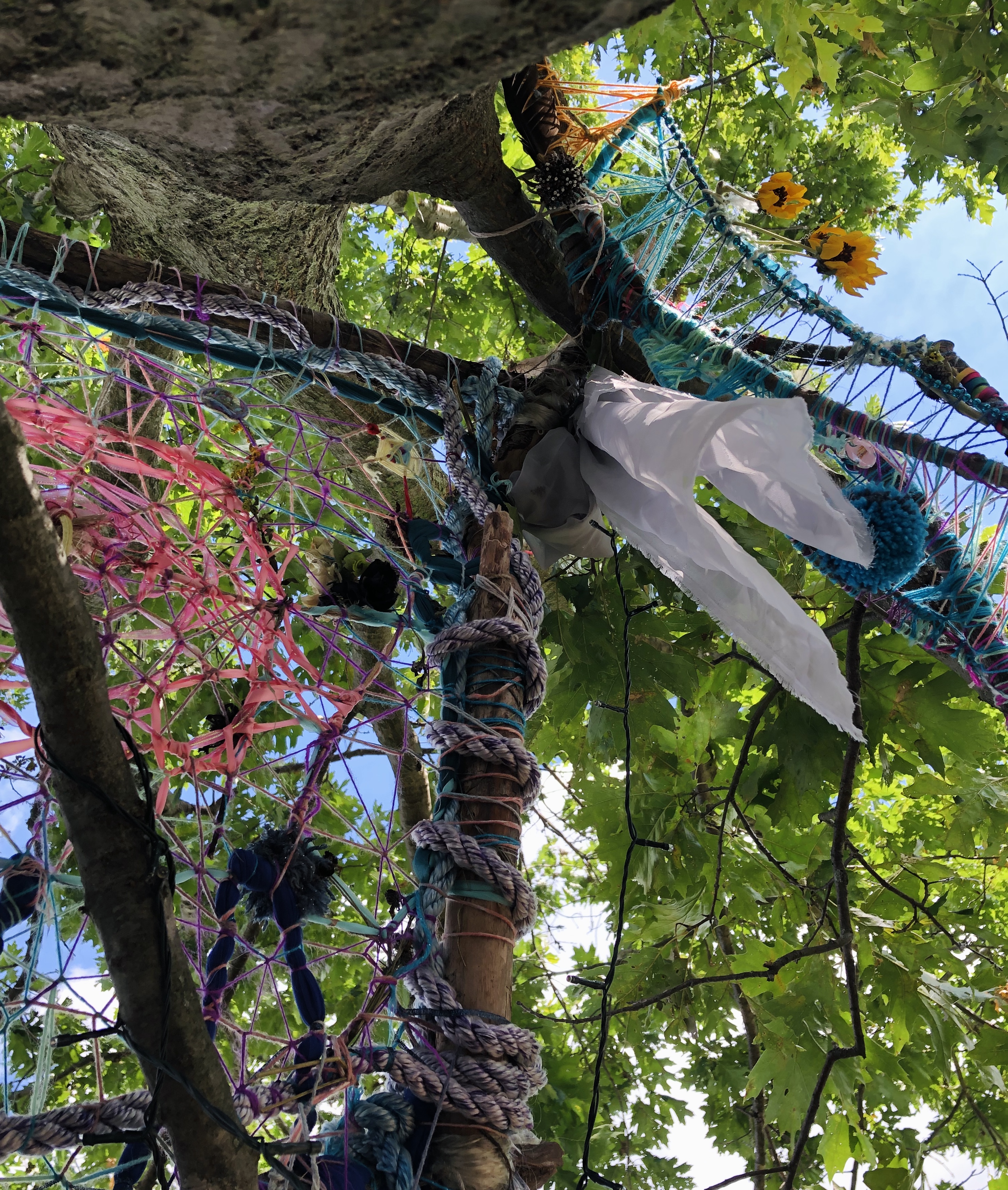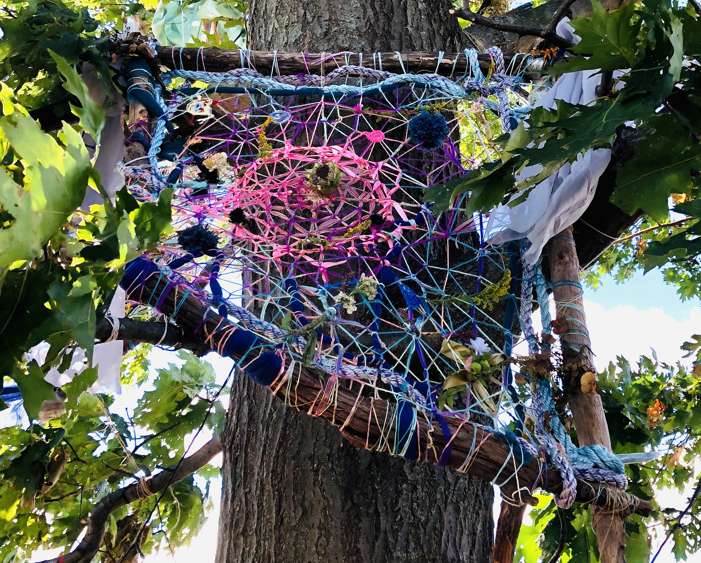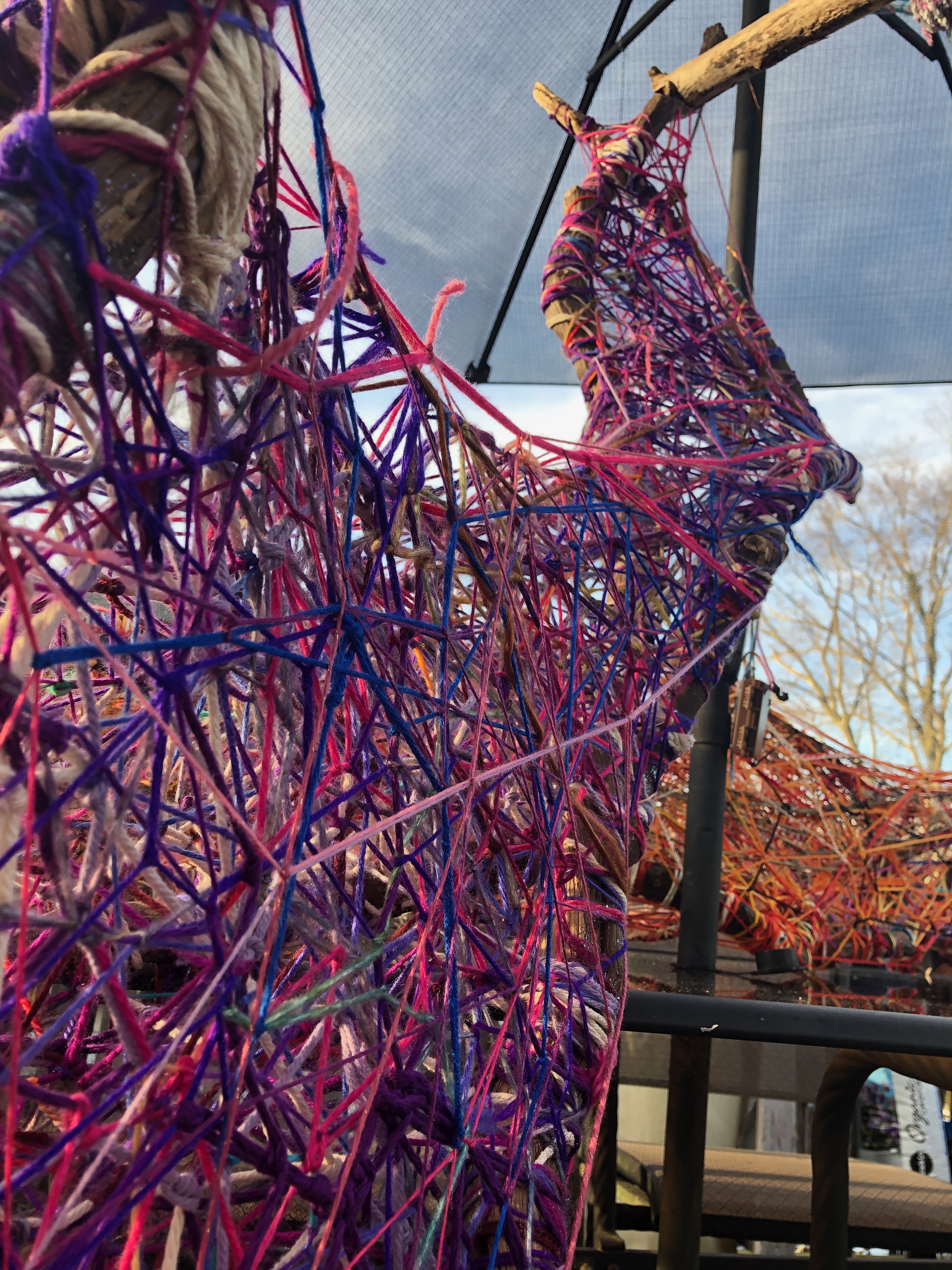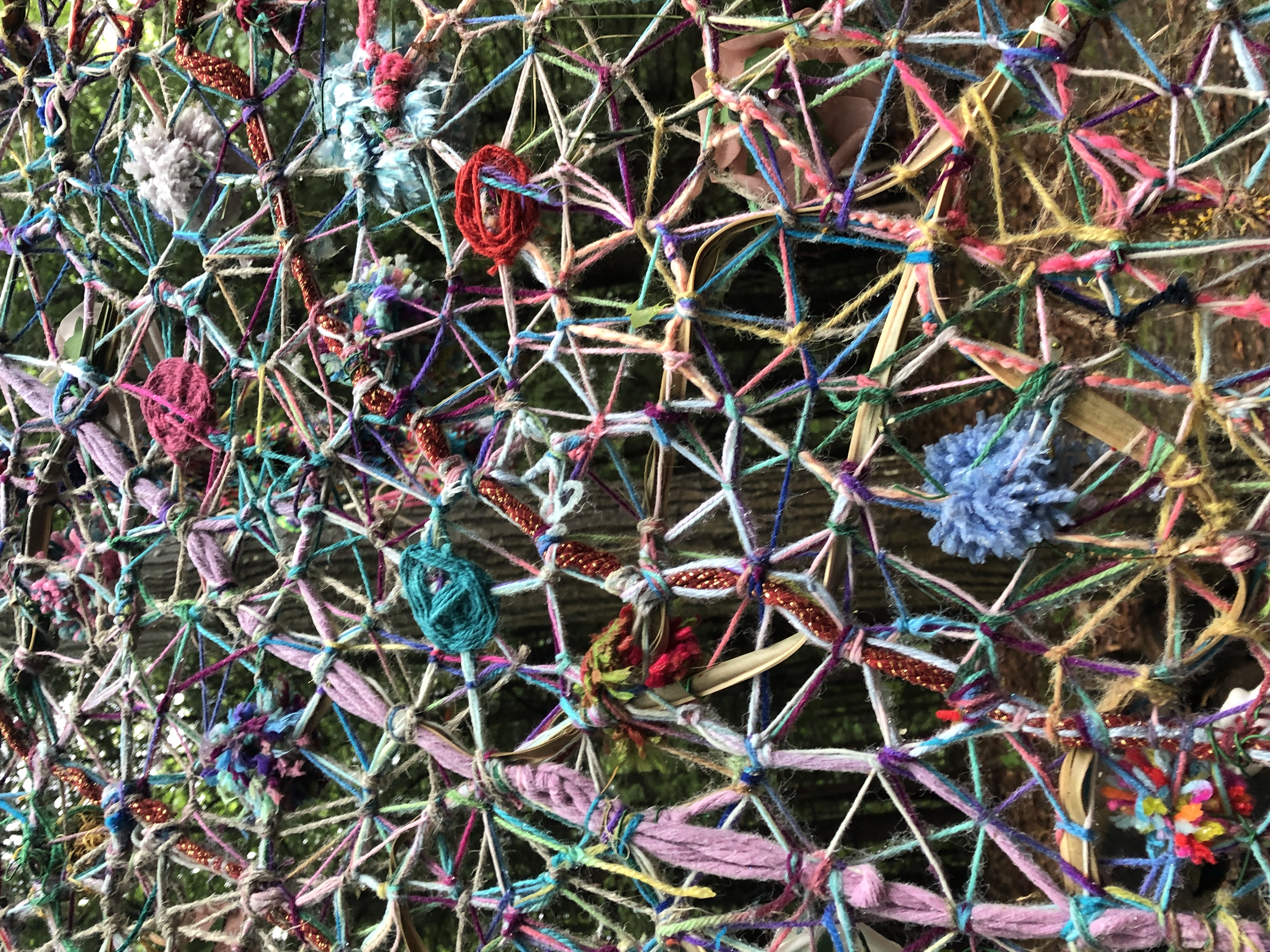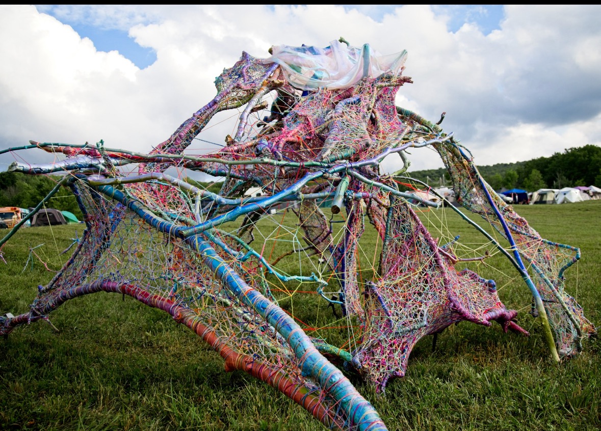 Refugia is an installation built from modular art objects created with fallen branches bound together with rope and yarn. The structure of the installation makes a welcoming and protective space people can enter and pass through, integrating more fully with their environment and themselves. An inquiry into dynamic balance and non-Euclidian building architecture, the installation process uses minimal tools, gravity and no electricity. Refugia is shelter intended to draw viewers into and around its interior and exterior spaces, creating possibilities for refuge and reorientation.