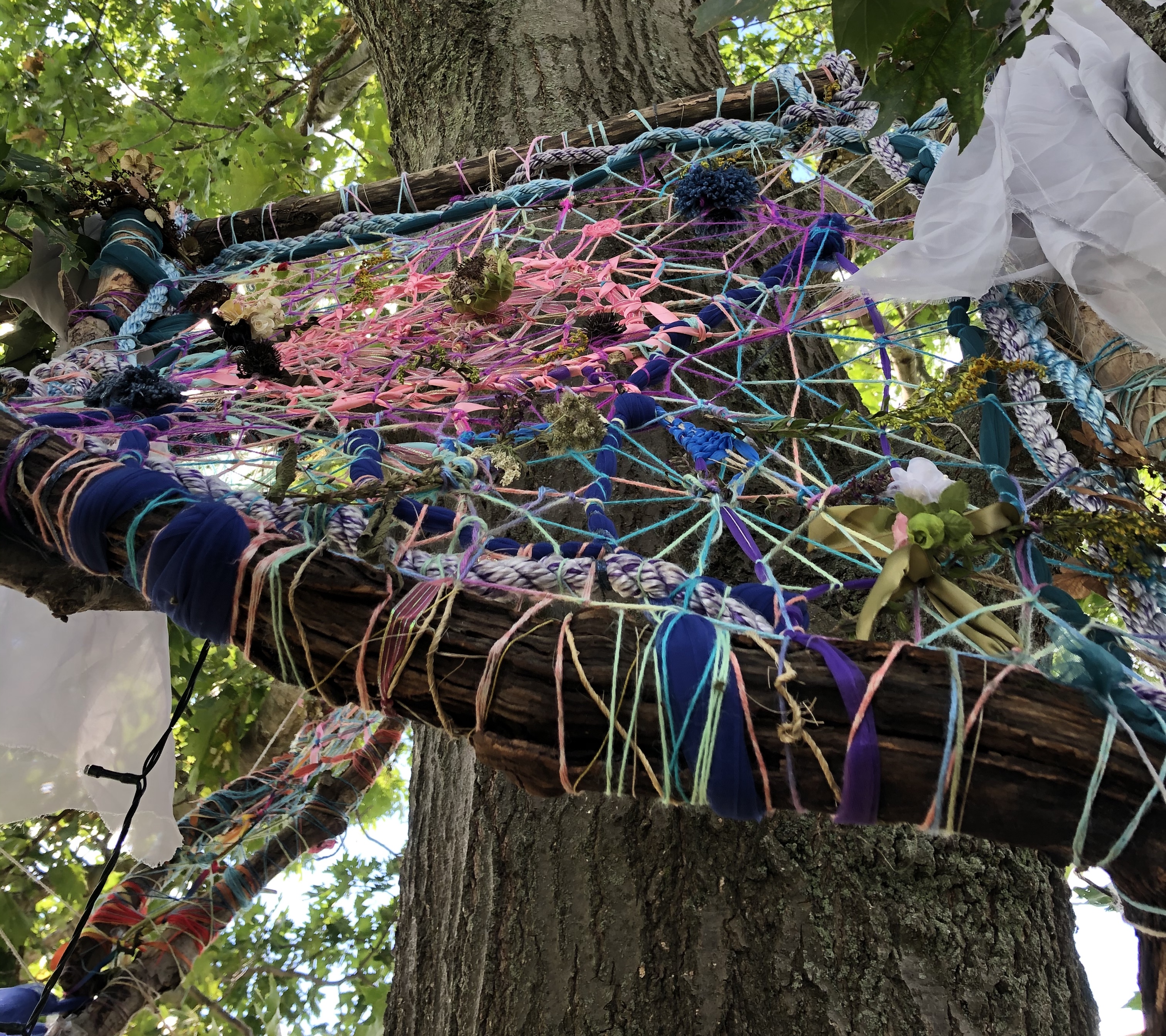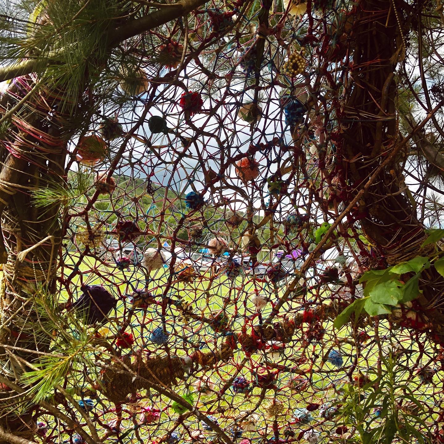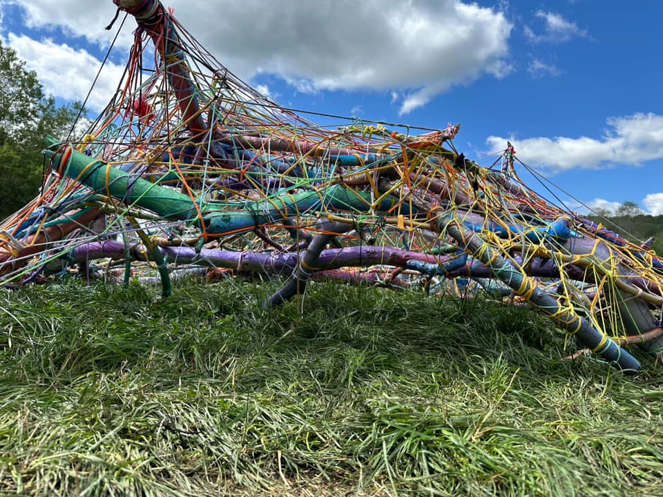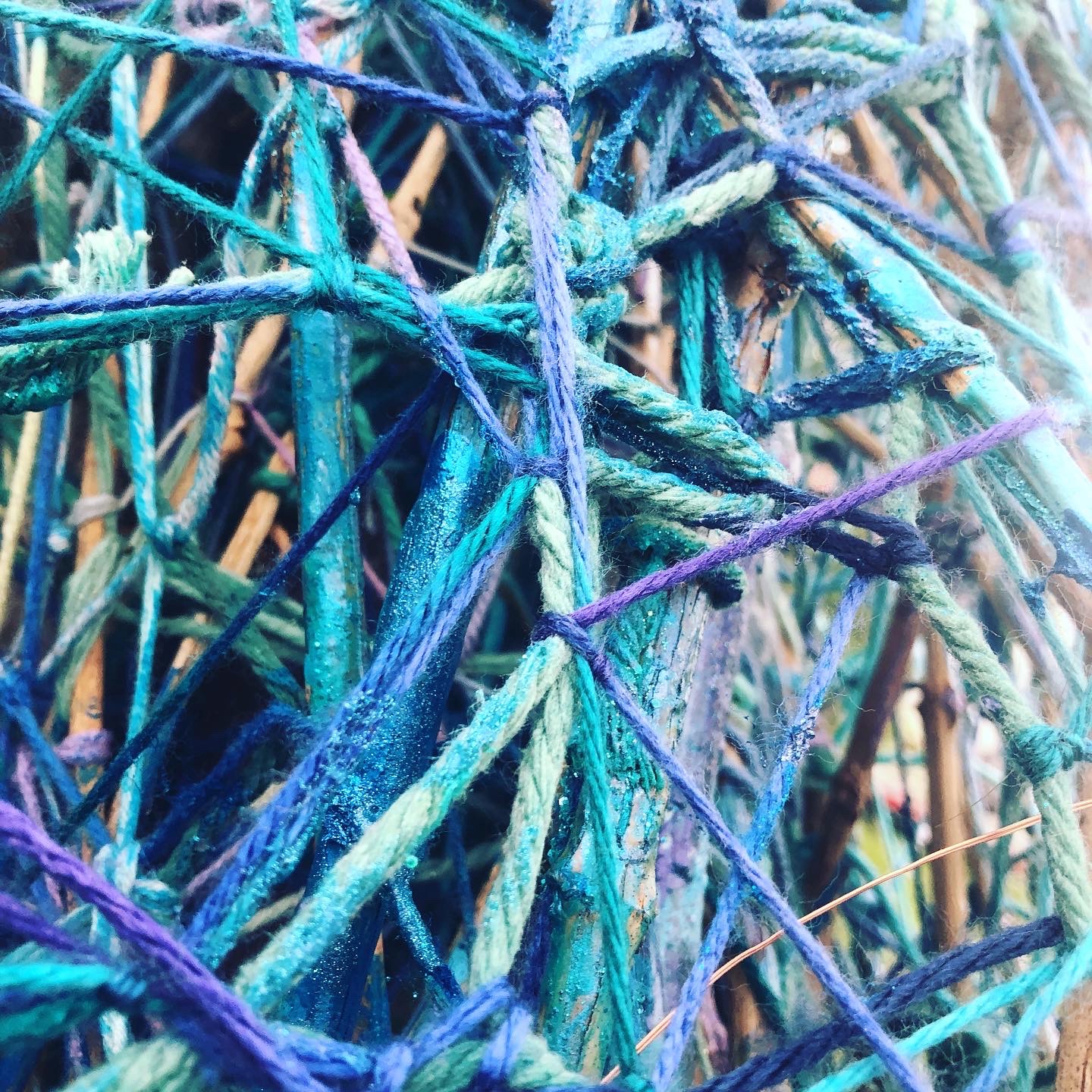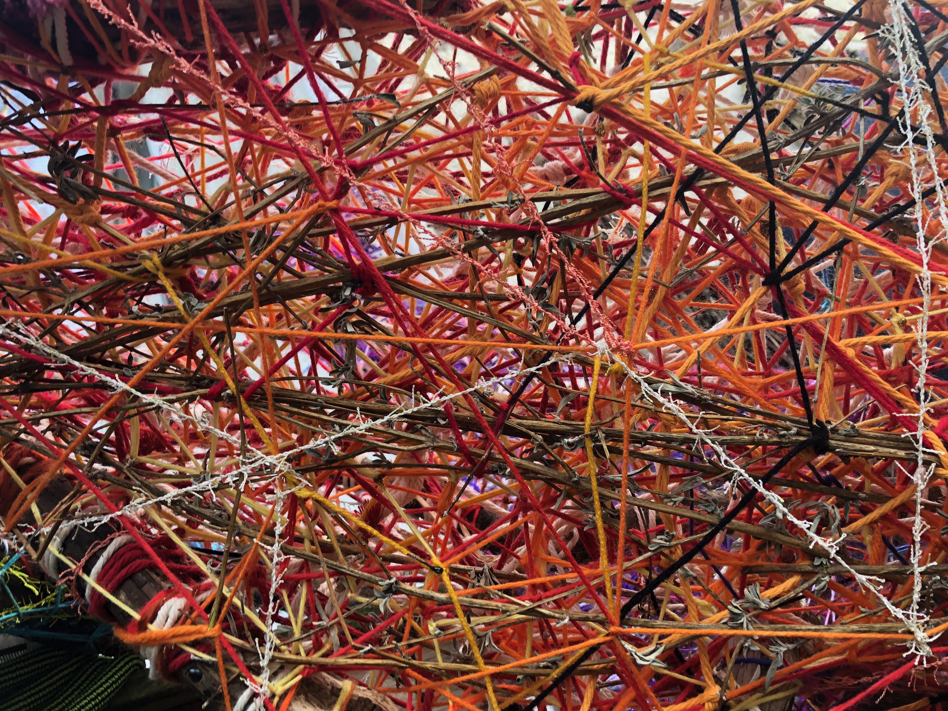Refugia is an installation built from modular art objects created with fallen branches bound together with rope and yarn. The structure of the installation makes a welcoming and protective space people can enter and pass through, integrating more fully with their environment and themselves. An inquiry into dynamic balance and non-Euclidian building architecture, the installation process uses minimal tools, gravity and no electricity. Refugia is shelter intended to draw viewers into and around its interior and exterior spaces, creating possibilities for refuge and reorientation.