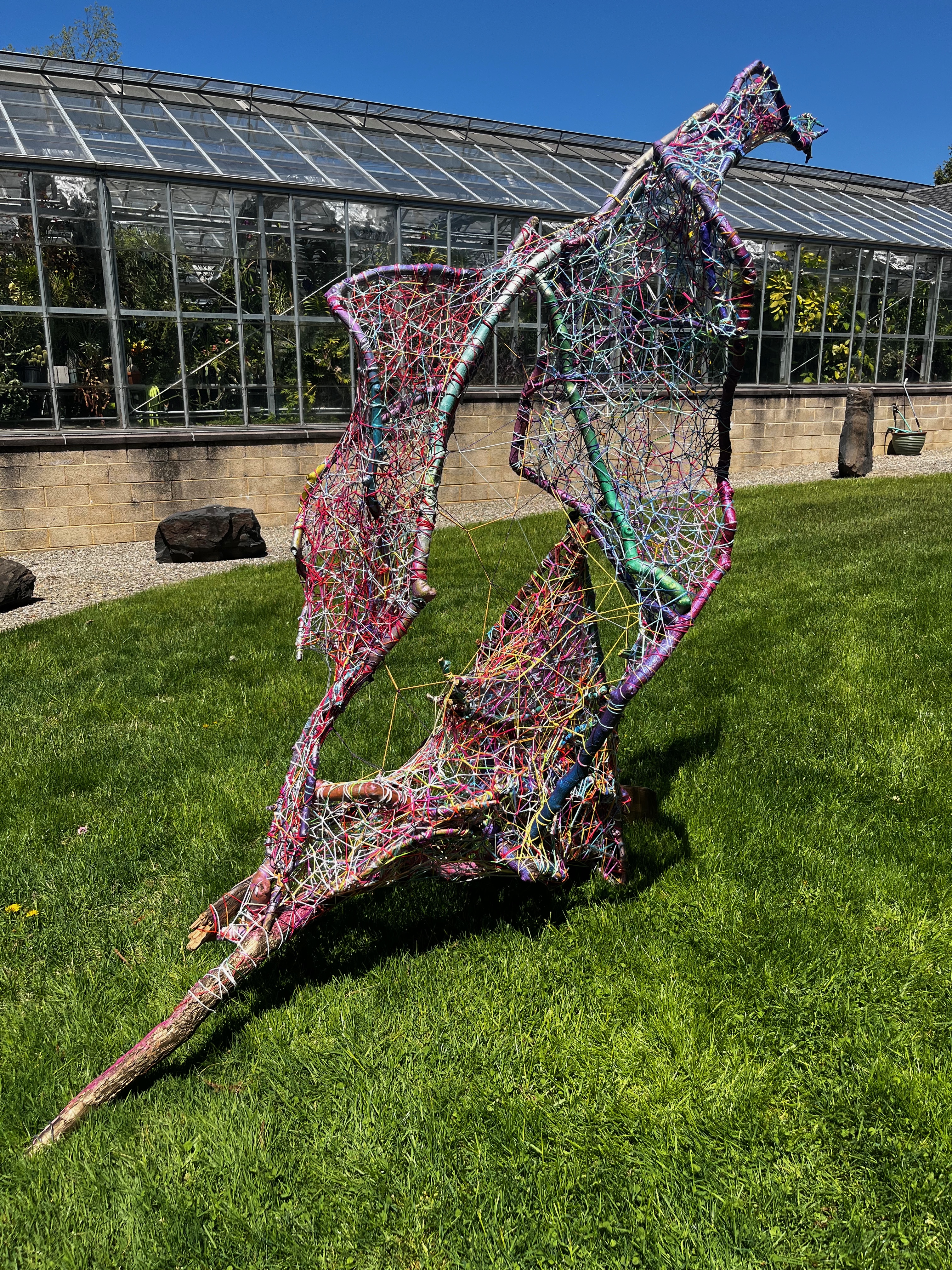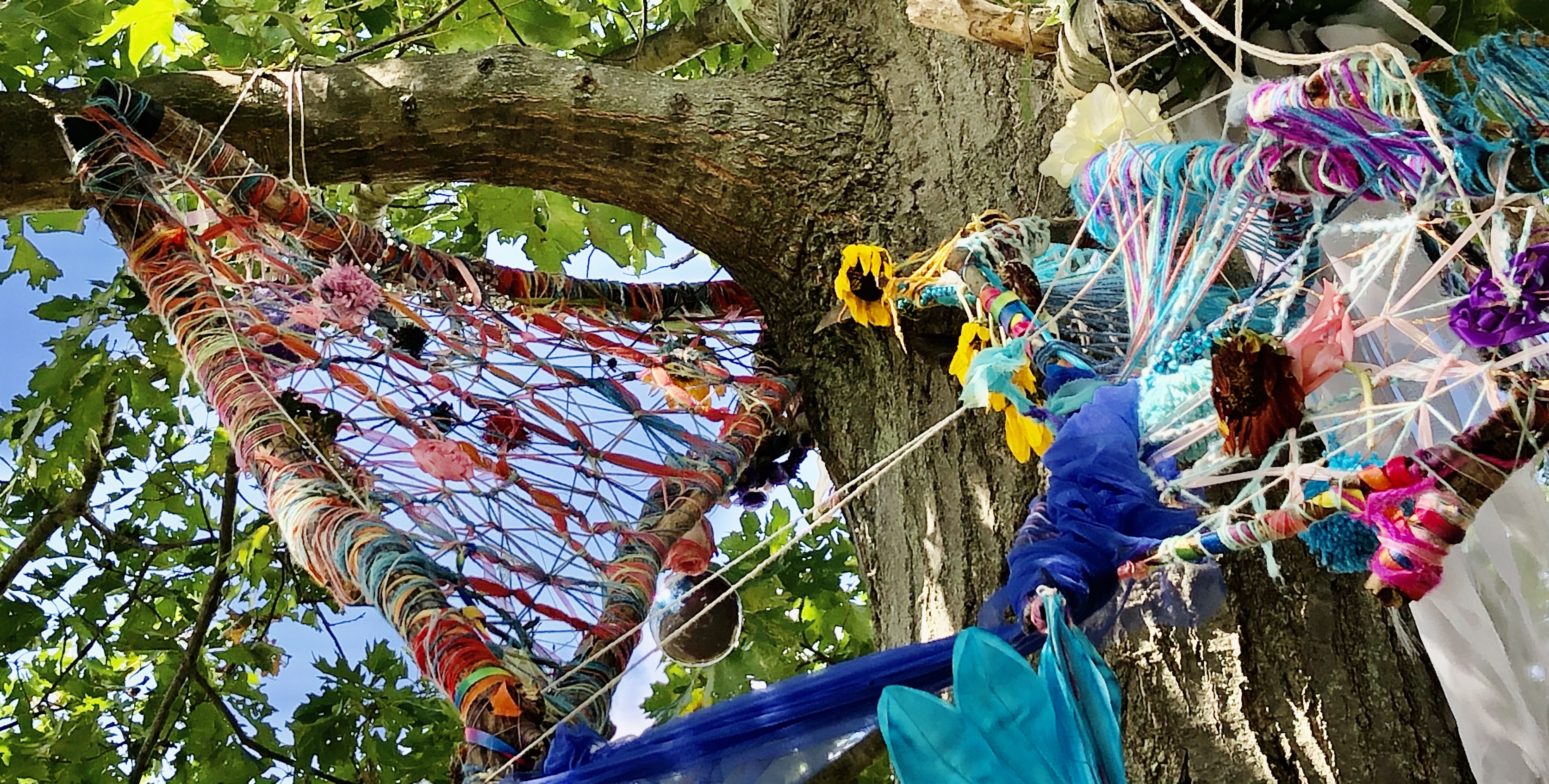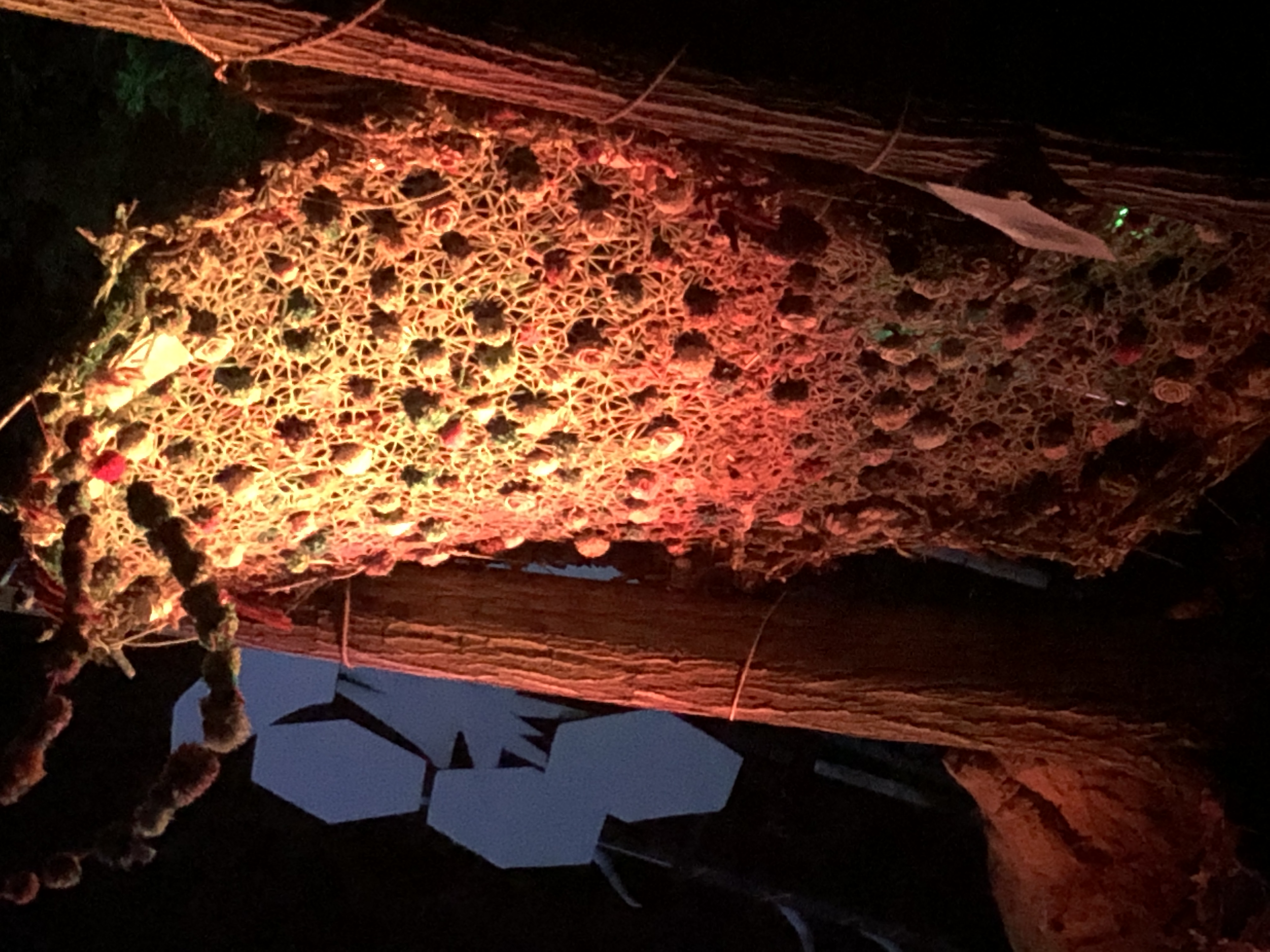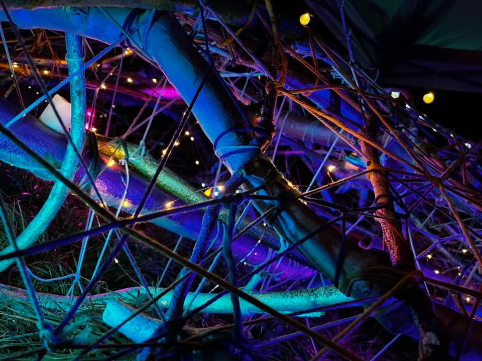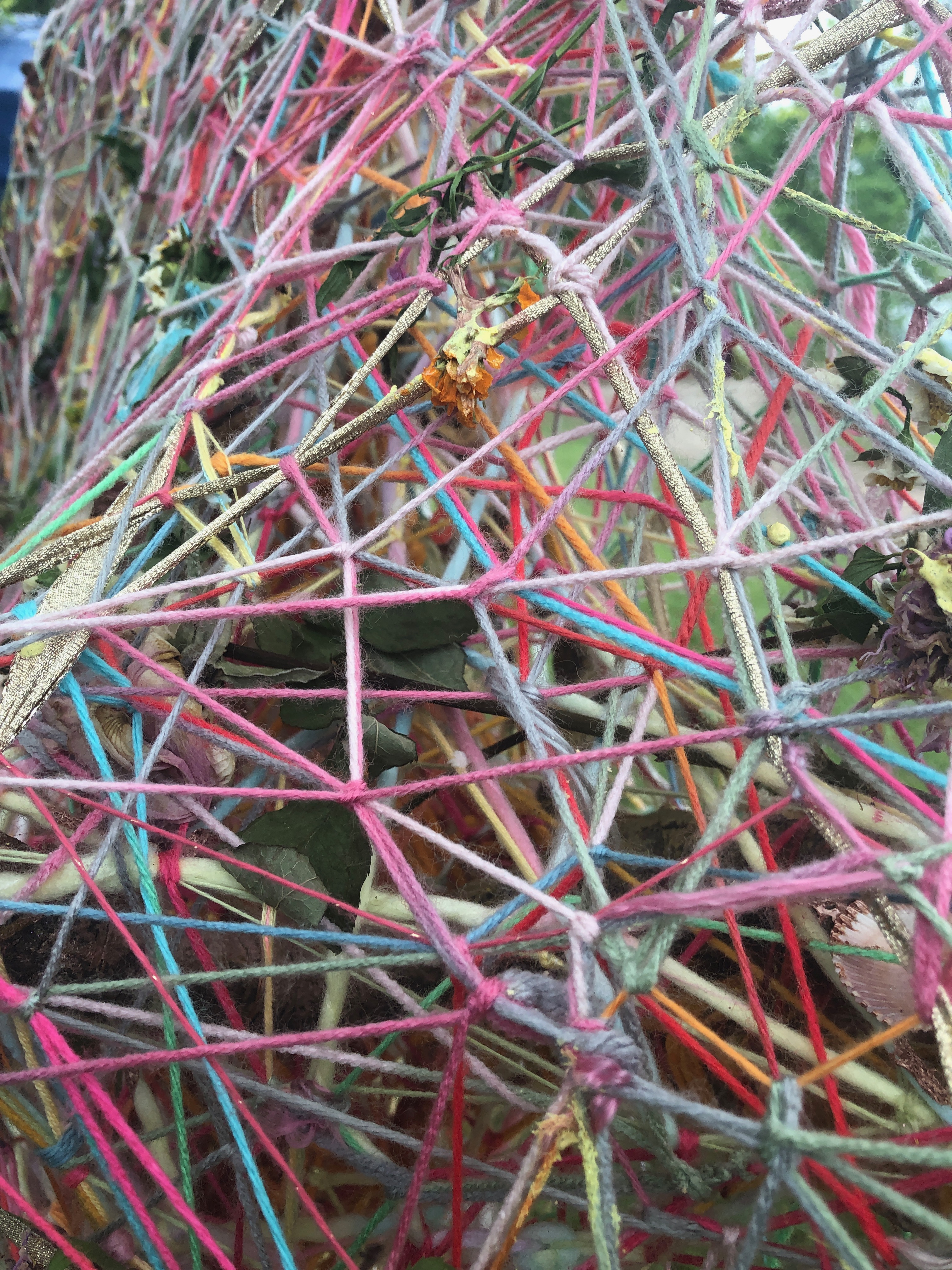 Refugia is an installation built from modular art objects created with fallen branches bound together with rope and yarn. The structure of the installation makes a welcoming and protective space people can enter and pass through, integrating more fully with their environment and themselves. An inquiry into dynamic balance and non-Euclidian building architecture, the installation process uses minimal tools, gravity and no electricity. Refugia is shelter intended to draw viewers into and around its interior and exterior spaces, creating possibilities for refuge and reorientation.