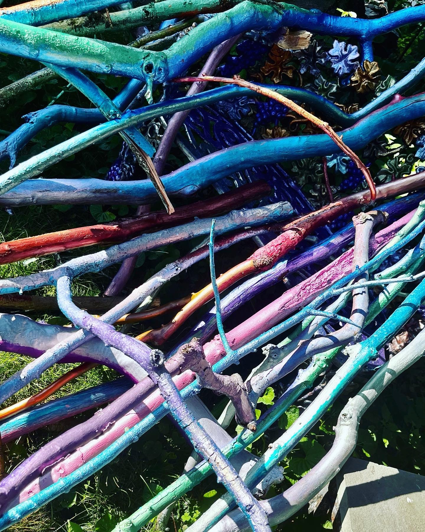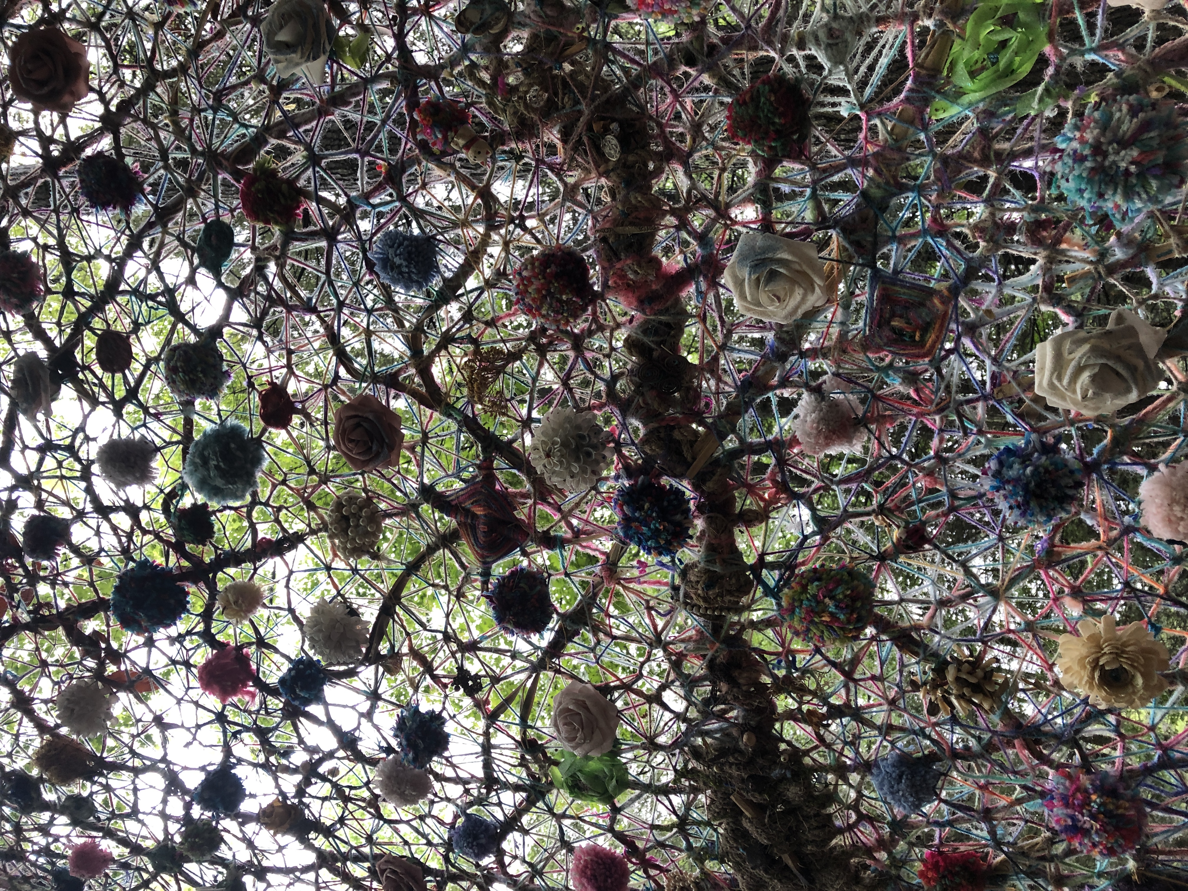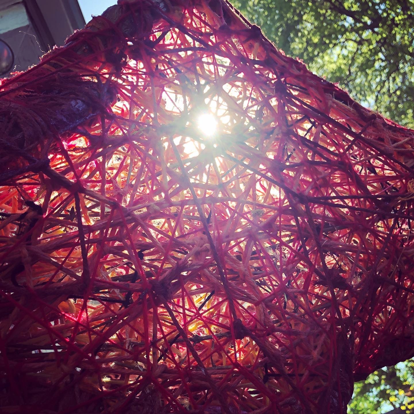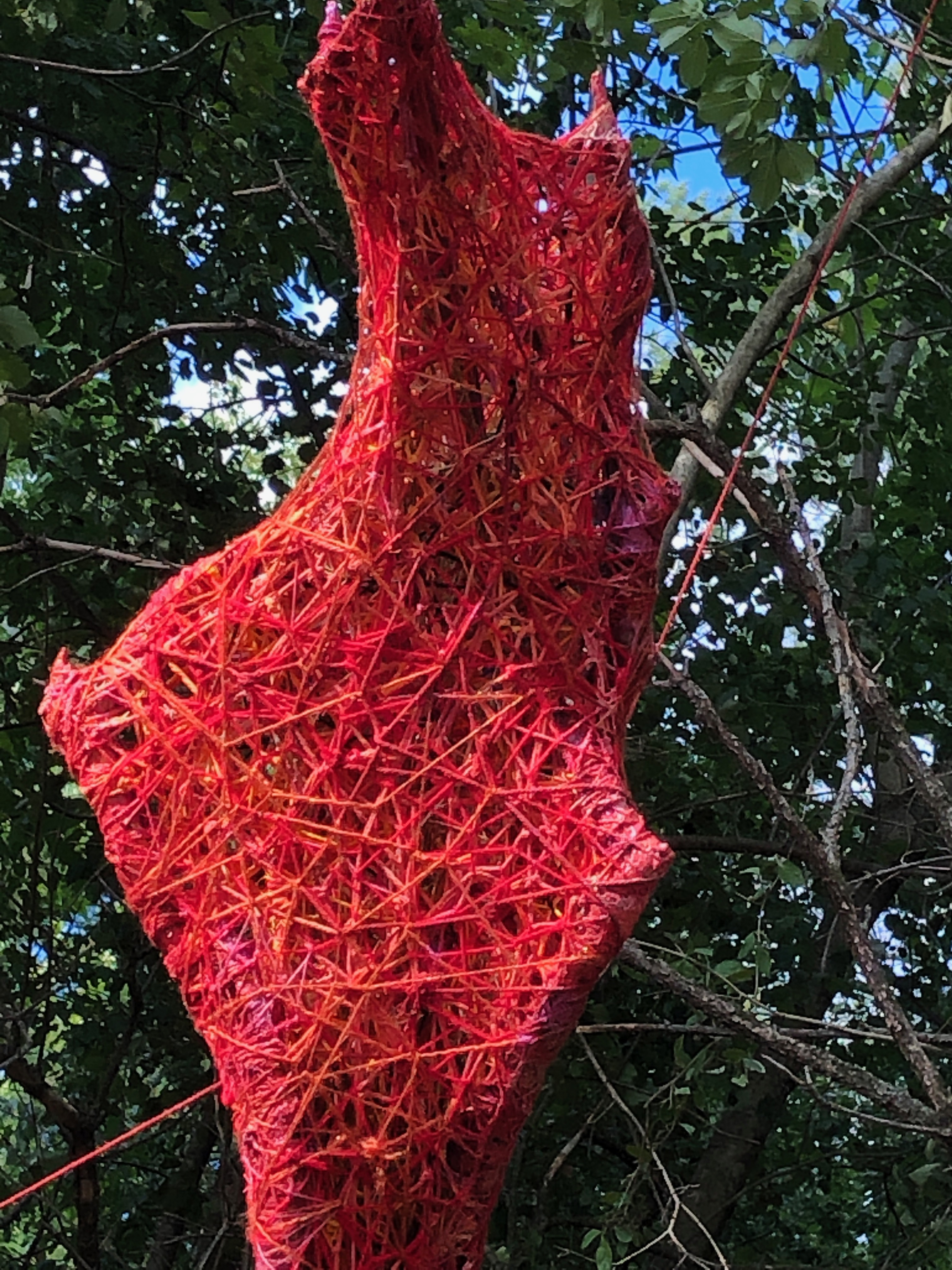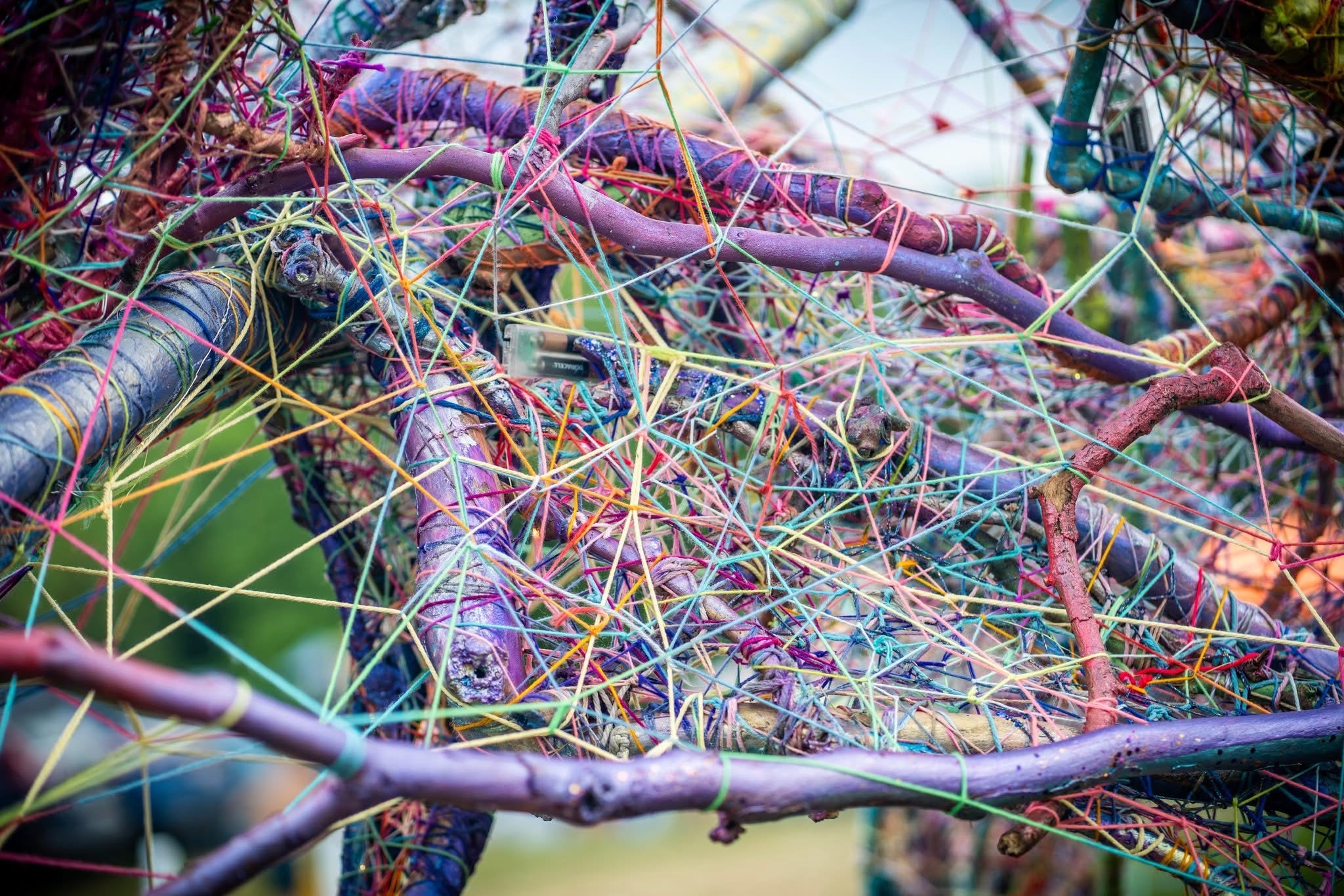 Refugia is an installation built from modular art objects created with fallen branches bound together with rope and yarn. The structure of the installation makes a welcoming and protective space people can enter and pass through, integrating more fully with their environment and themselves. An inquiry into dynamic balance and non-Euclidian building architecture, the installation process uses minimal tools, gravity and no electricity. Refugia is shelter intended to draw viewers into and around its interior and exterior spaces, creating possibilities for refuge and reorientation.