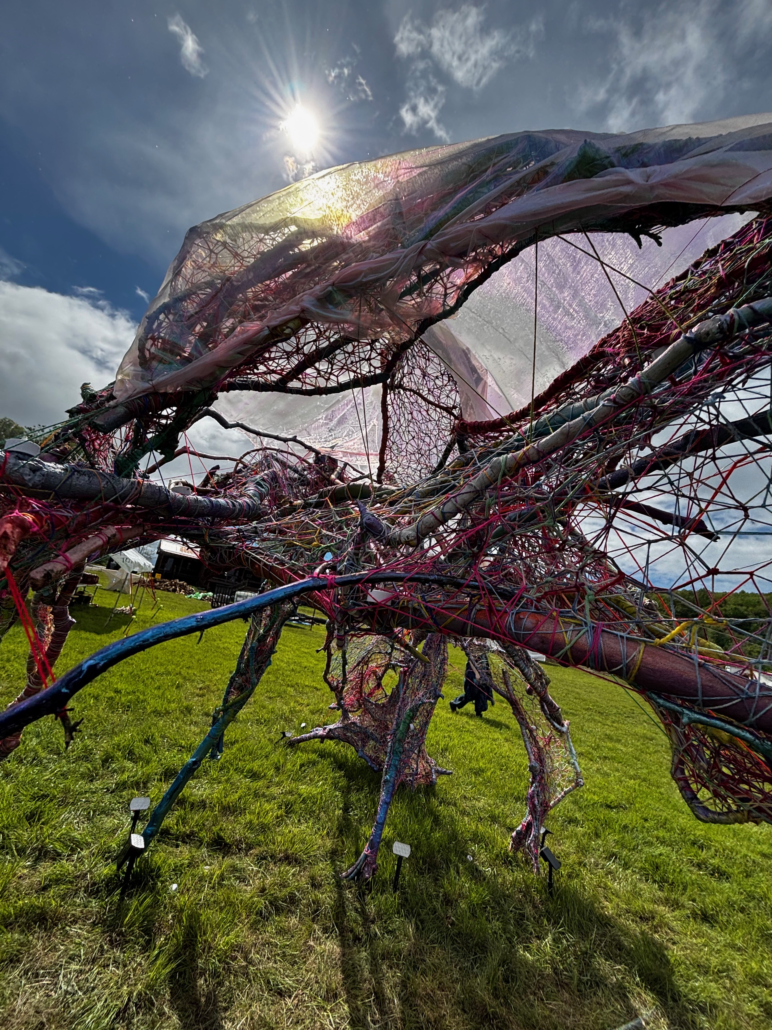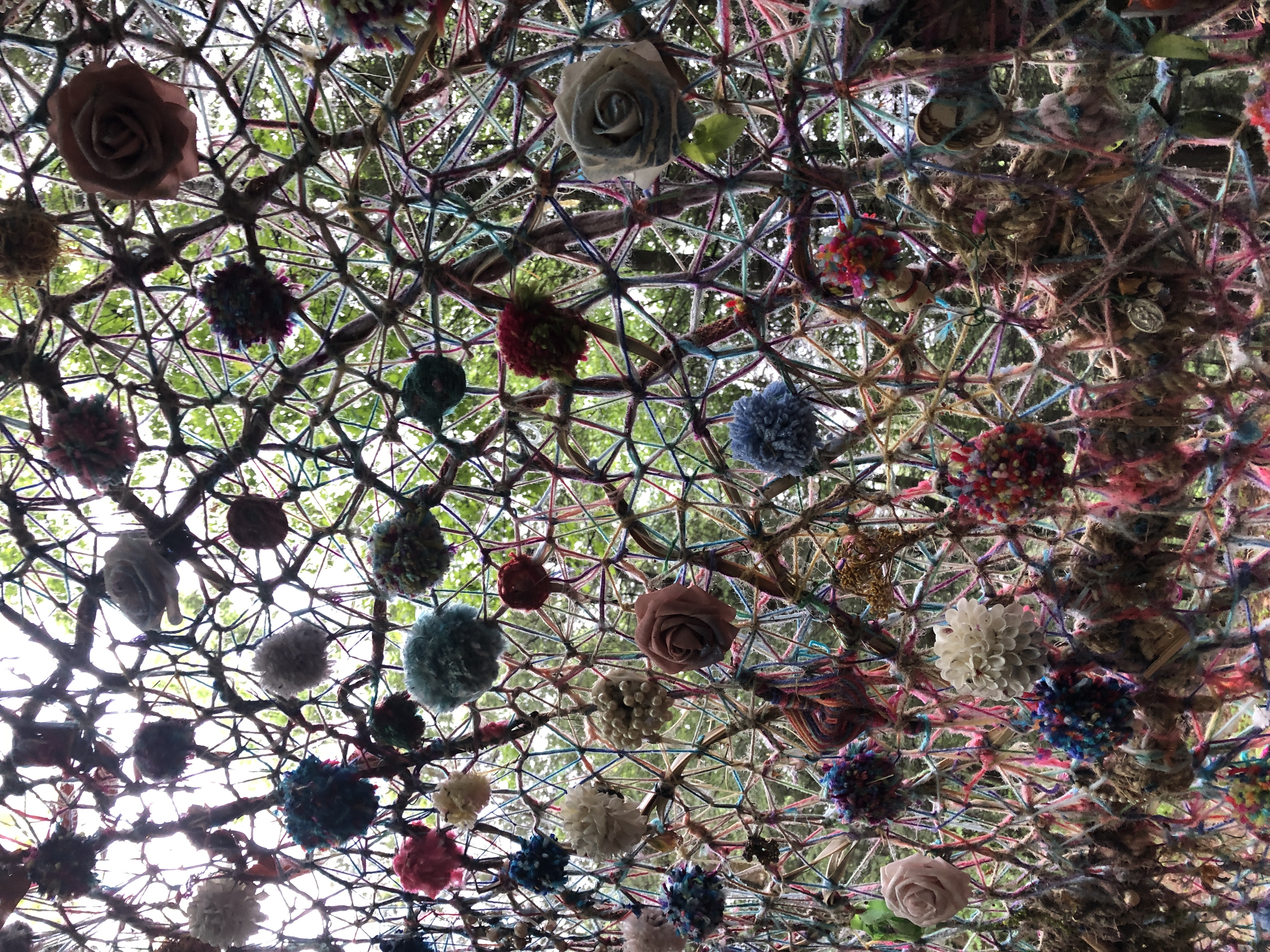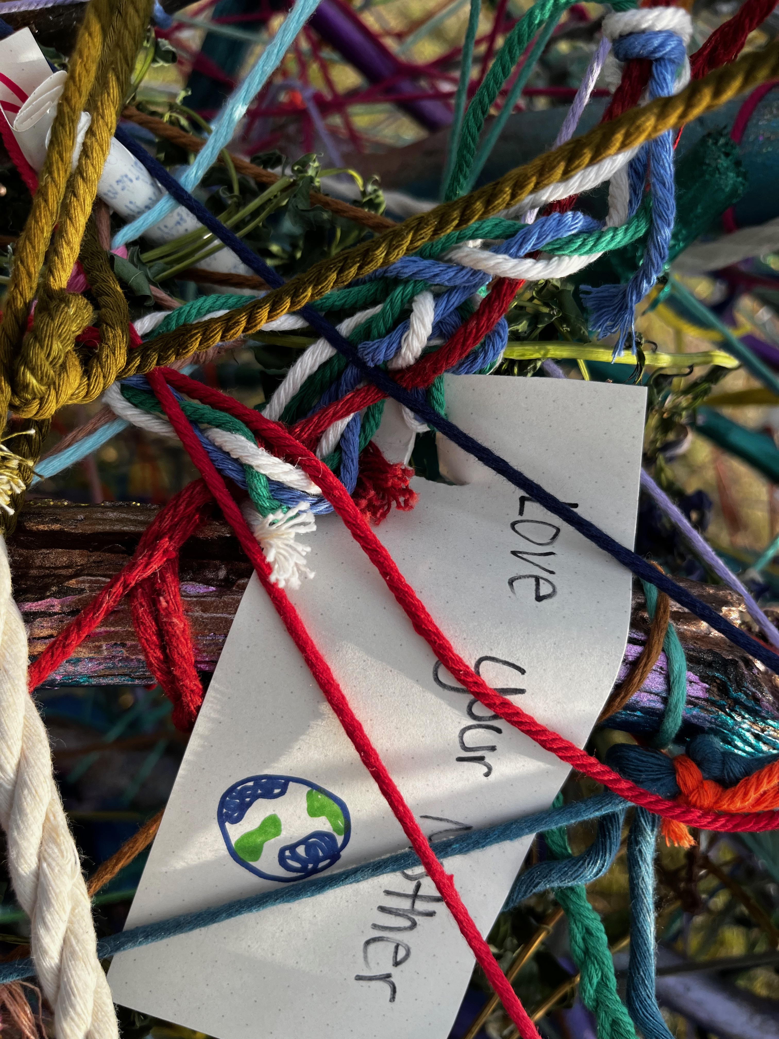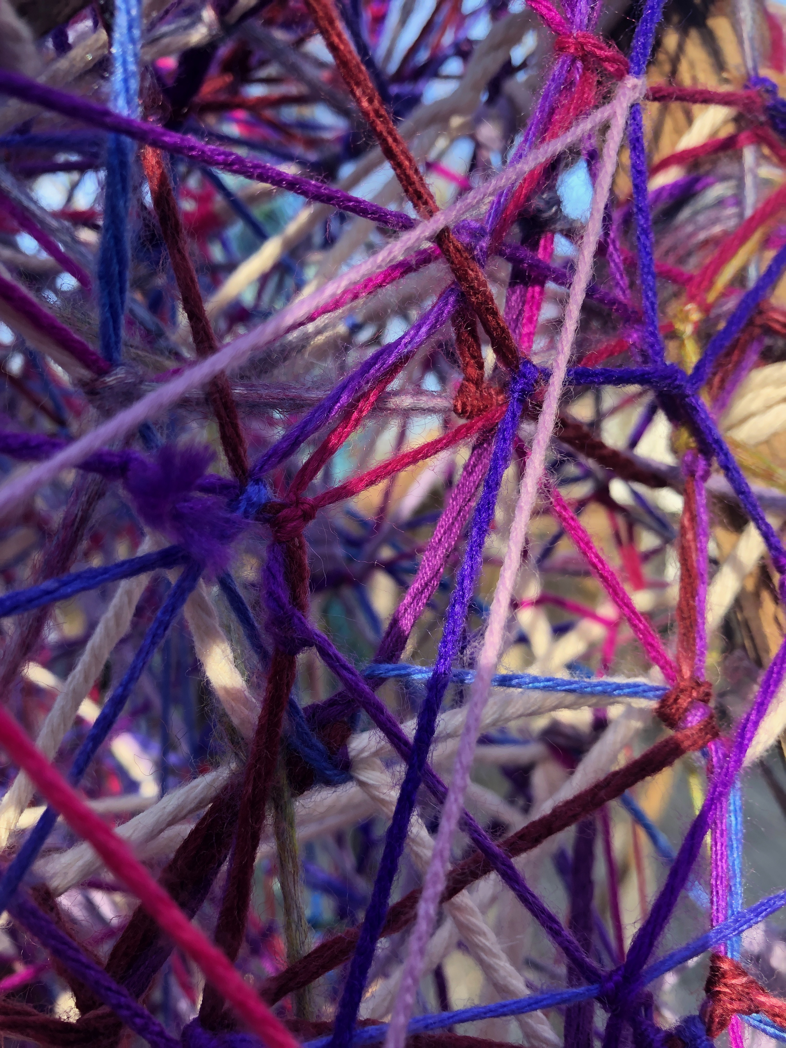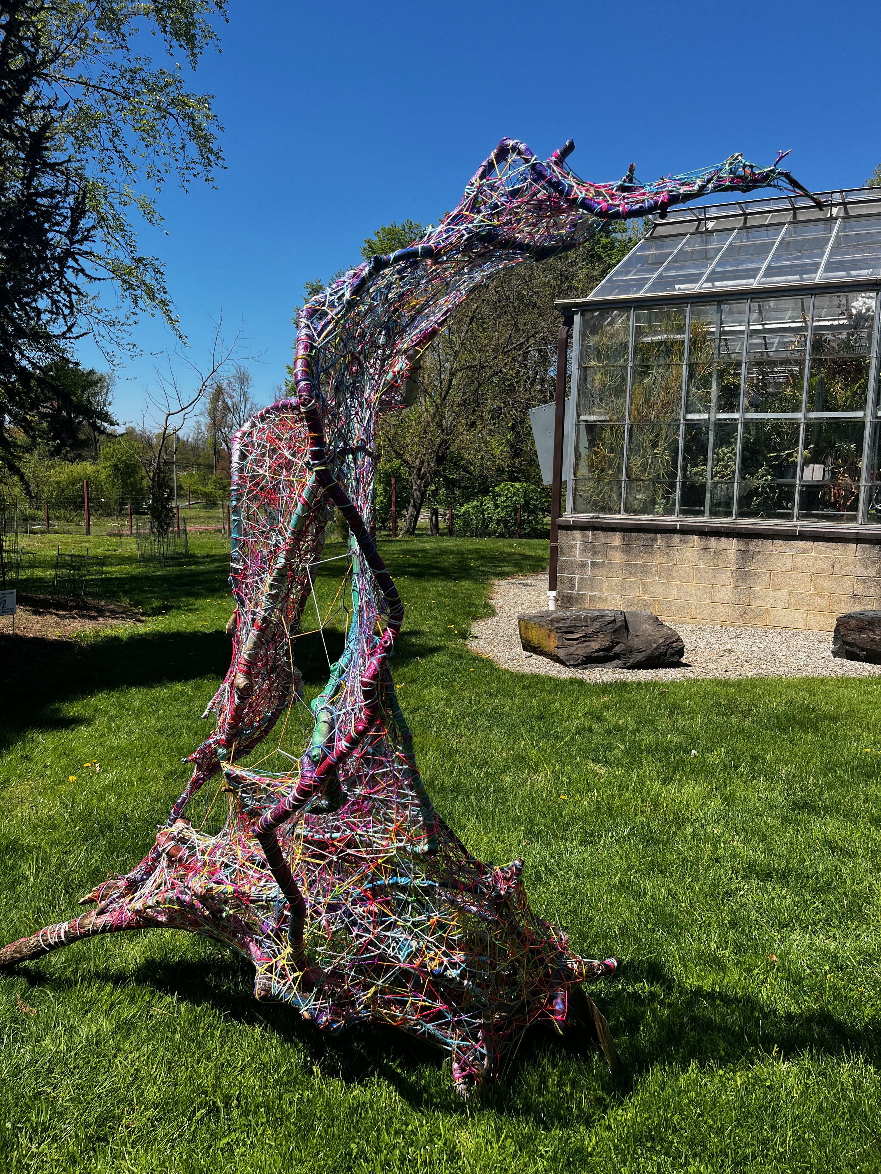 Refugia is an installation built from modular art objects created with fallen branches bound together with rope and yarn. The structure of the installation makes a welcoming and protective space people can enter and pass through, integrating more fully with their environment and themselves. An inquiry into dynamic balance and non-Euclidian building architecture, the installation process uses minimal tools, gravity and no electricity. Refugia is shelter intended to draw viewers into and around its interior and exterior spaces, creating possibilities for refuge and reorientation.