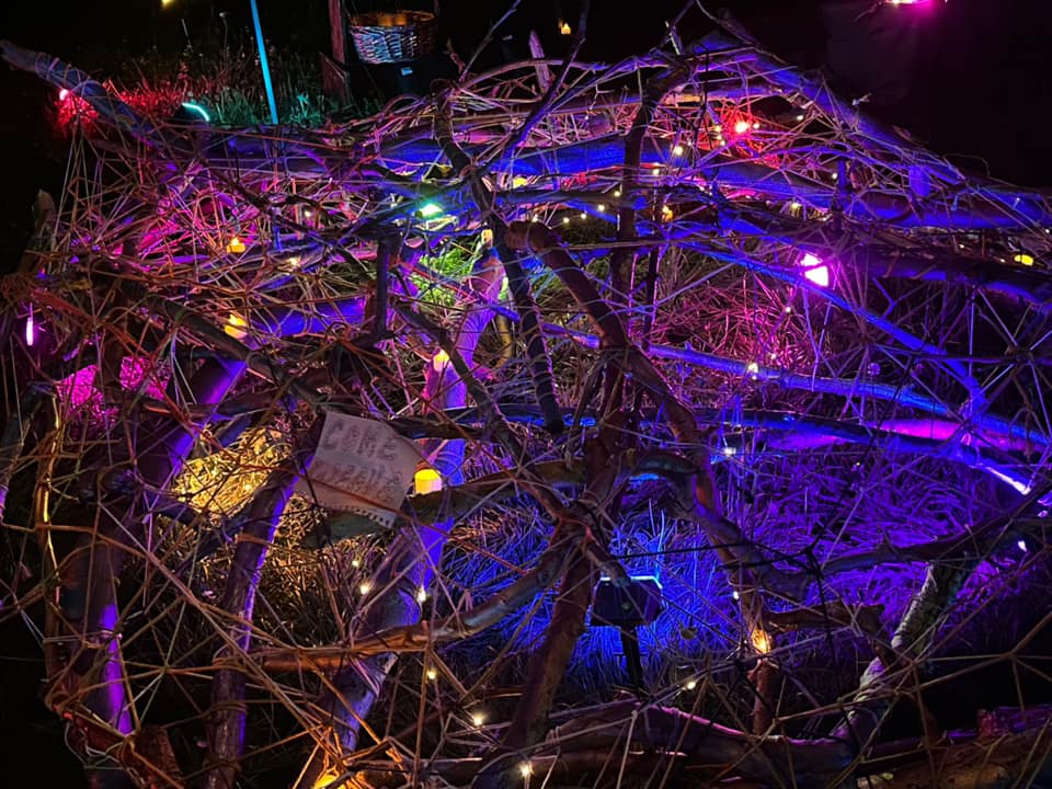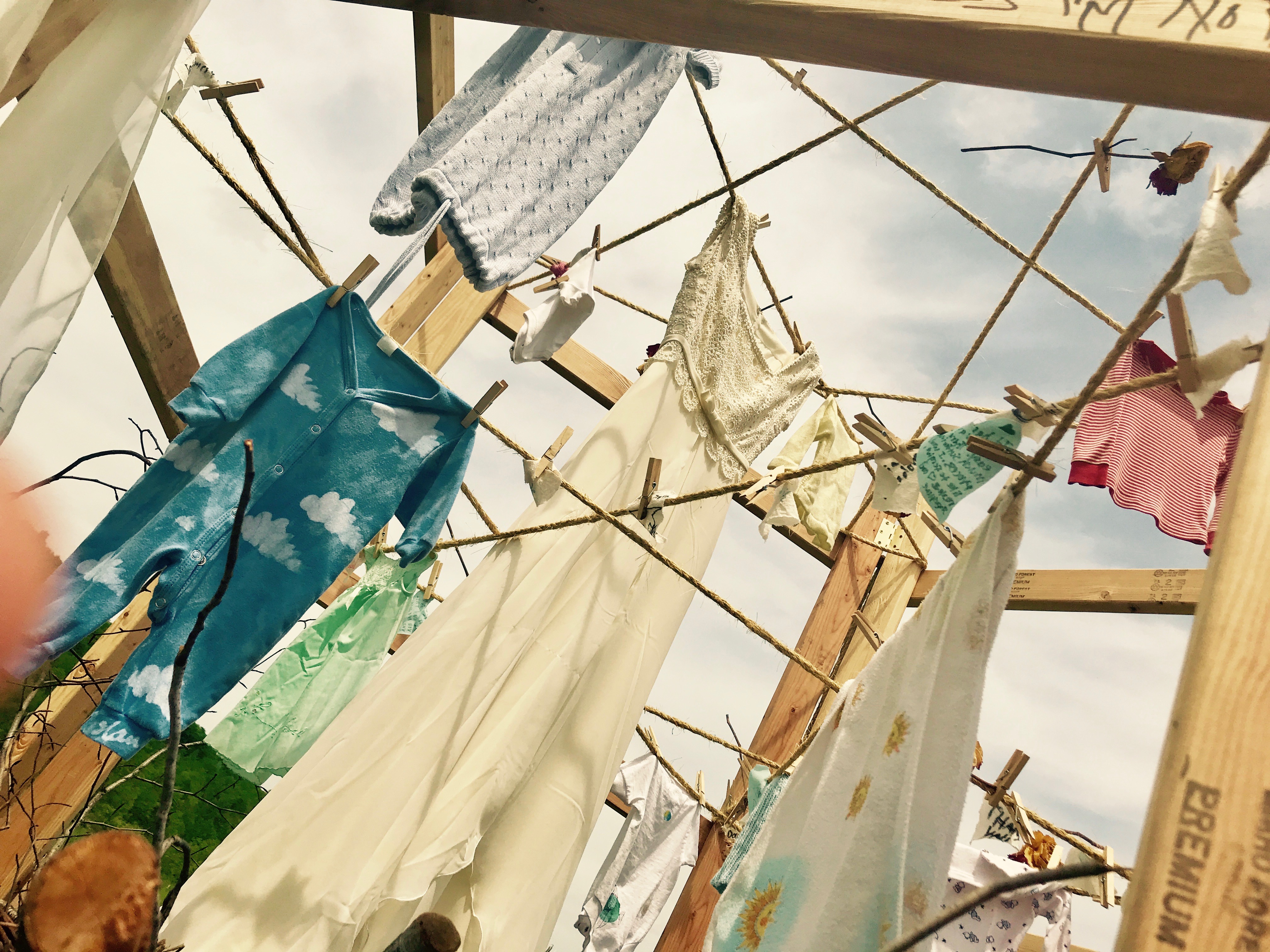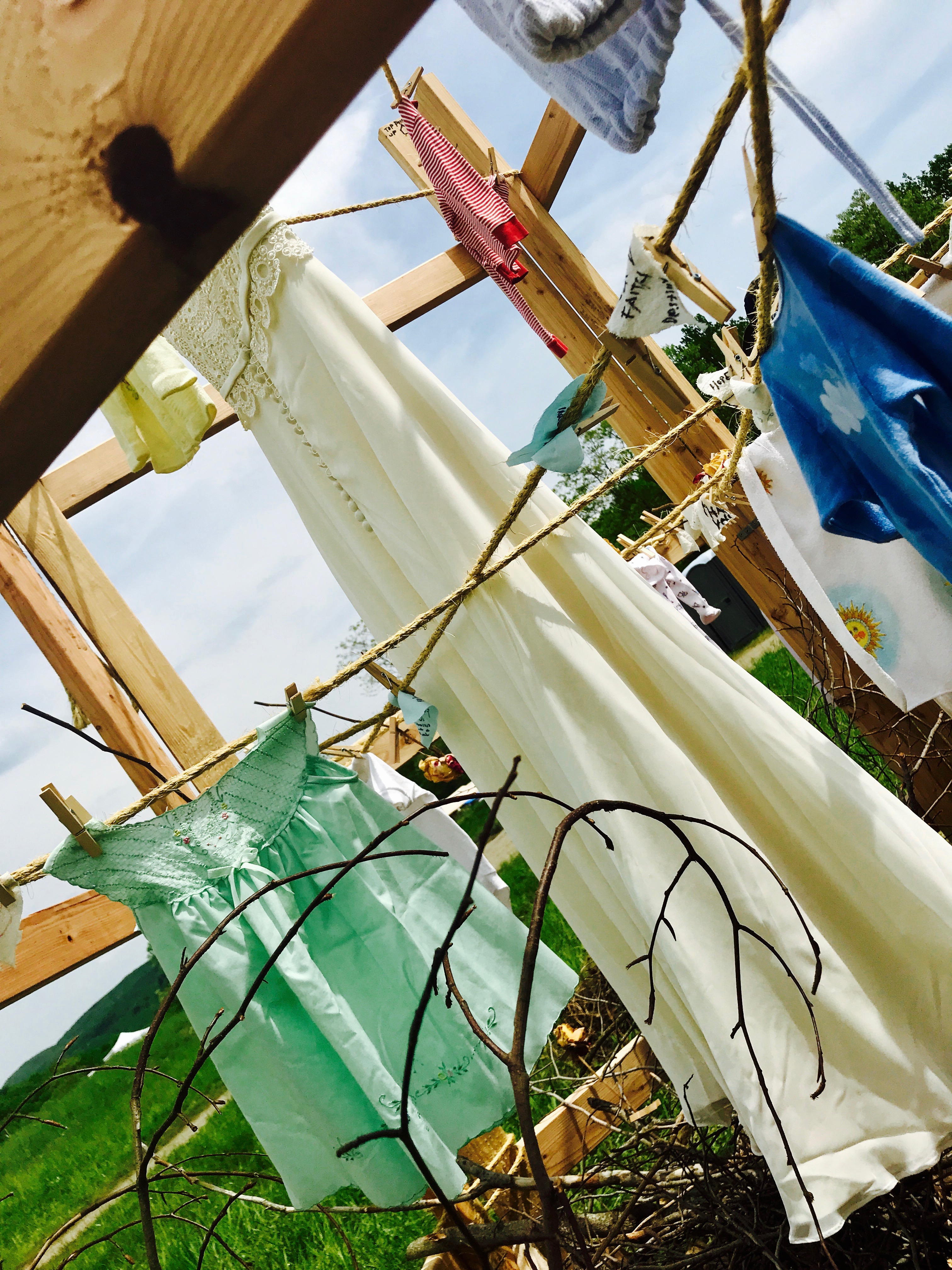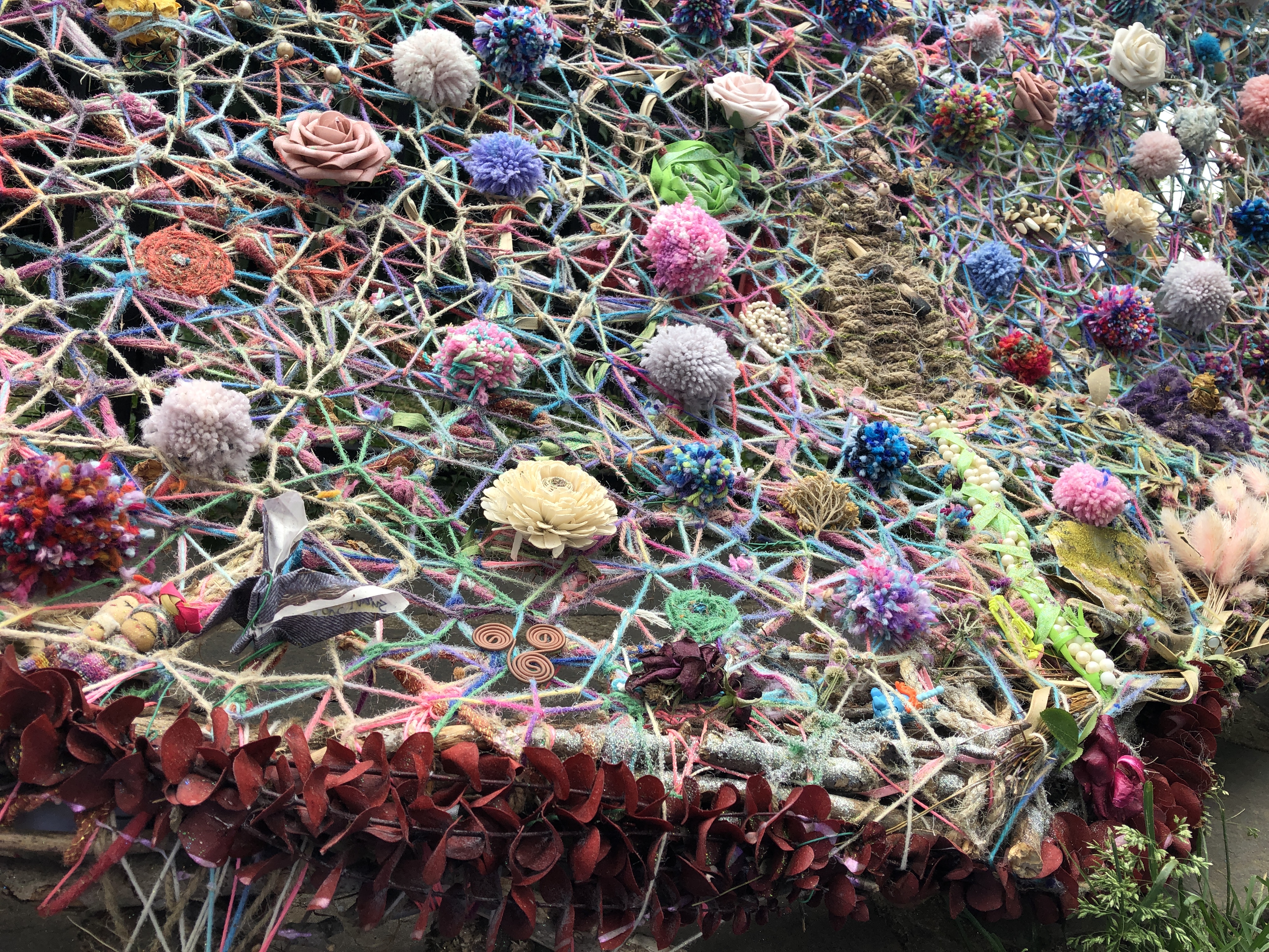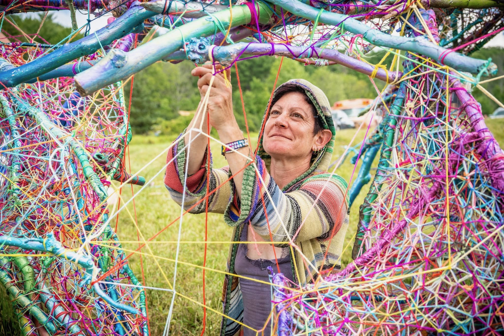 Refugia is an installation built from modular art objects created with fallen branches bound together with rope and yarn. The structure of the installation makes a welcoming and protective space people can enter and pass through, integrating more fully with their environment and themselves. An inquiry into dynamic balance and non-Euclidian building architecture, the installation process uses minimal tools, gravity and no electricity. Refugia is shelter intended to draw viewers into and around its interior and exterior spaces, creating possibilities for refuge and reorientation.
