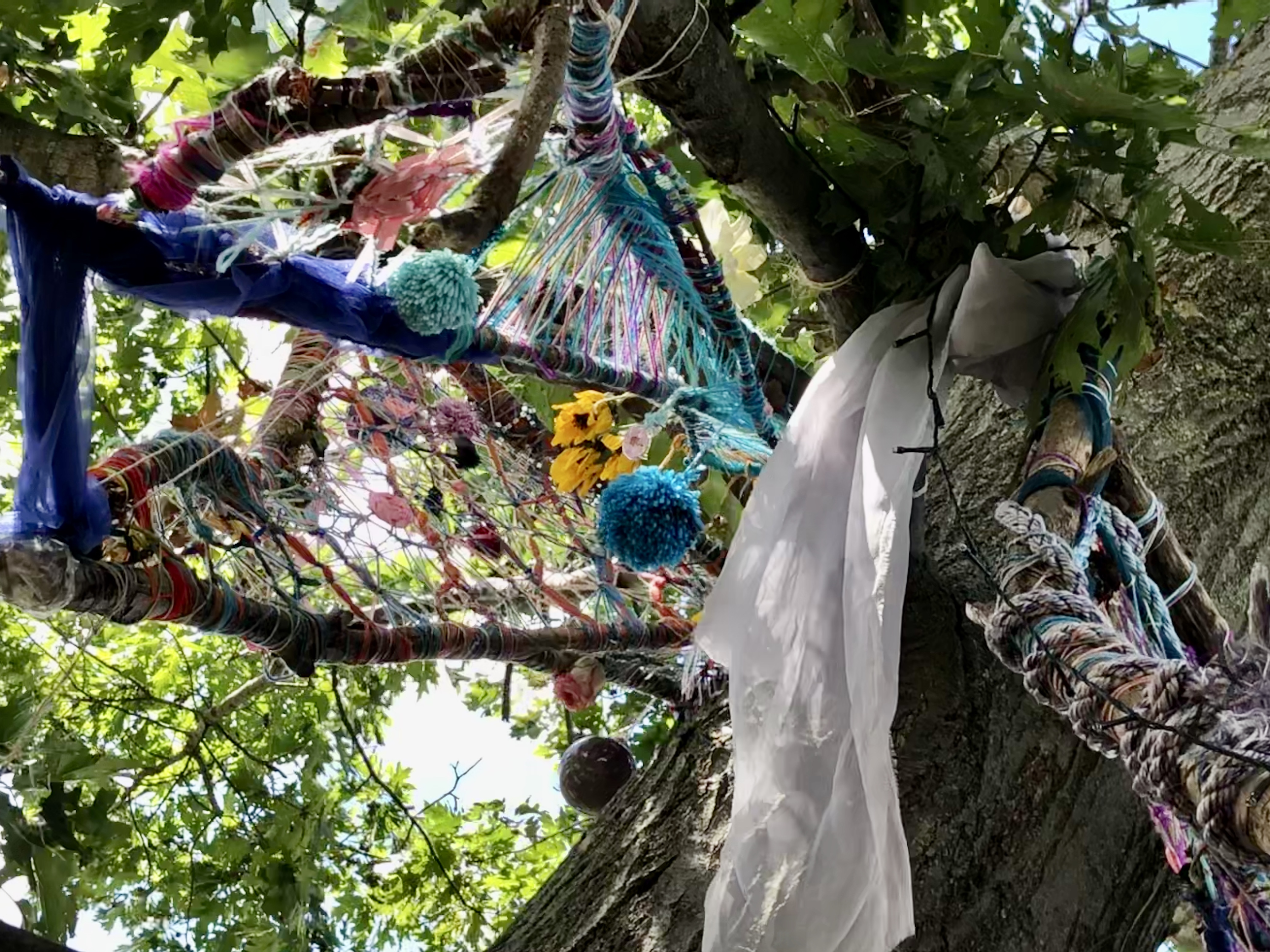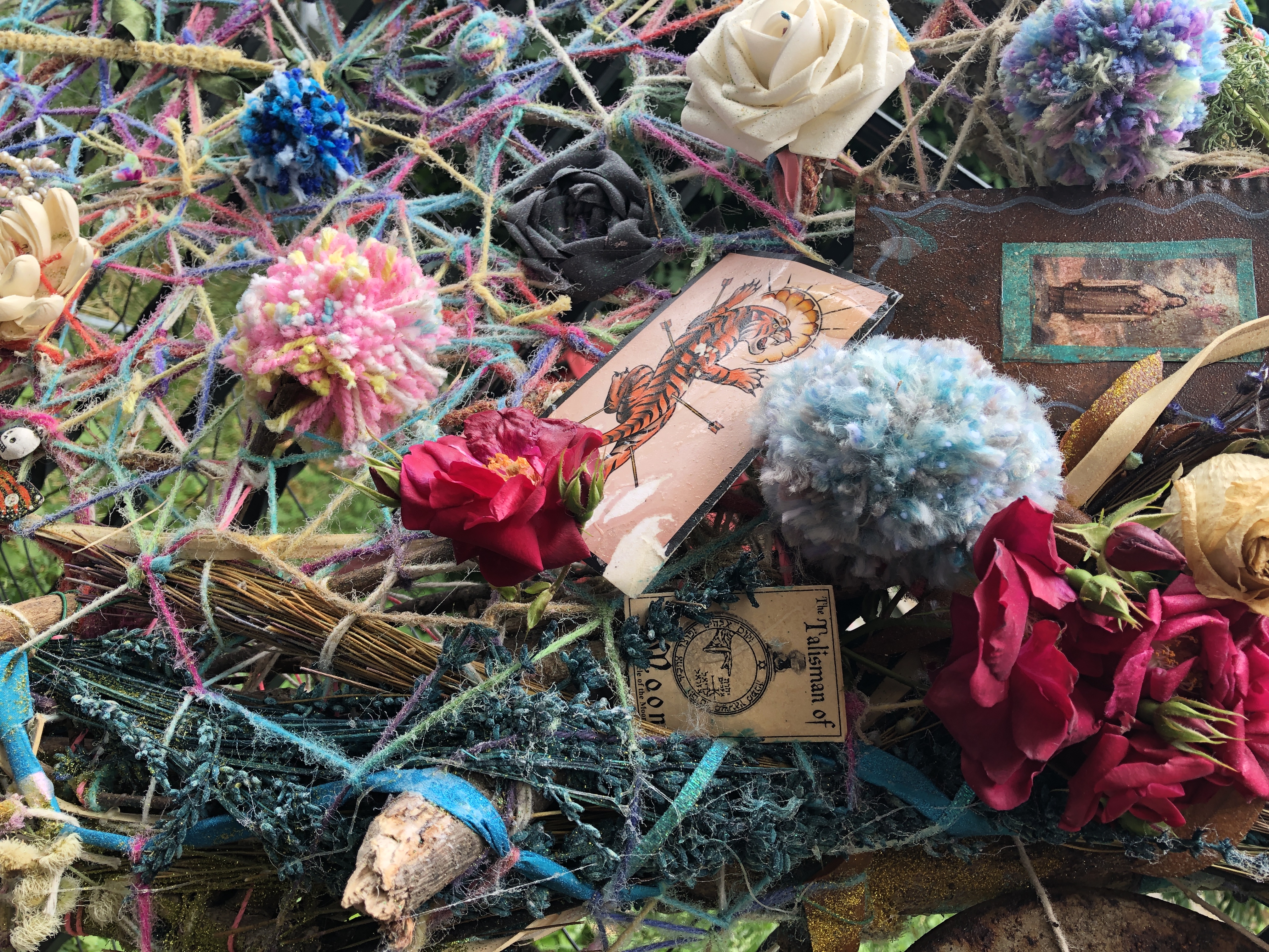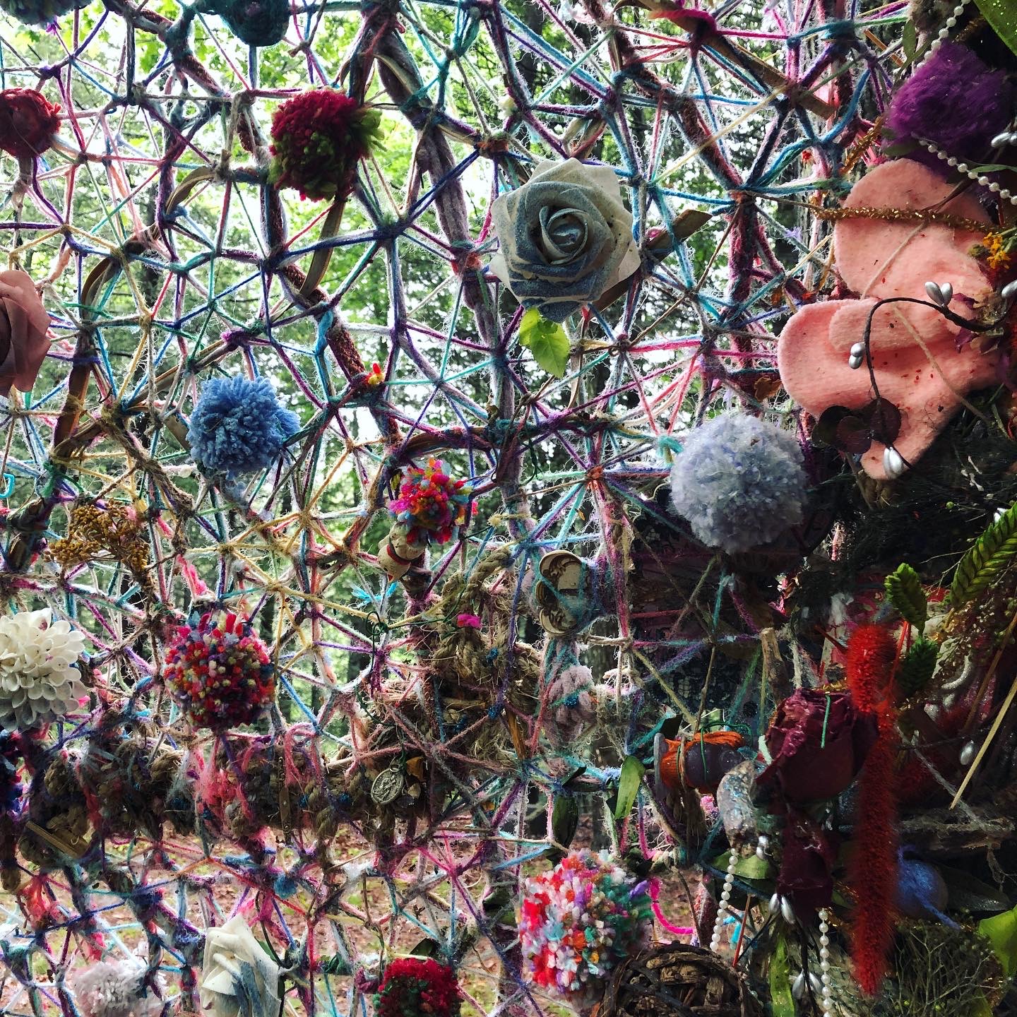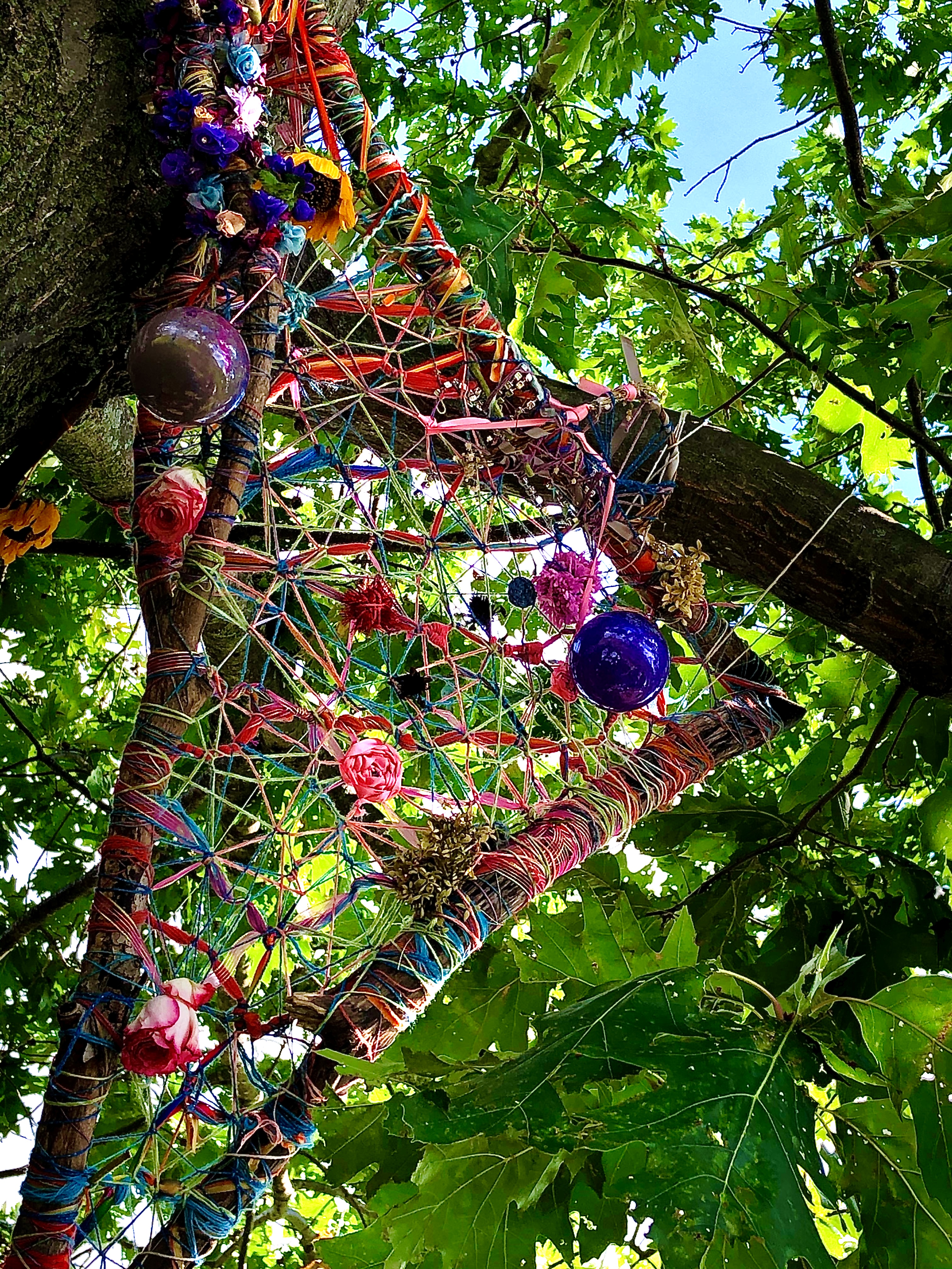 o Voyage of the Maiden: Voyage of the Maiden is a 3 layered five sided structure which creates a sacred space of remembrance and honoring. It is a portal to a liminal space in which memories can be conjured, drawn forth and then released with love. The tripartite form of the piece reflects the maiden/mother/crone cycle of the witch/goddess. It reflects the journey of a mythical heroine as she crosses a threshold into the next phase of her story cycle. The 5 pointed stars within these 3 layers invoke the elements of the universe so that they can guide this voyage toward the true and alighted path.