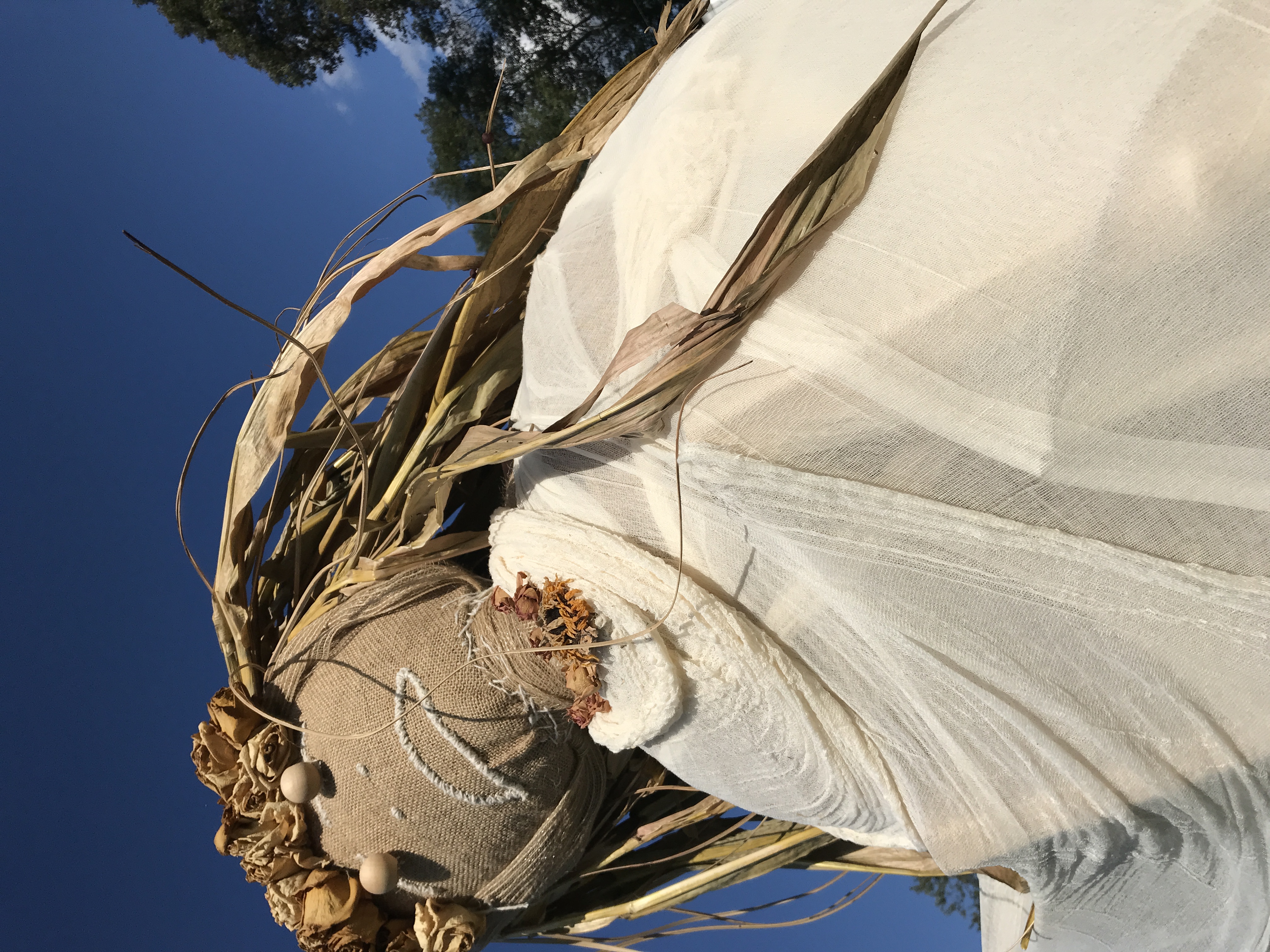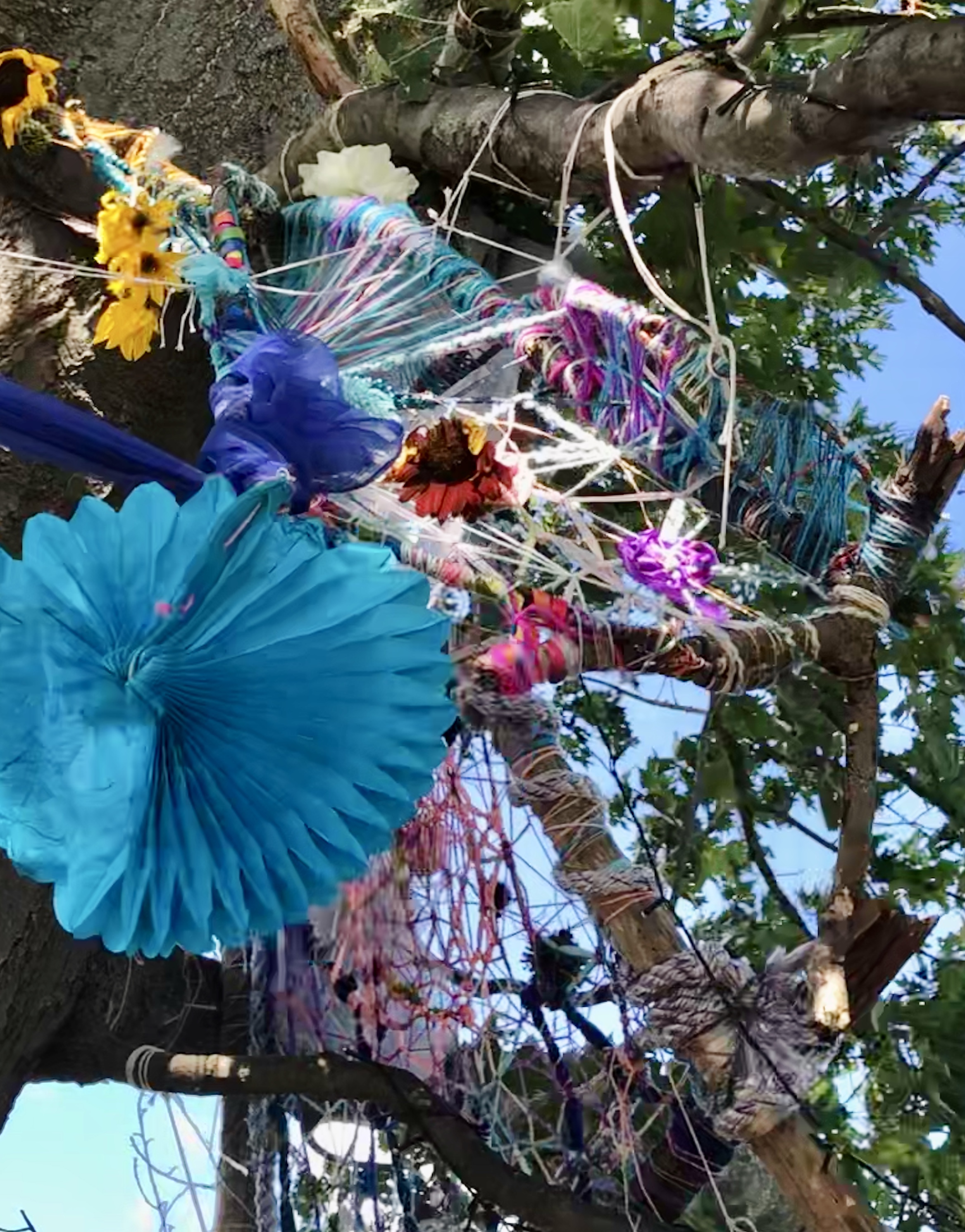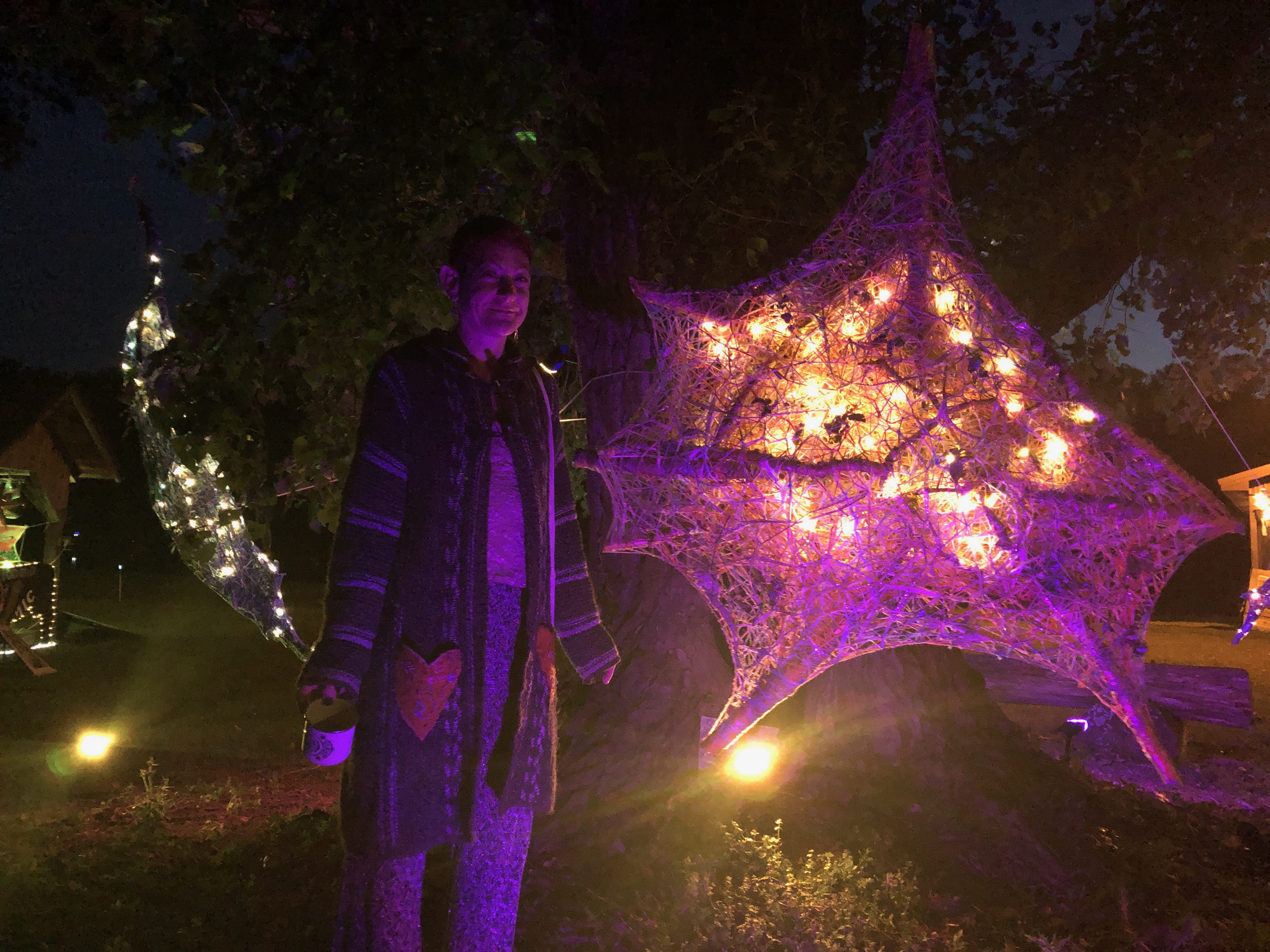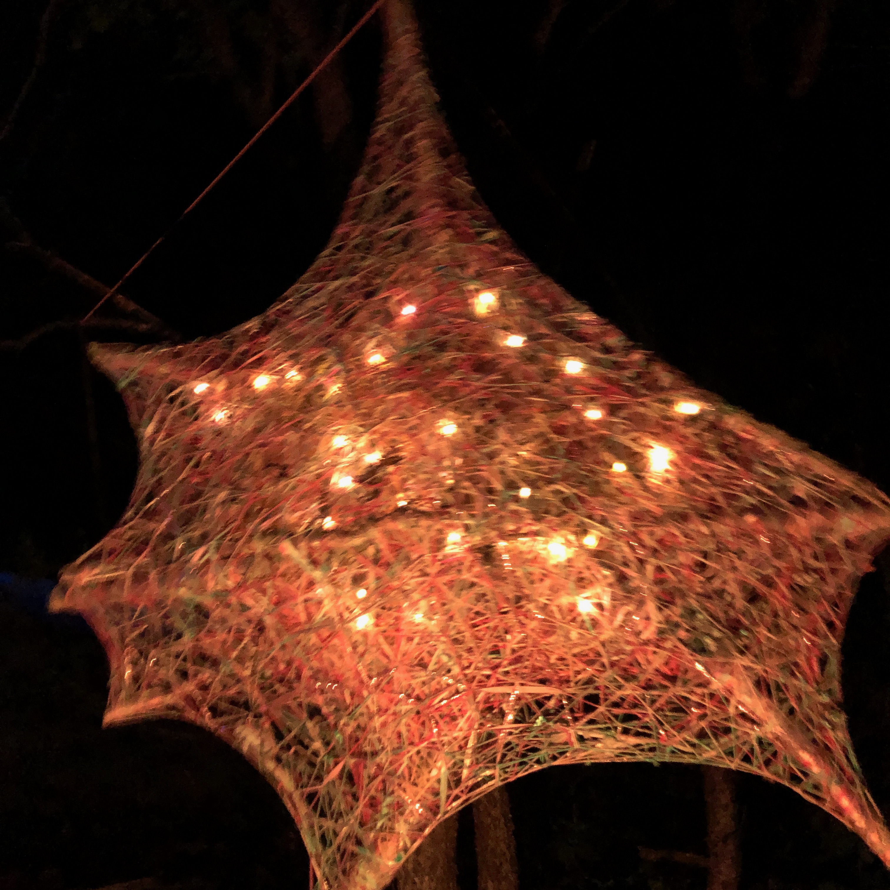 o Voyage of the Maiden: Voyage of the Maiden is a 3 layered five sided structure which creates a sacred space of remembrance and honoring. It is a portal to a liminal space in which memories can be conjured, drawn forth and then released with love. The tripartite form of the piece reflects the maiden/mother/crone cycle of the witch/goddess. It reflects the journey of a mythical heroine as she crosses a threshold into the next phase of her story cycle. The 5 pointed stars within these 3 layers invoke the elements of the universe so that they can guide this voyage toward the true and alighted path.