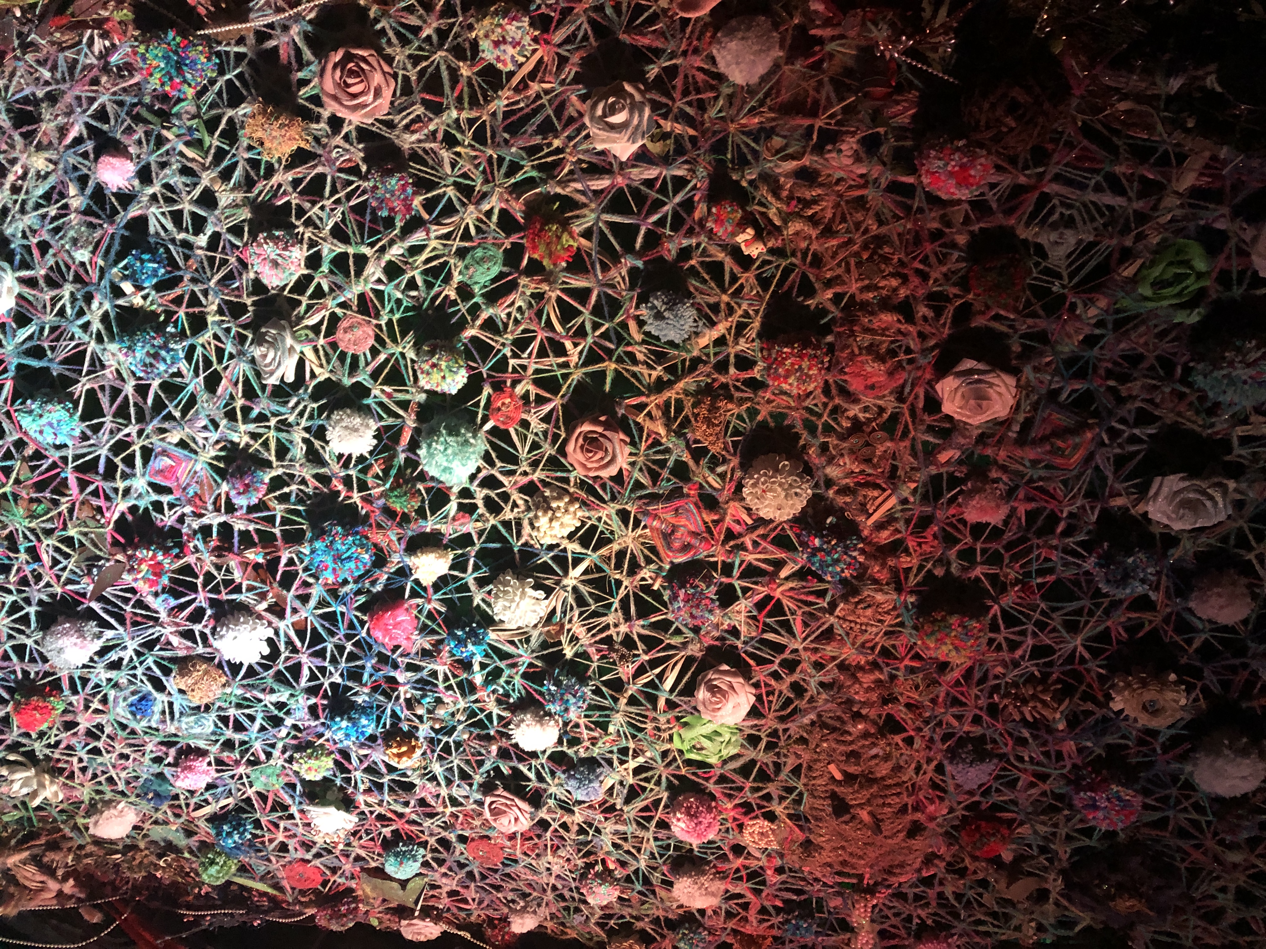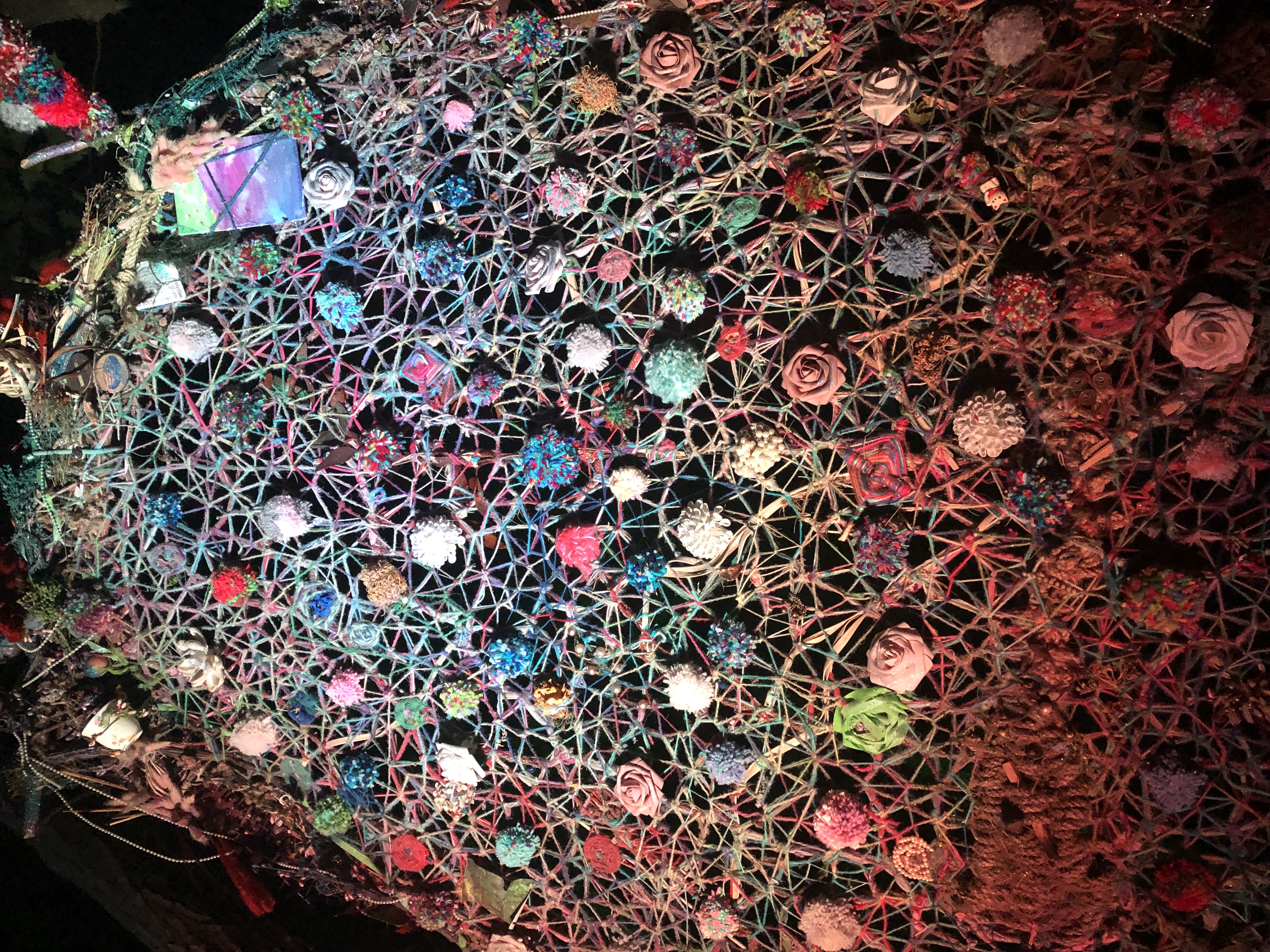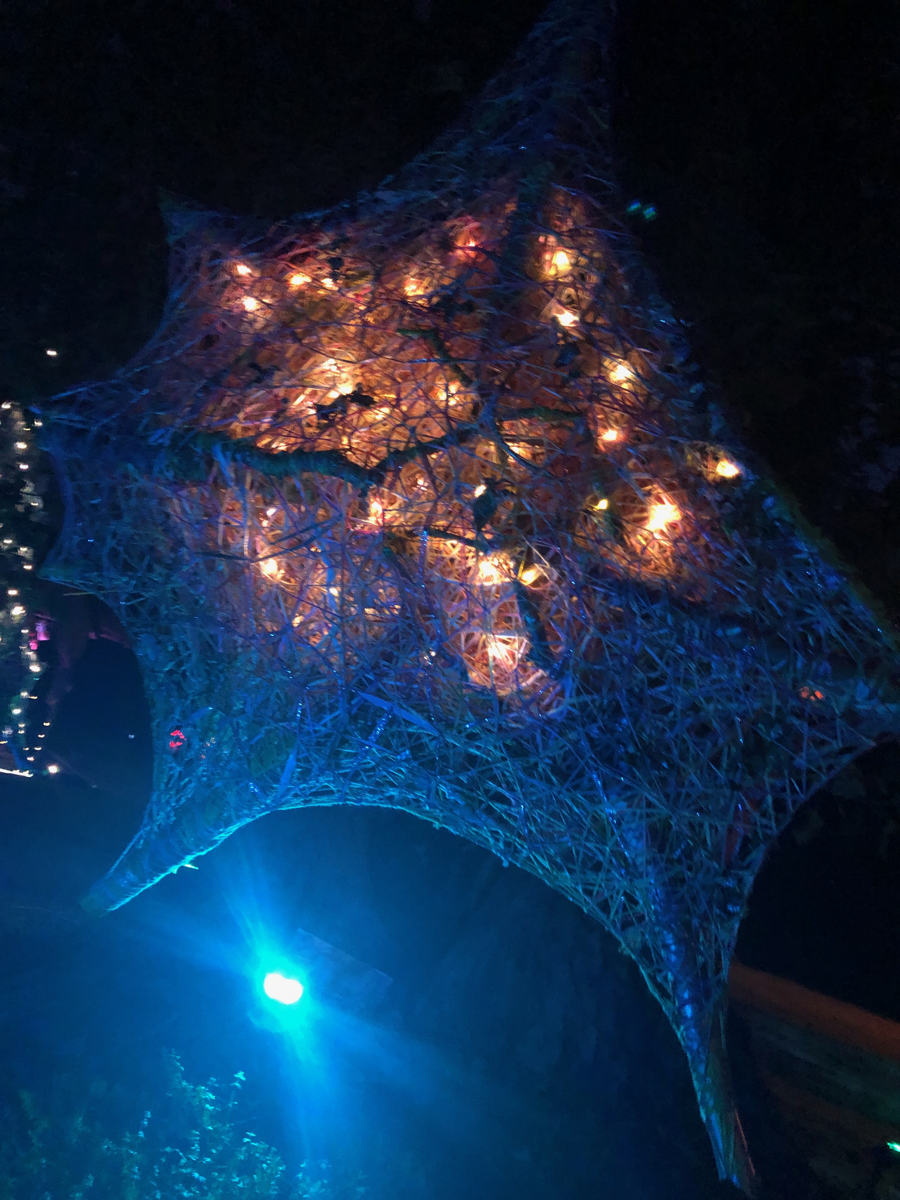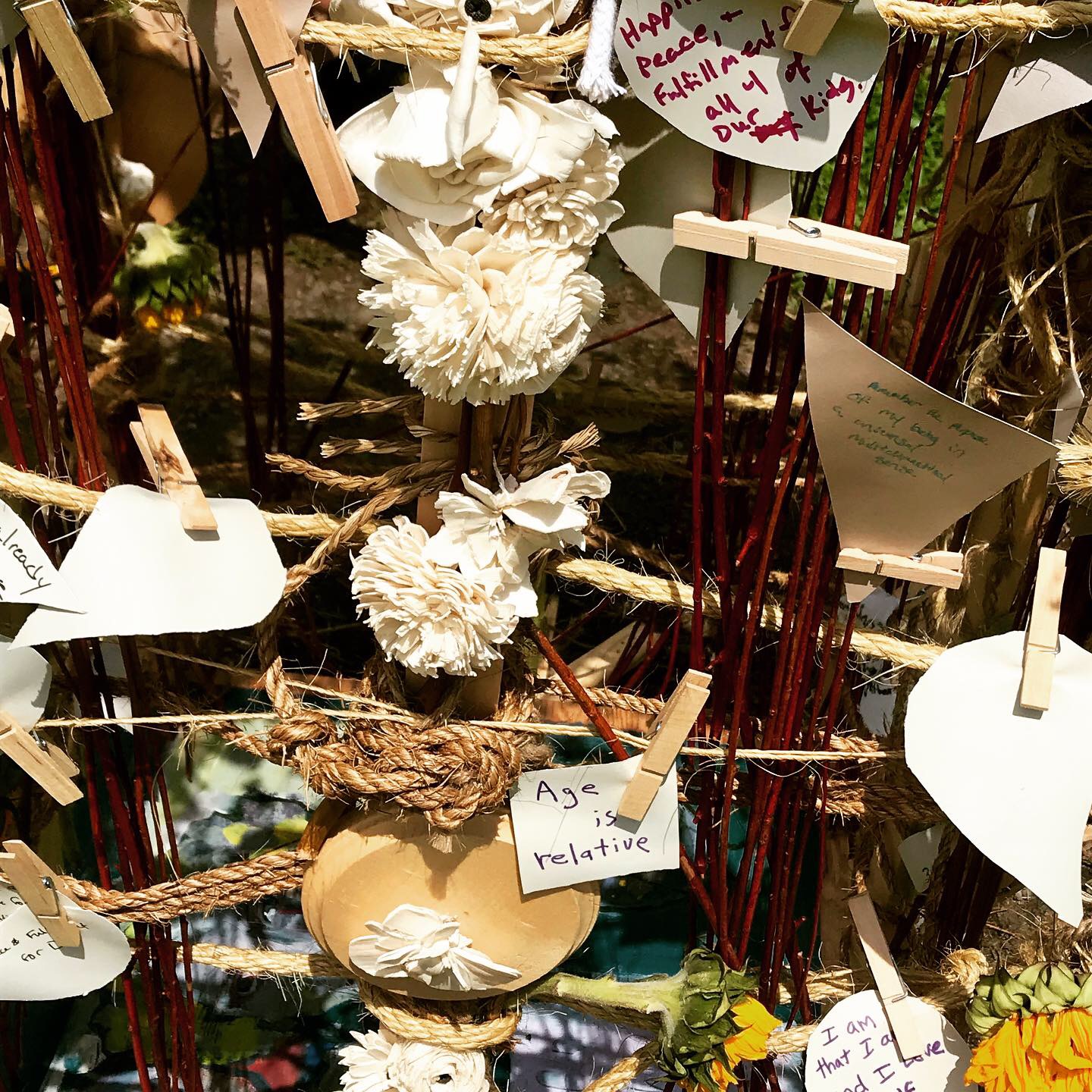 o Voyage of the Maiden: Voyage of the Maiden is a 3 layered five sided structure which creates a sacred space of remembrance and honoring. It is a portal to a liminal space in which memories can be conjured, drawn forth and then released with love. The tripartite form of the piece reflects the maiden/mother/crone cycle of the witch/goddess. It reflects the journey of a mythical heroine as she crosses a threshold into the next phase of her story cycle. The 5 pointed stars within these 3 layers invoke the elements of the universe so that they can guide this voyage toward the true and alighted path.