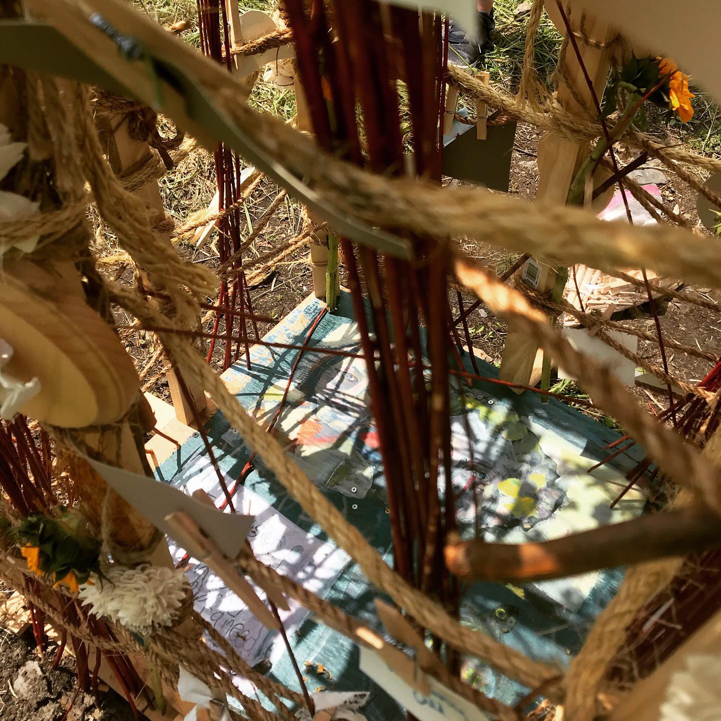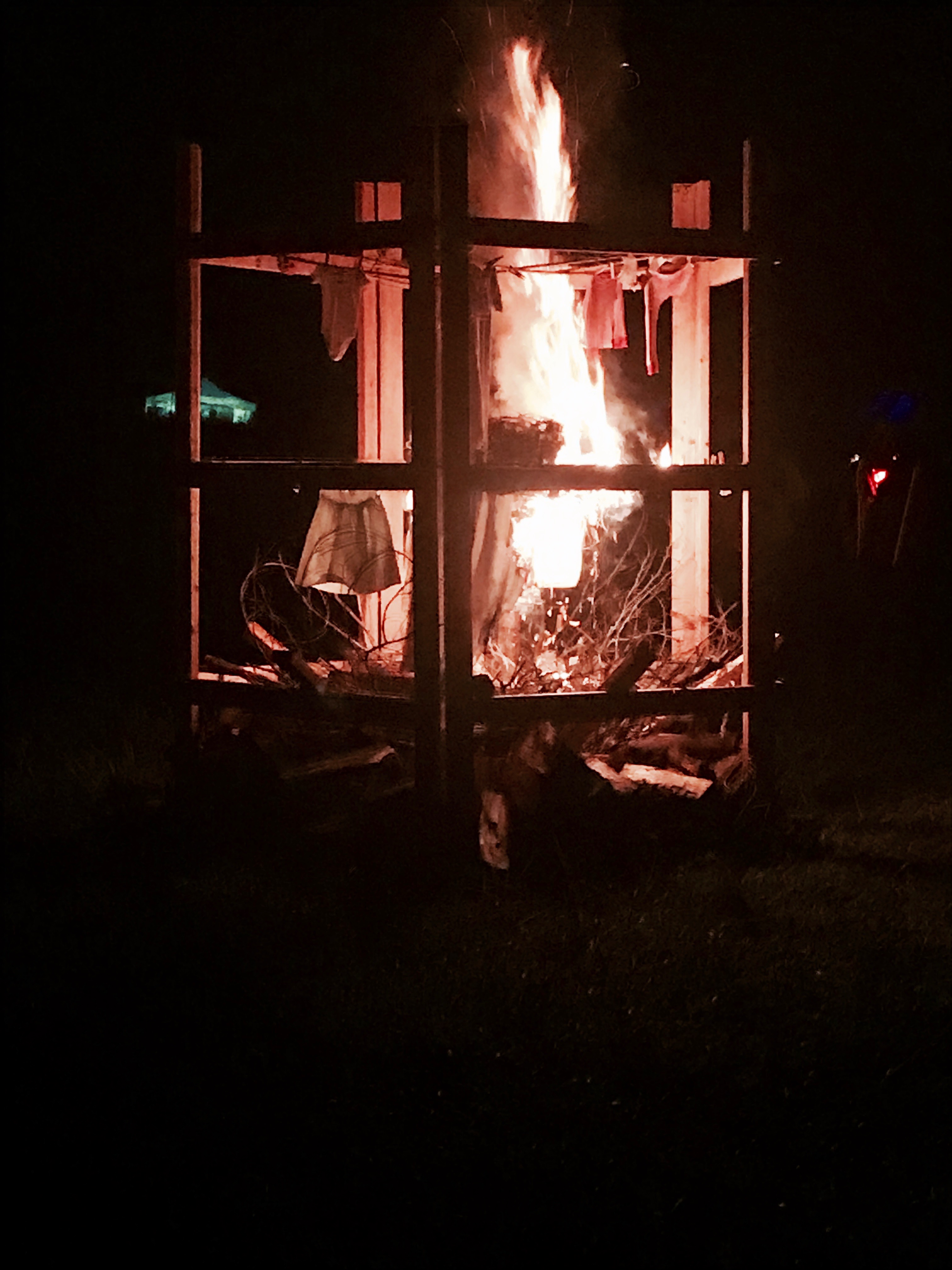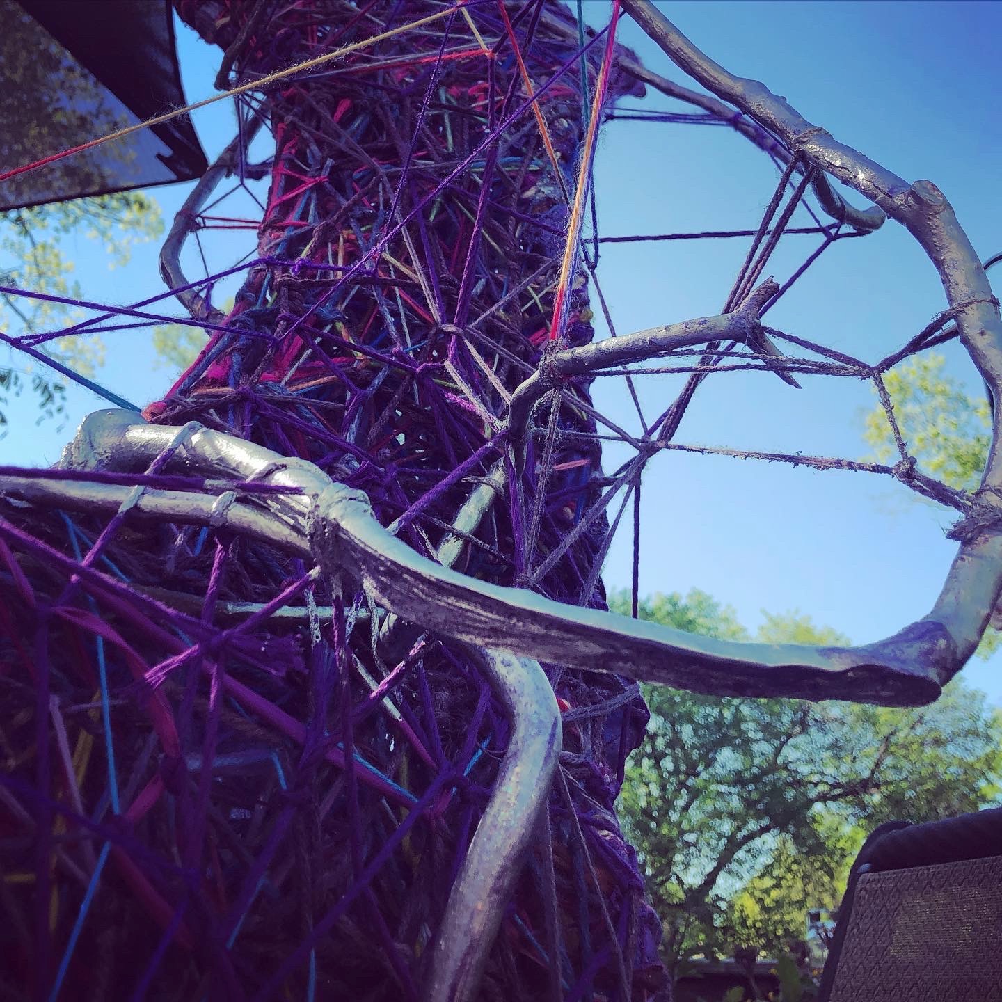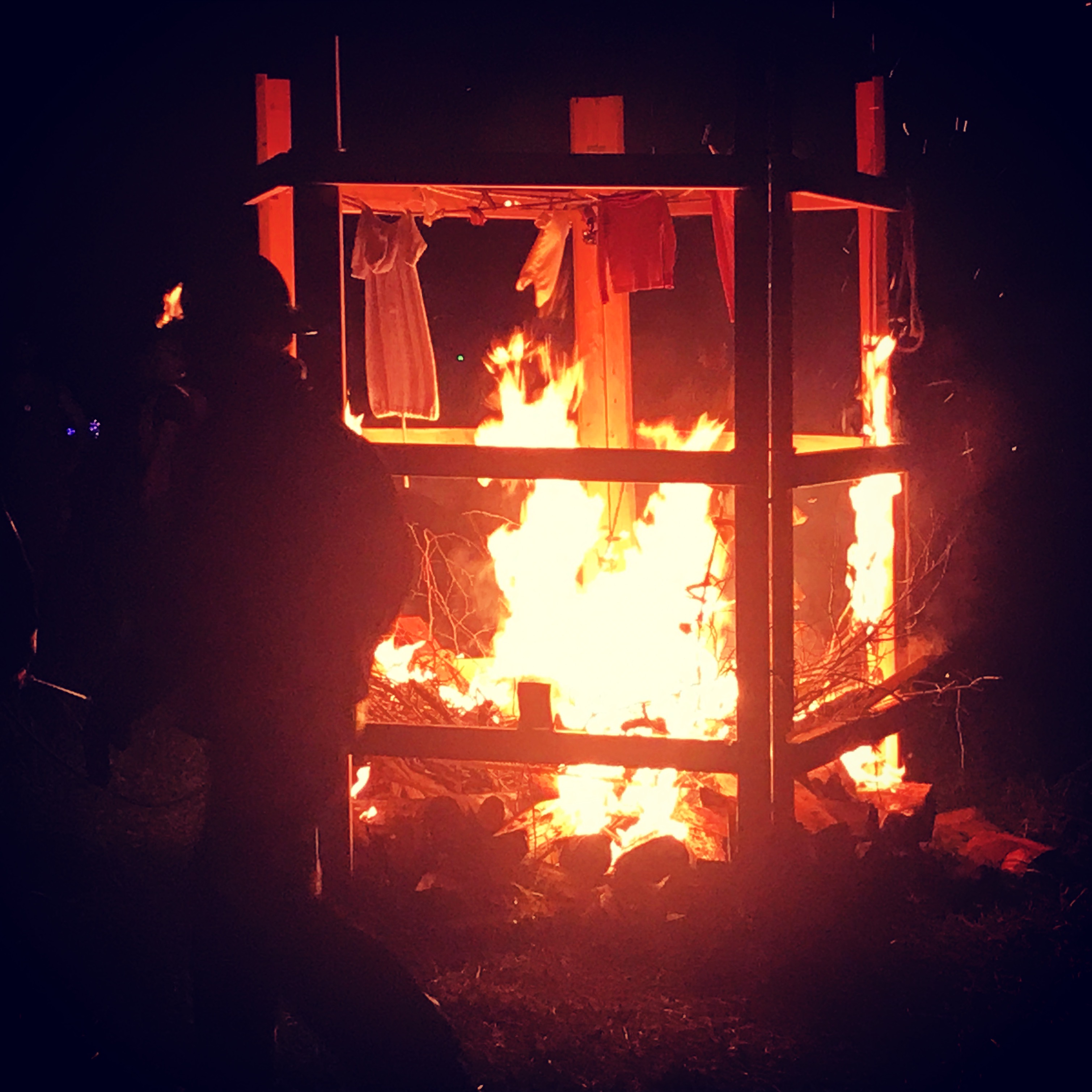 Collaborative “Group Portal Weaving,” installation built and burned at three separate events.